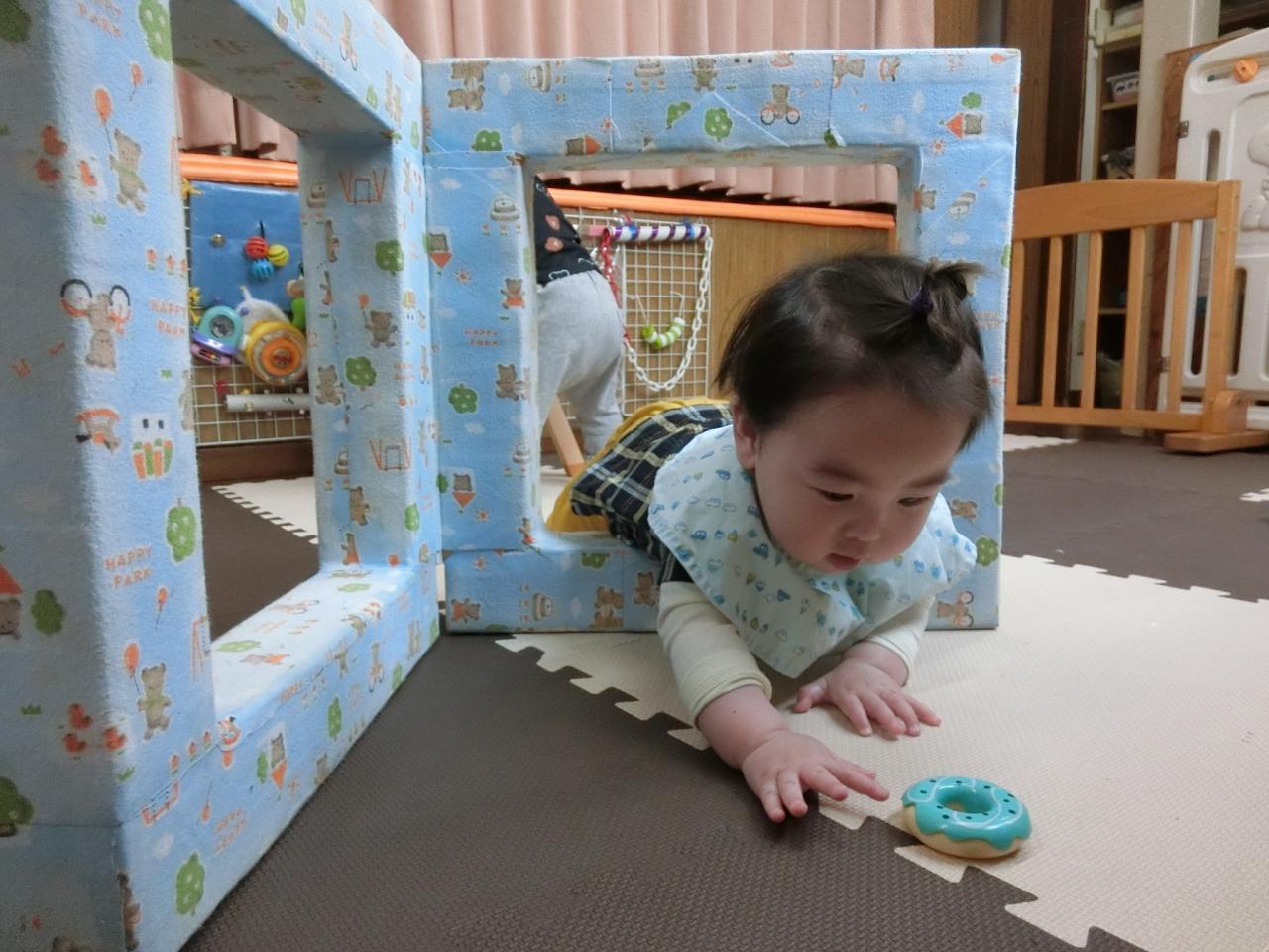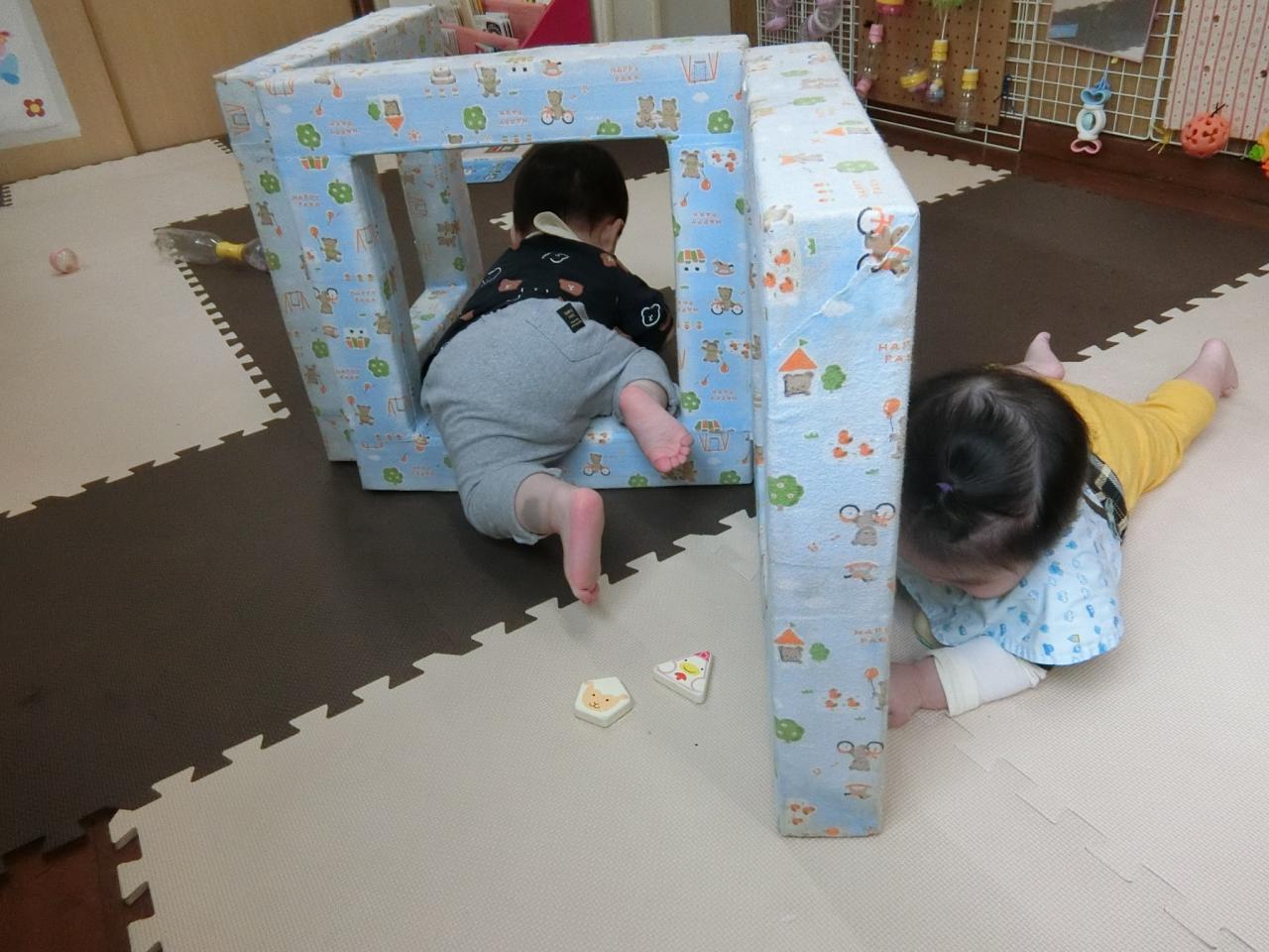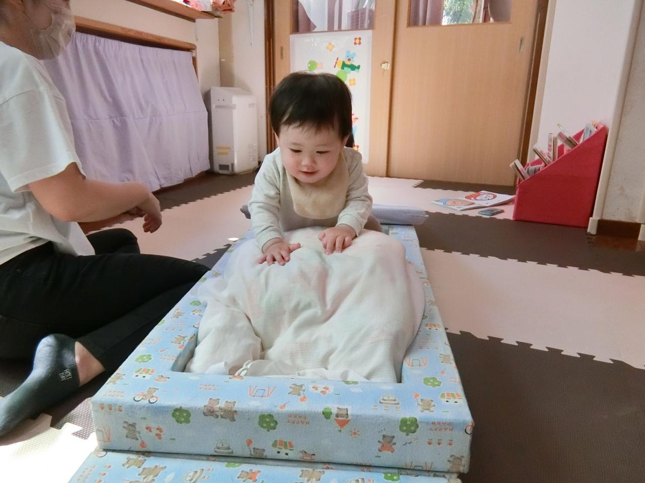 ひよこ組(0歳児)はハイハイやつかまり立ちの子どもが多いので、お部屋で遊ぶ機会も多いです。お部屋でも身体を動かして遊べるように色々な遊びを工夫しています。
