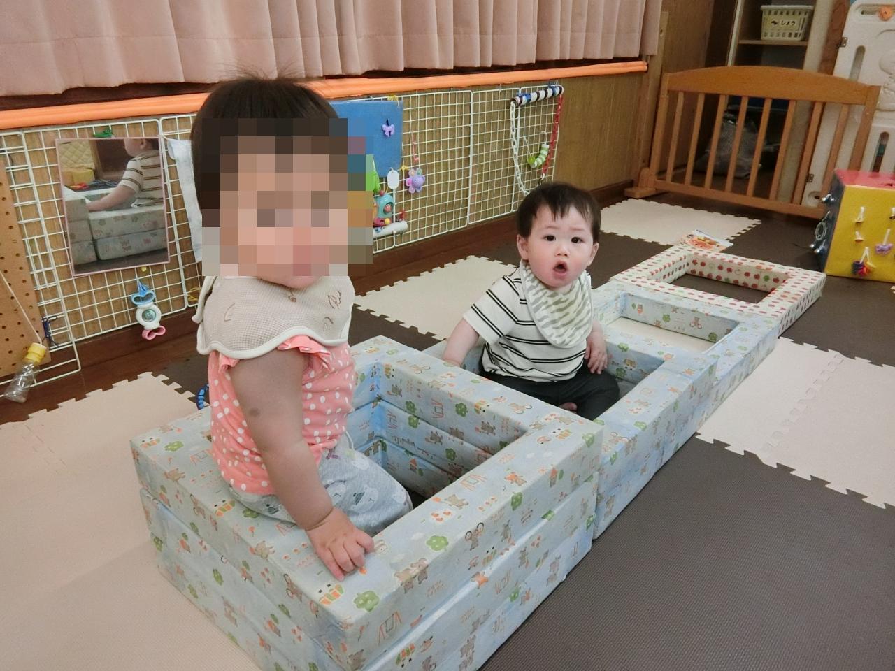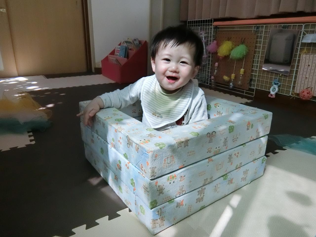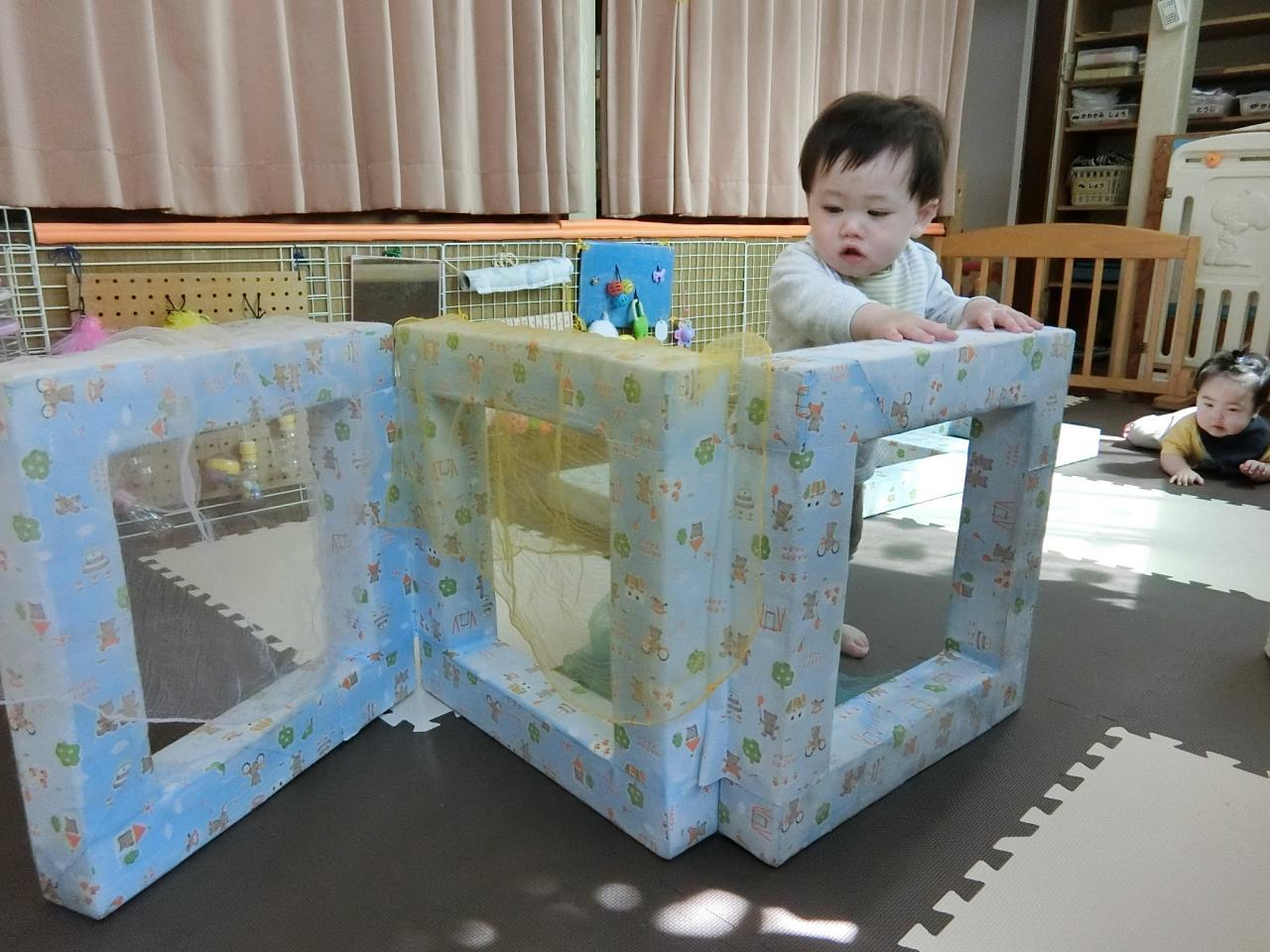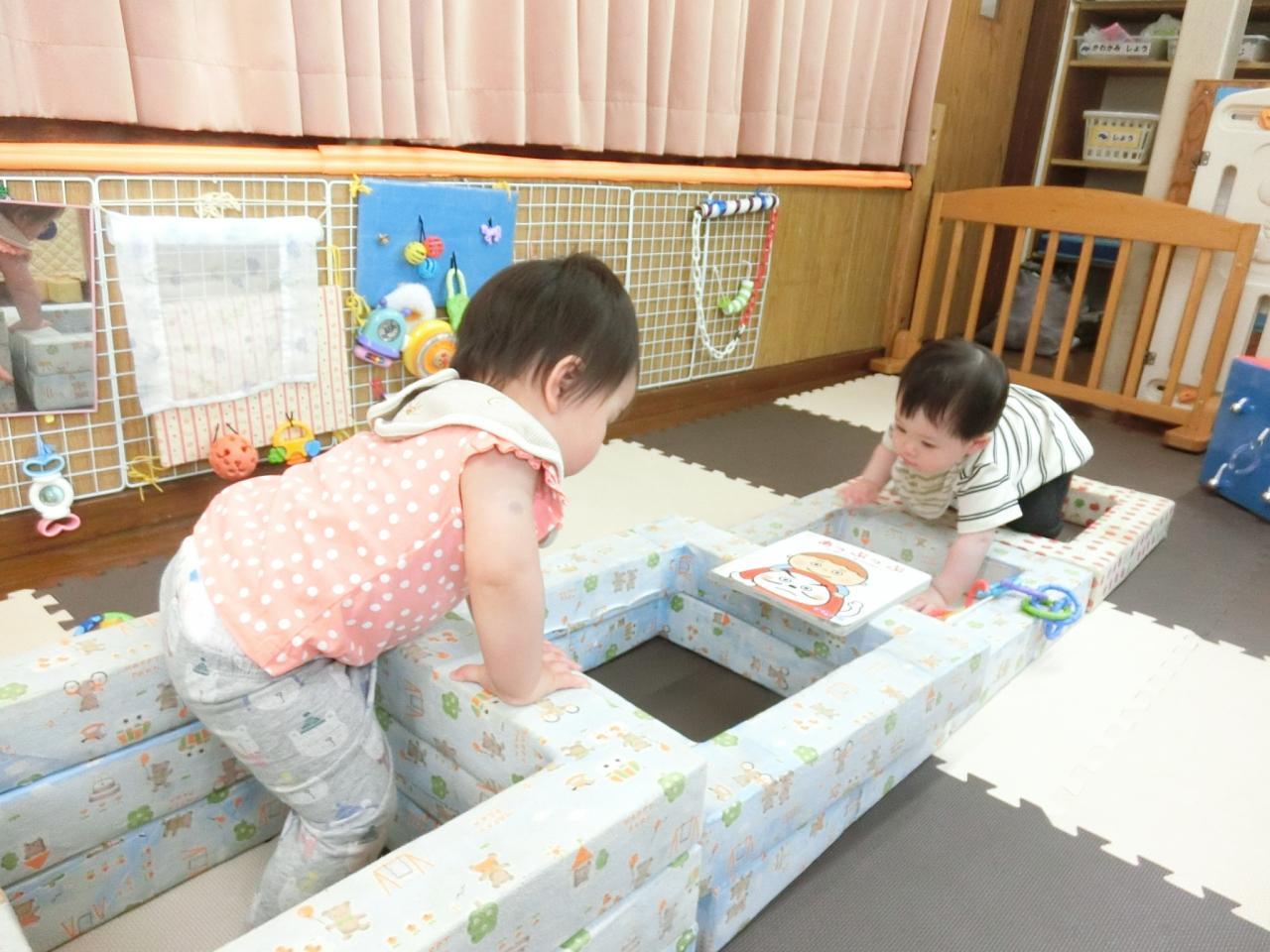 ひよこ組(0歳児)はハイハイやつかまり立ちの子どもが多いので、お部屋で遊ぶ機会も多いです。お部屋でも身体を動かして遊べるように色々な遊びを工夫しています。