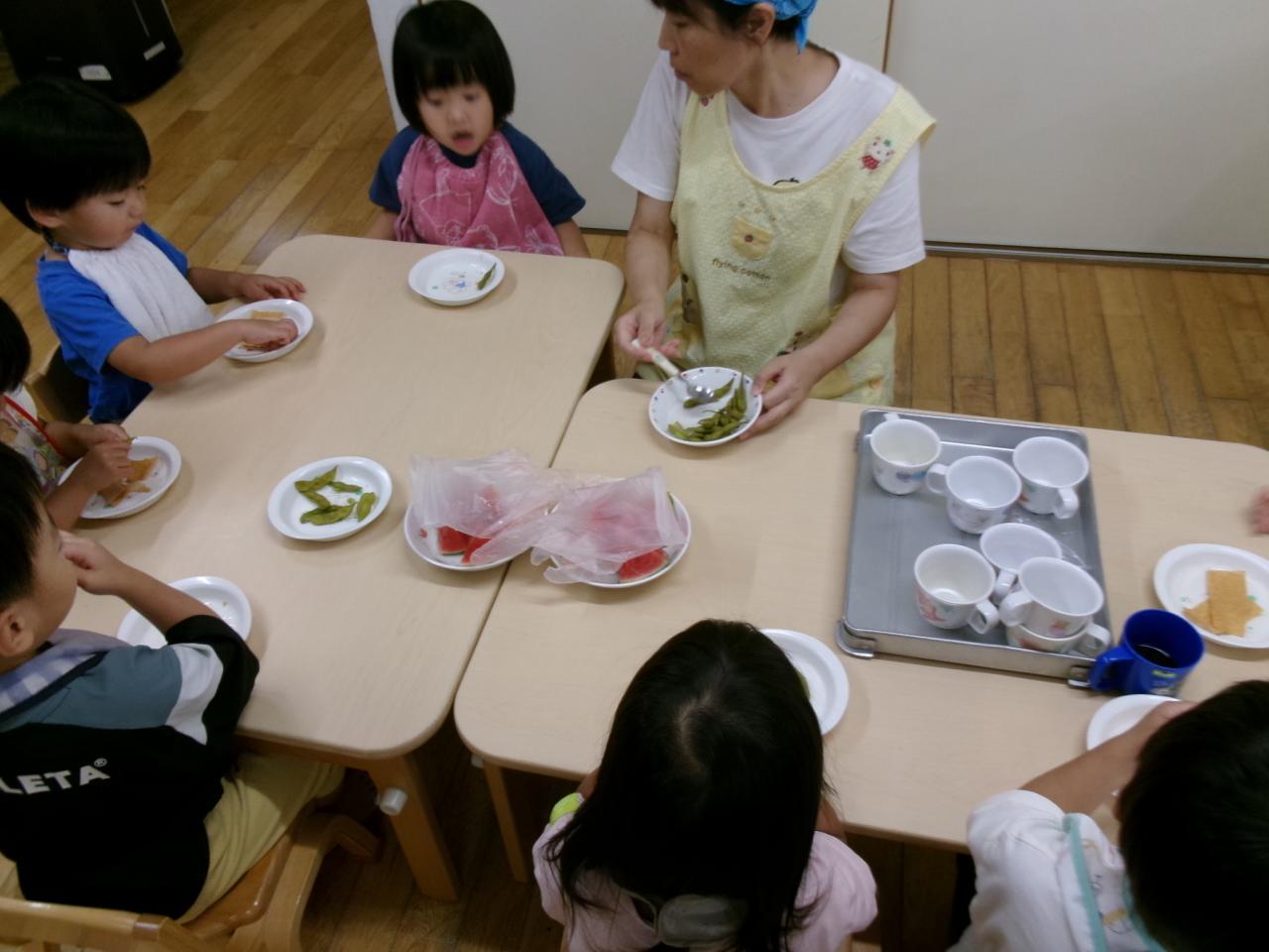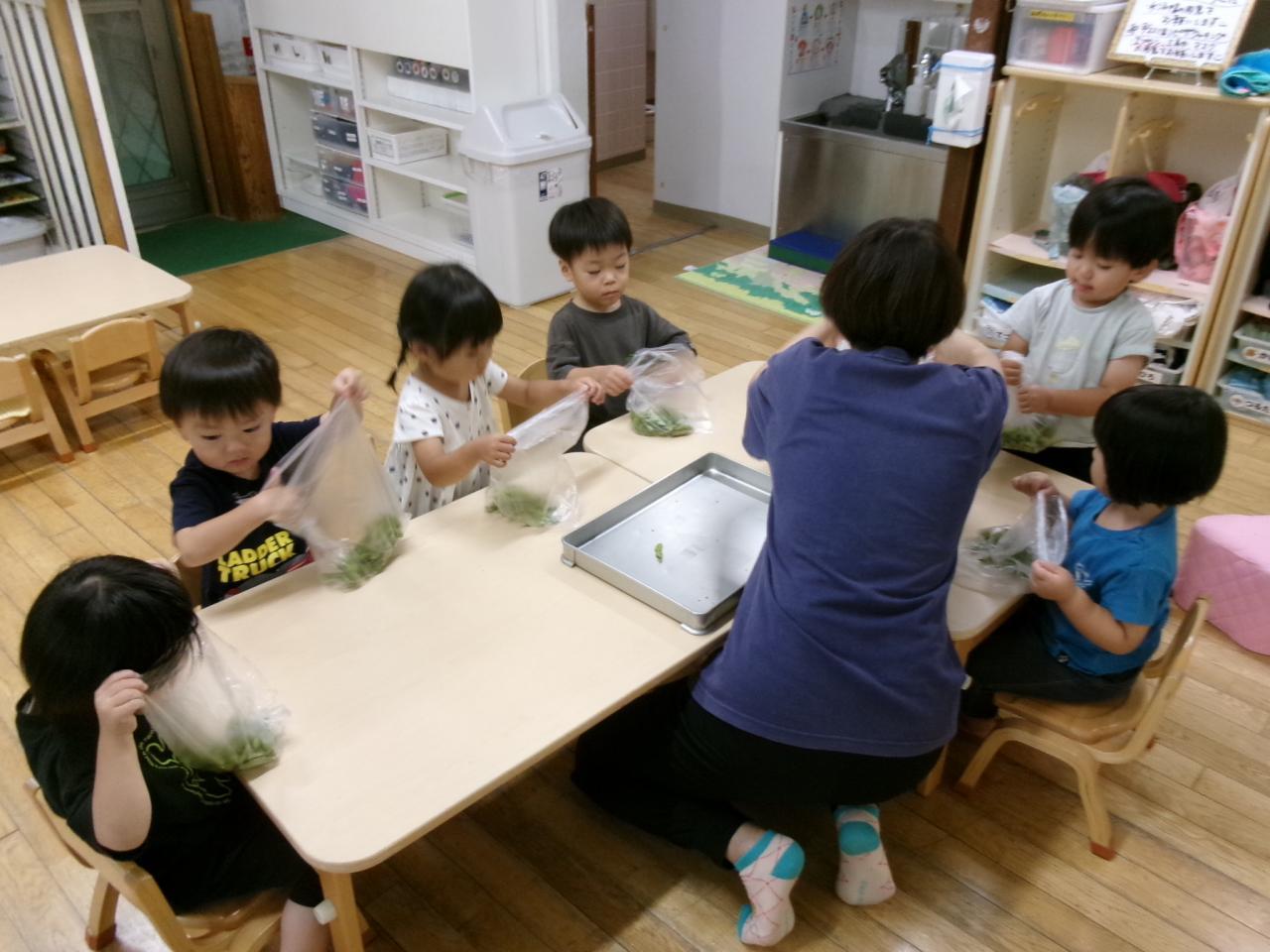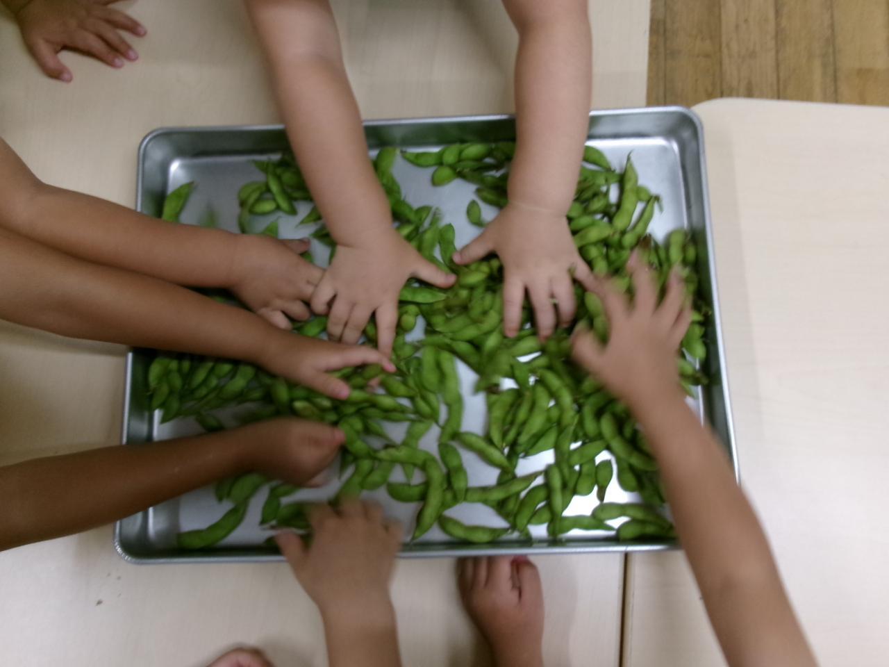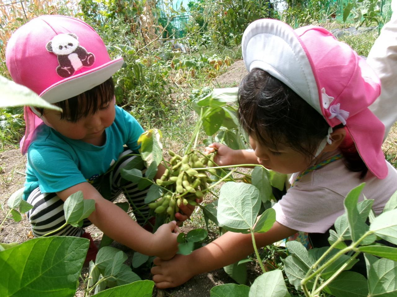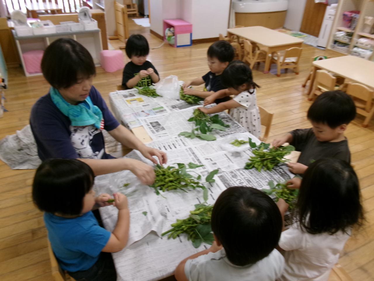 翌日みんなで枝豆を枝からとりました。真ん中でちぎってしまい「破れちゃった」と心配そうにする可愛い一幕も!