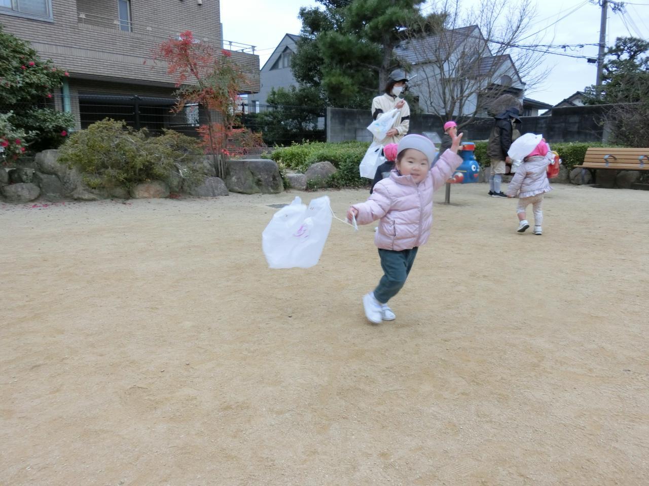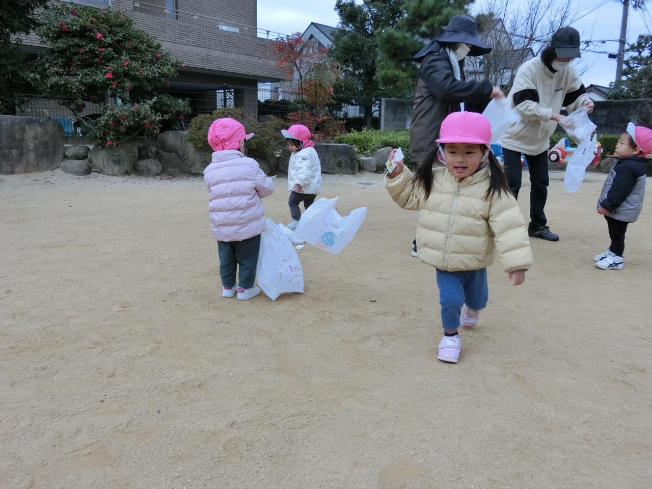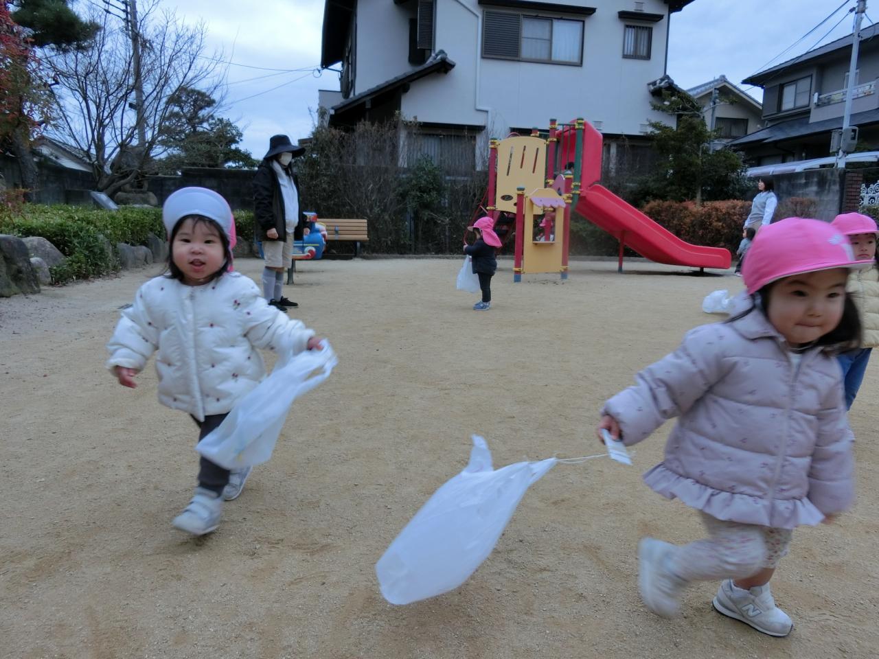 みんな、しっかりと手に持って走って楽しんでいますよ。寒い日が続きますがお外でたくさん身体も動かしてポカポカです!!