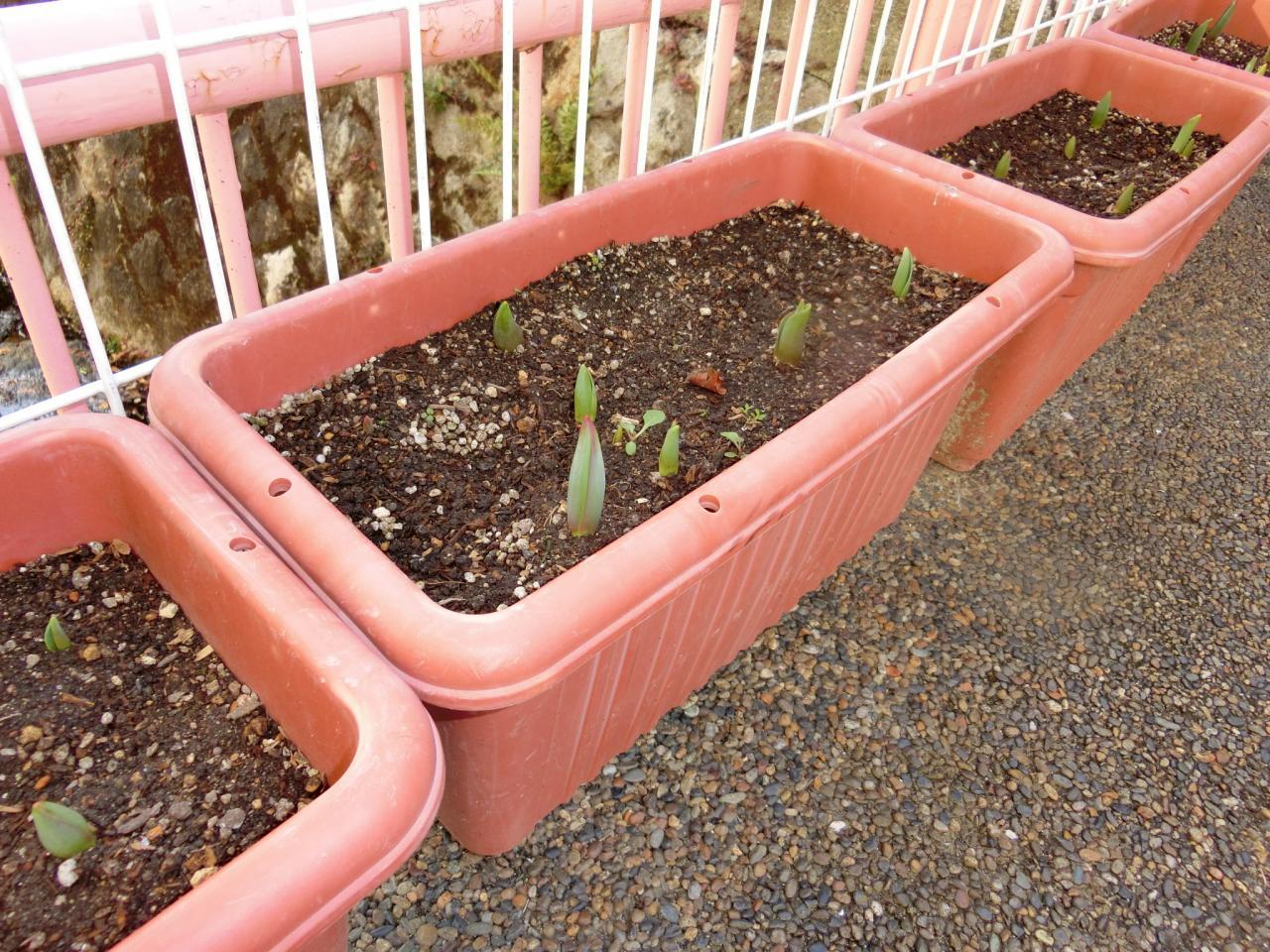 あひるさんが植えたチューリップの球根から芽がでてきましたよ。毎日水やりをしてくれています。
