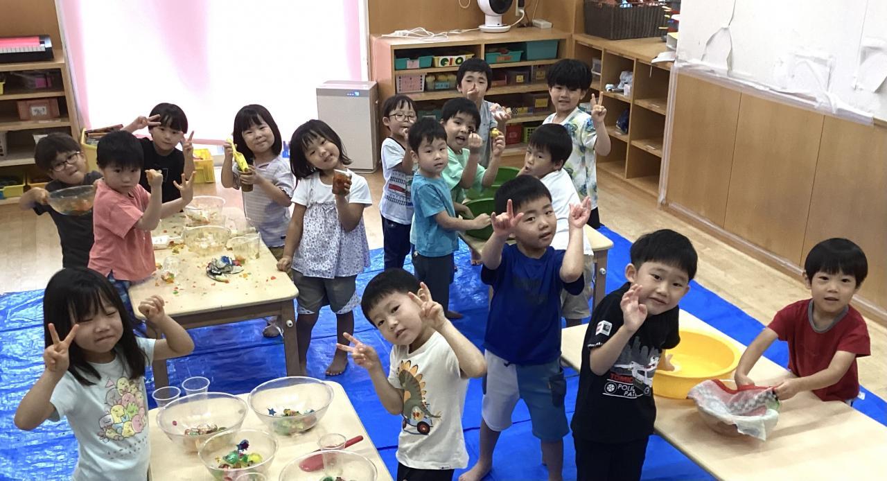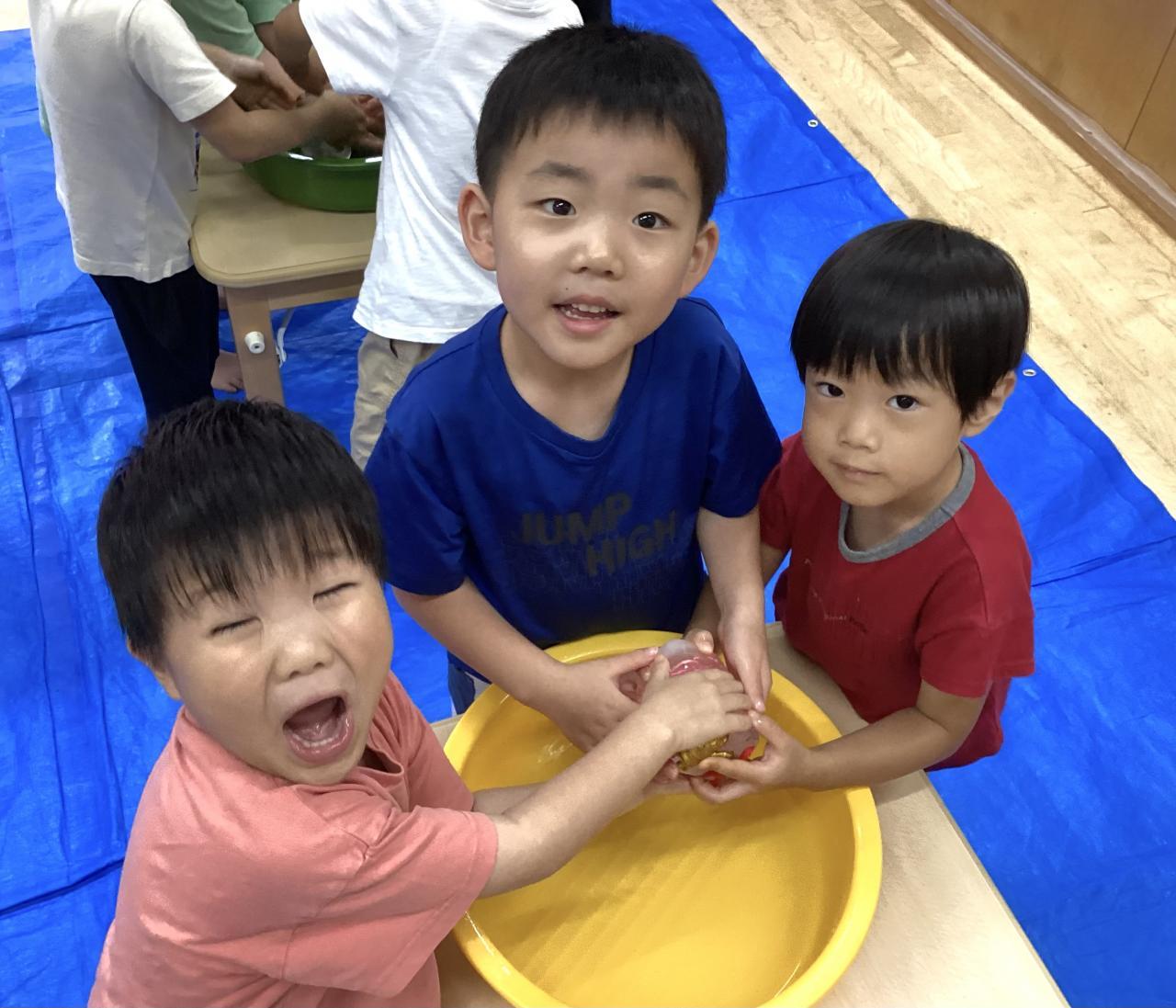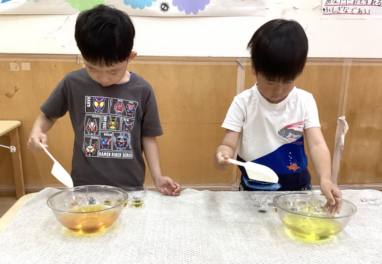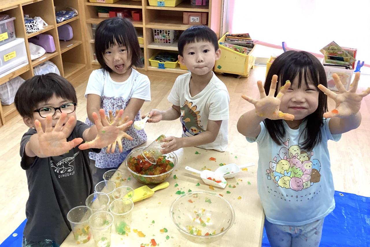 手やテーブルが寒天まみれになったり、溶けた水がこぼれたりとハプニングもありましたが、とっても楽しんでいた子どもたちでした☺︎