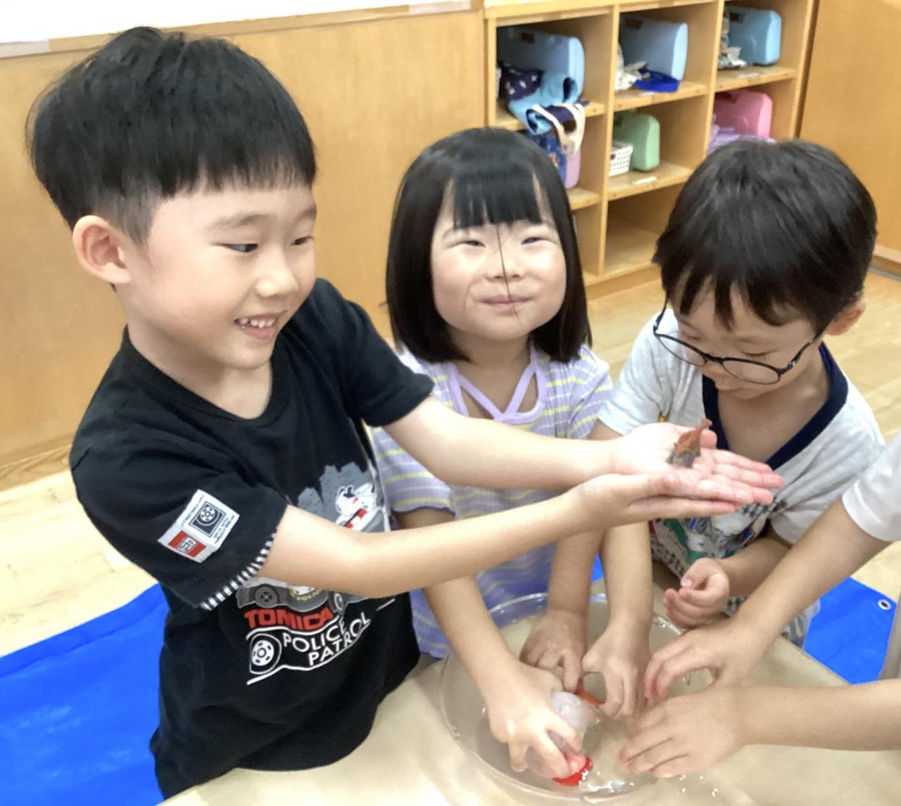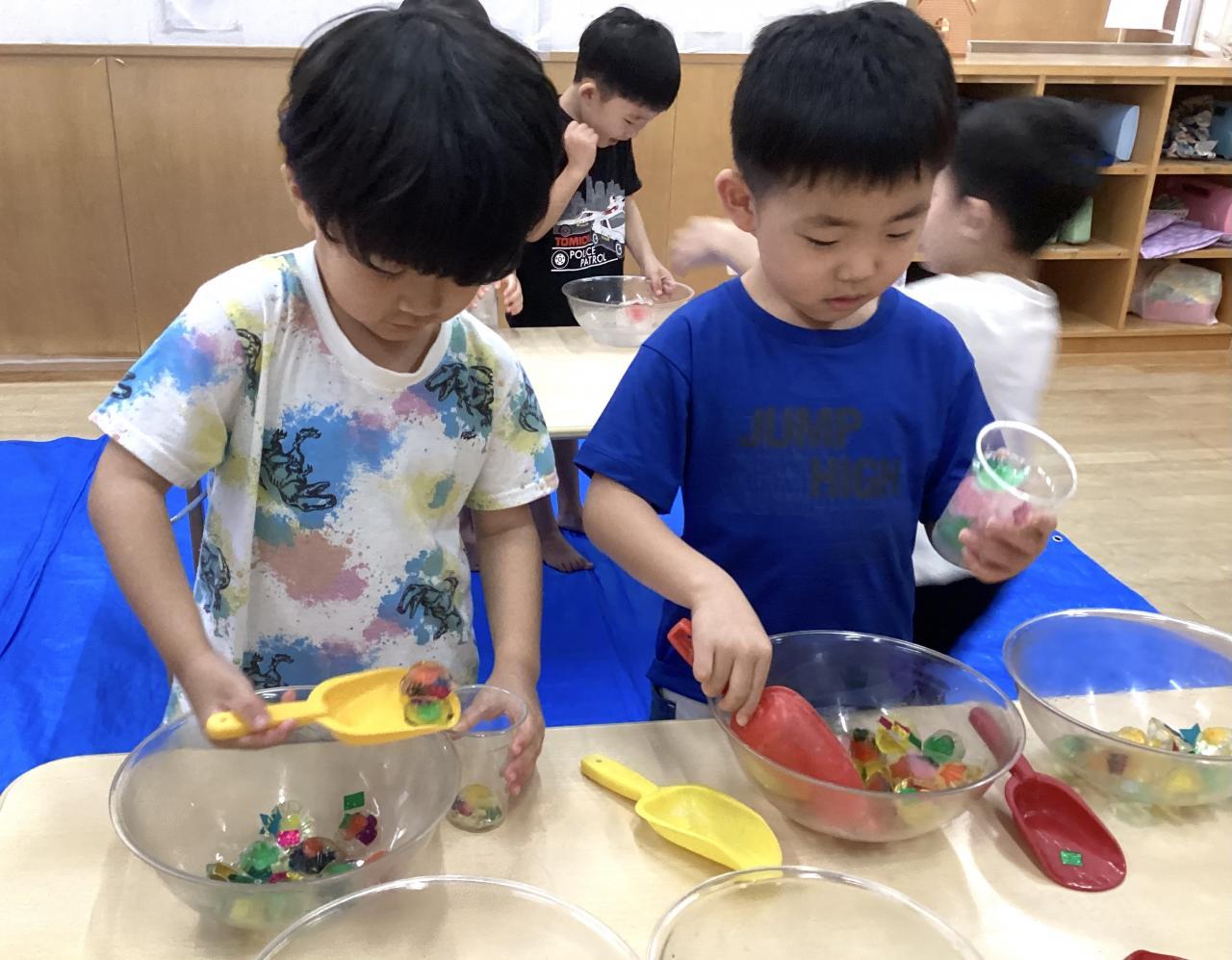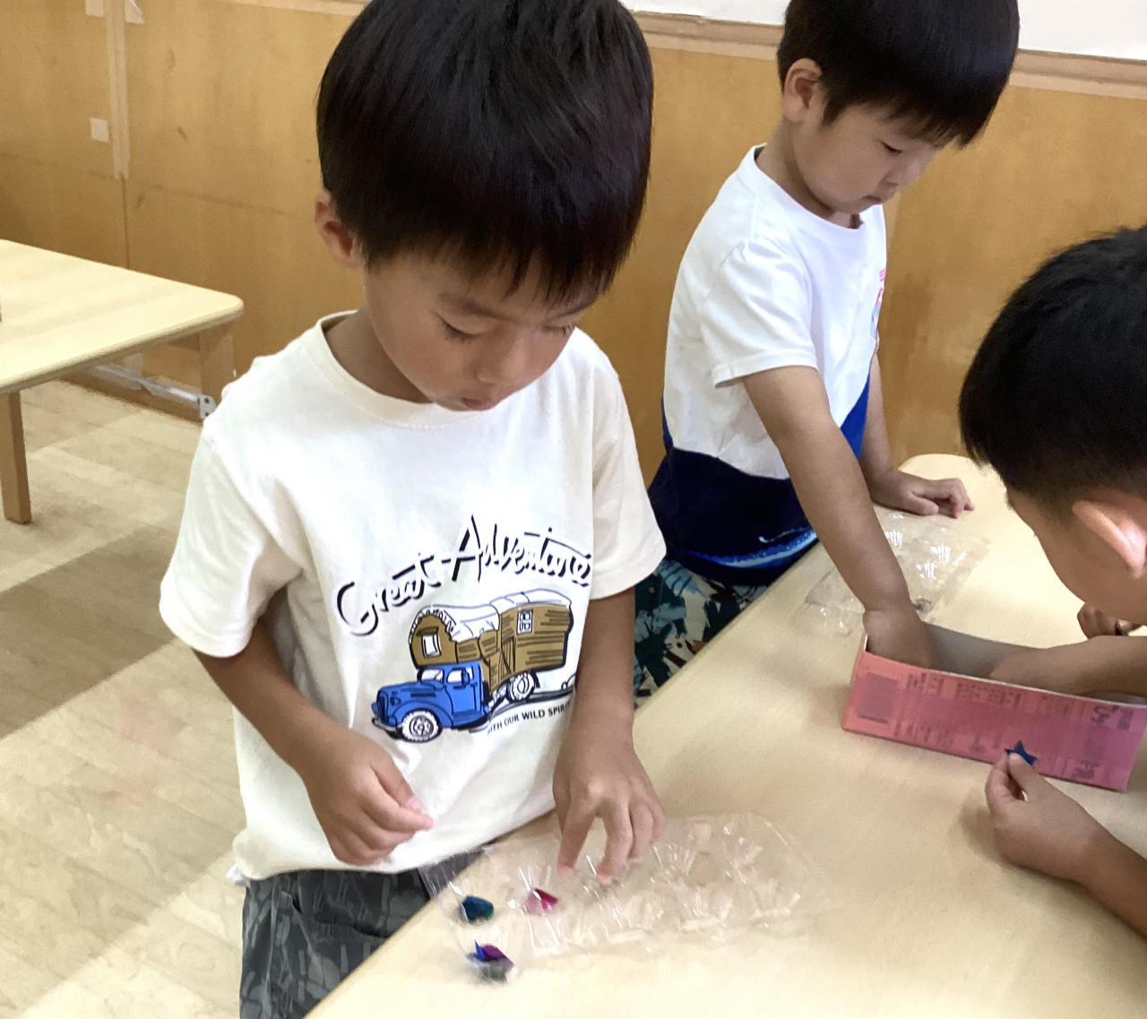 手やテーブルが寒天まみれになったり、溶けた水がこぼれたりとハプニングもありましたが、とっても楽しんでいた子どもたちでした☺︎