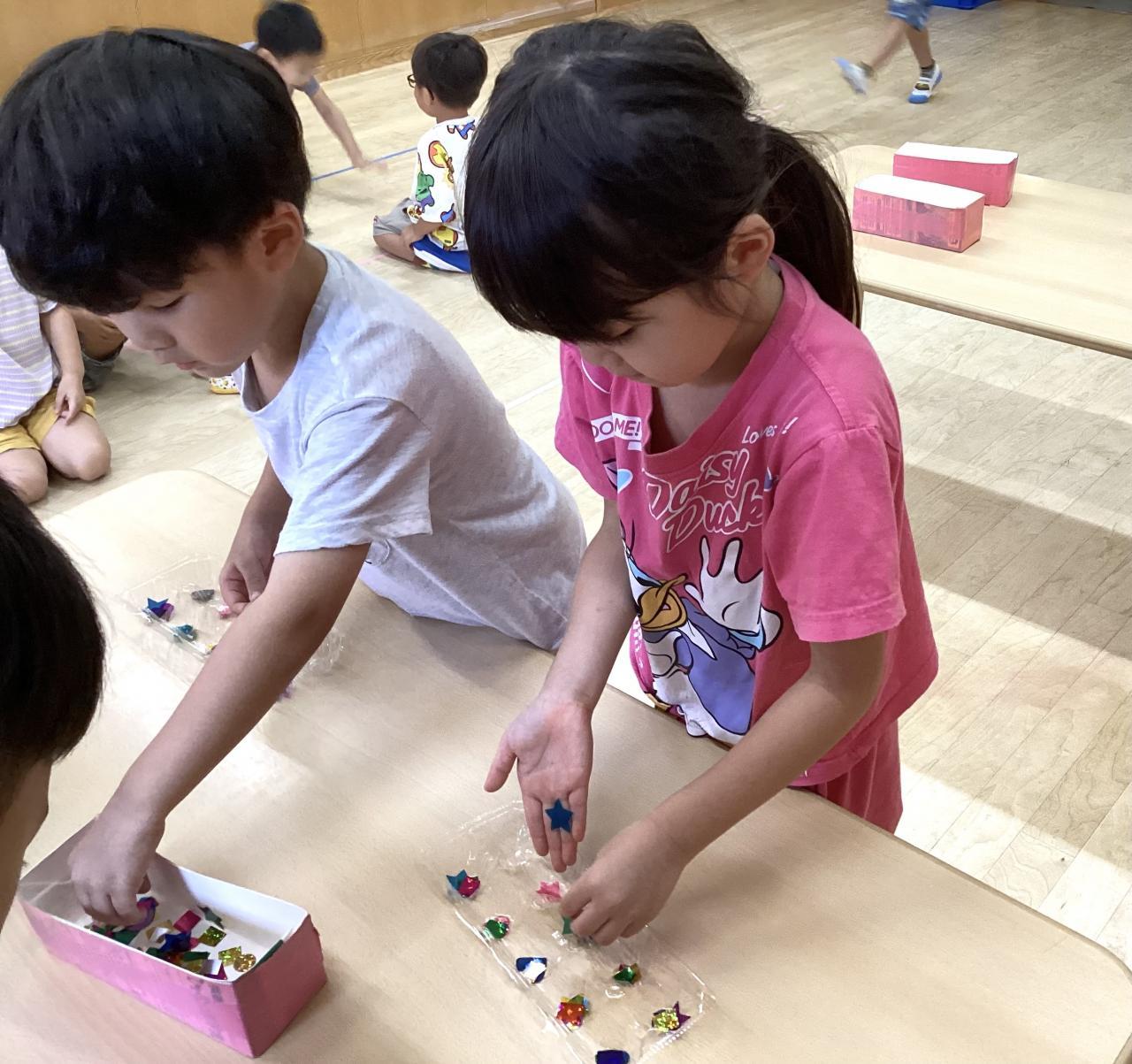 卵パックにキラキラシールなどの飾りと色水を入れたり、牛乳パックに水とおもちゃを入れて氷作りをすると、氷になるのを楽しみにしていた子どもたち。