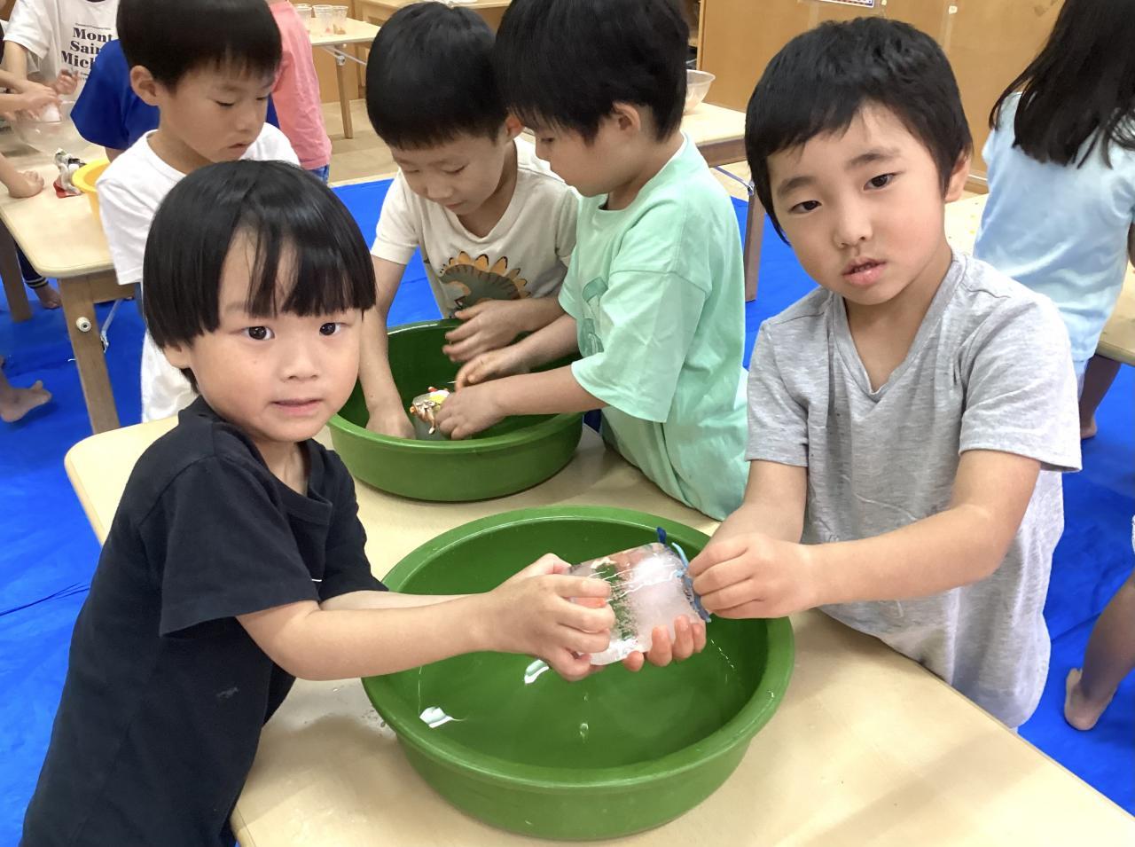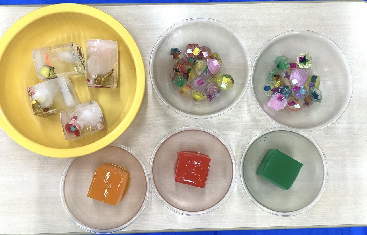 キラキラの氷をカップに入れてジュースを作って楽しんだり、大きな氷はお友だちと一緒に溶かしておもちゃが出てくると大喜びでした。