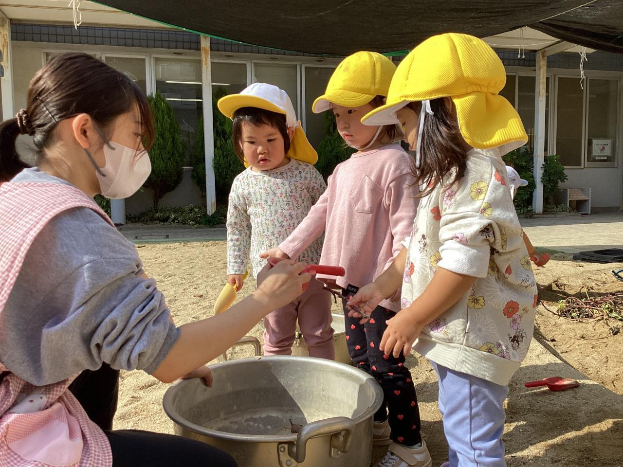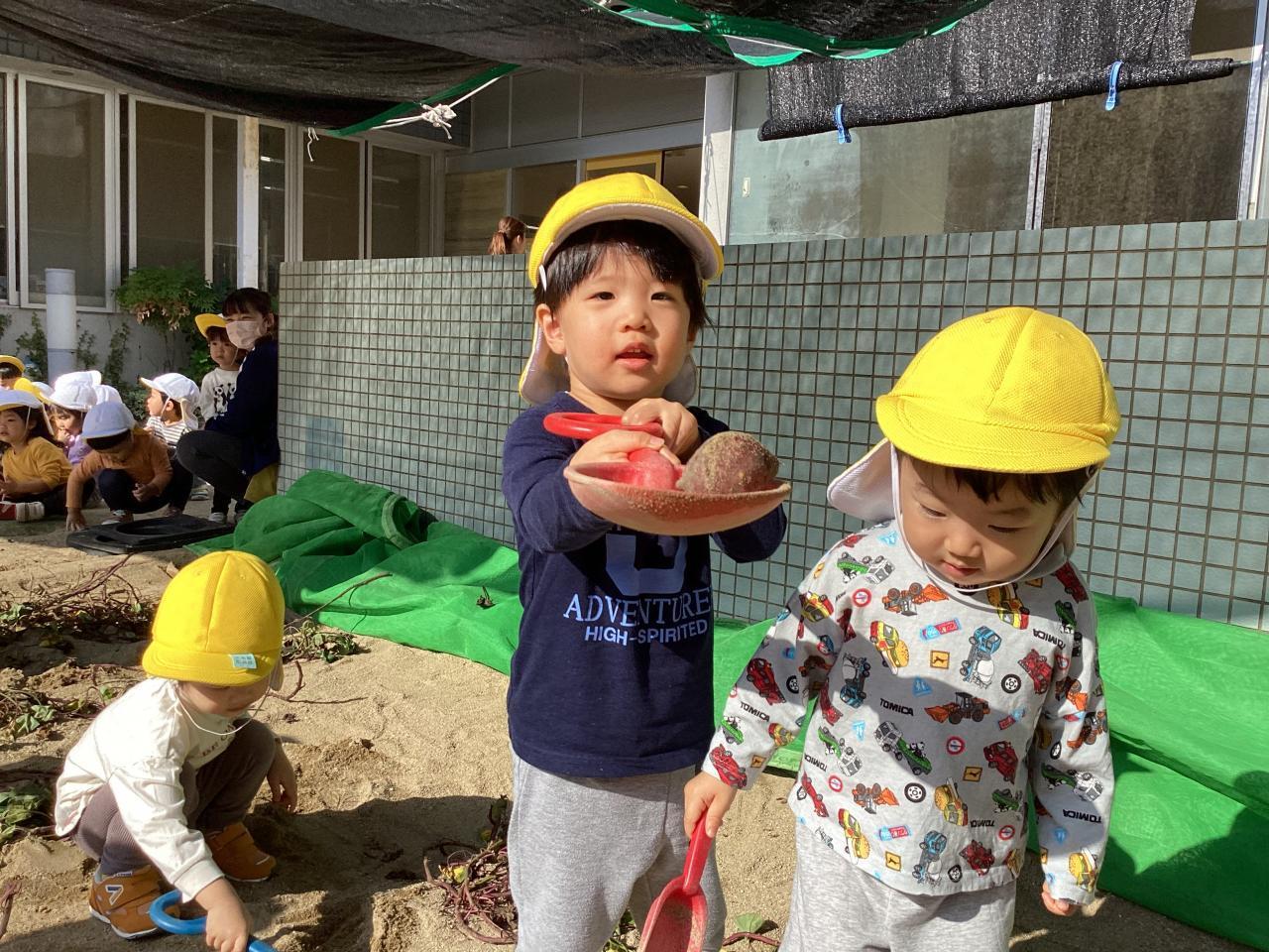 幼児クラスでとってきた小さいさつまいもをお裾分けしてもらい、園庭の砂場に埋めて、子どもたちに掘ってもらいました。