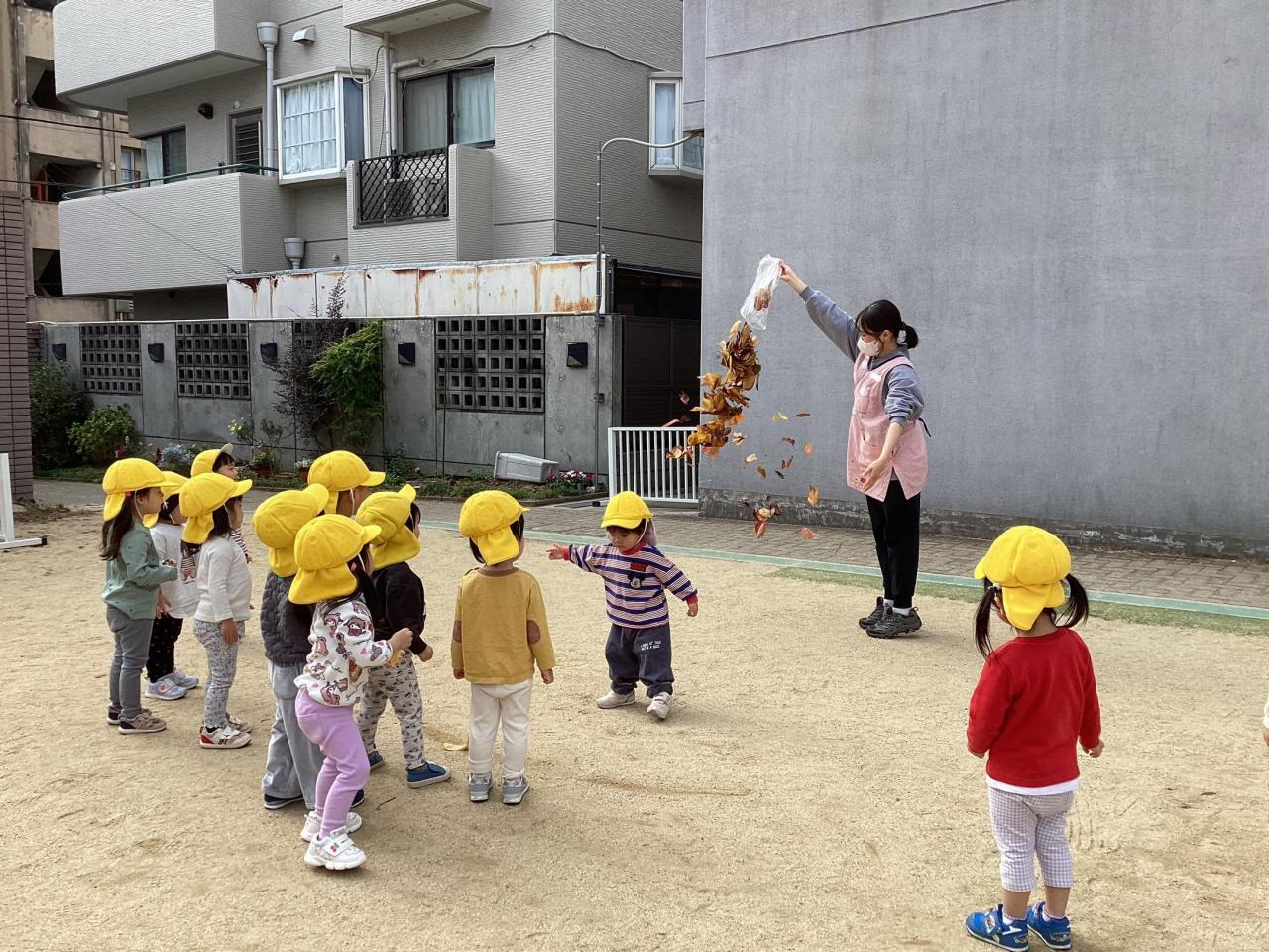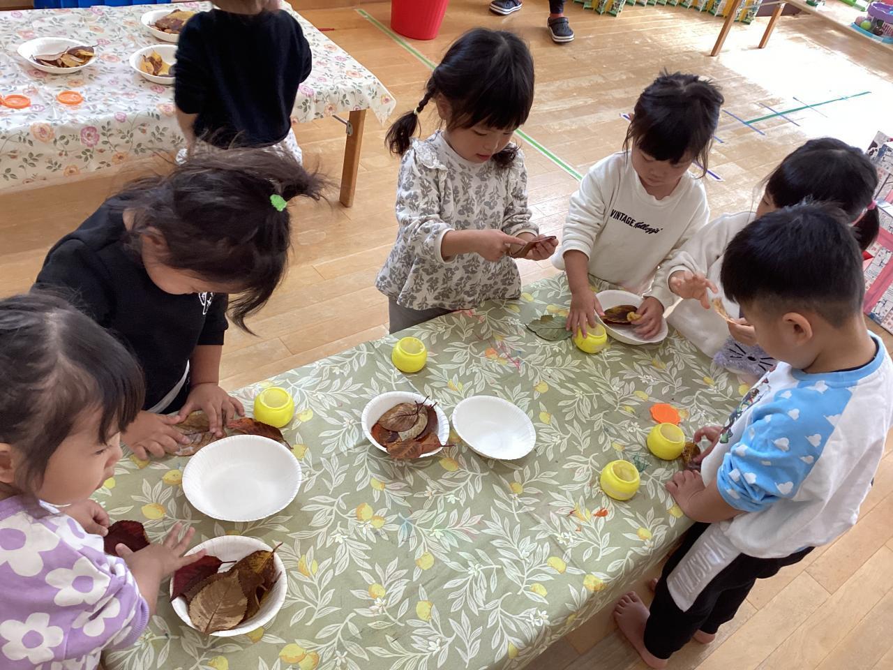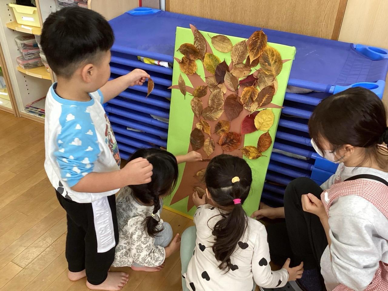 のりをつけている間に、落ち葉の形や色の違いに気付いて、「ギザギザしてるねー!」「このはっぱ赤色!」などお友だちや保育士とお話ししていました。