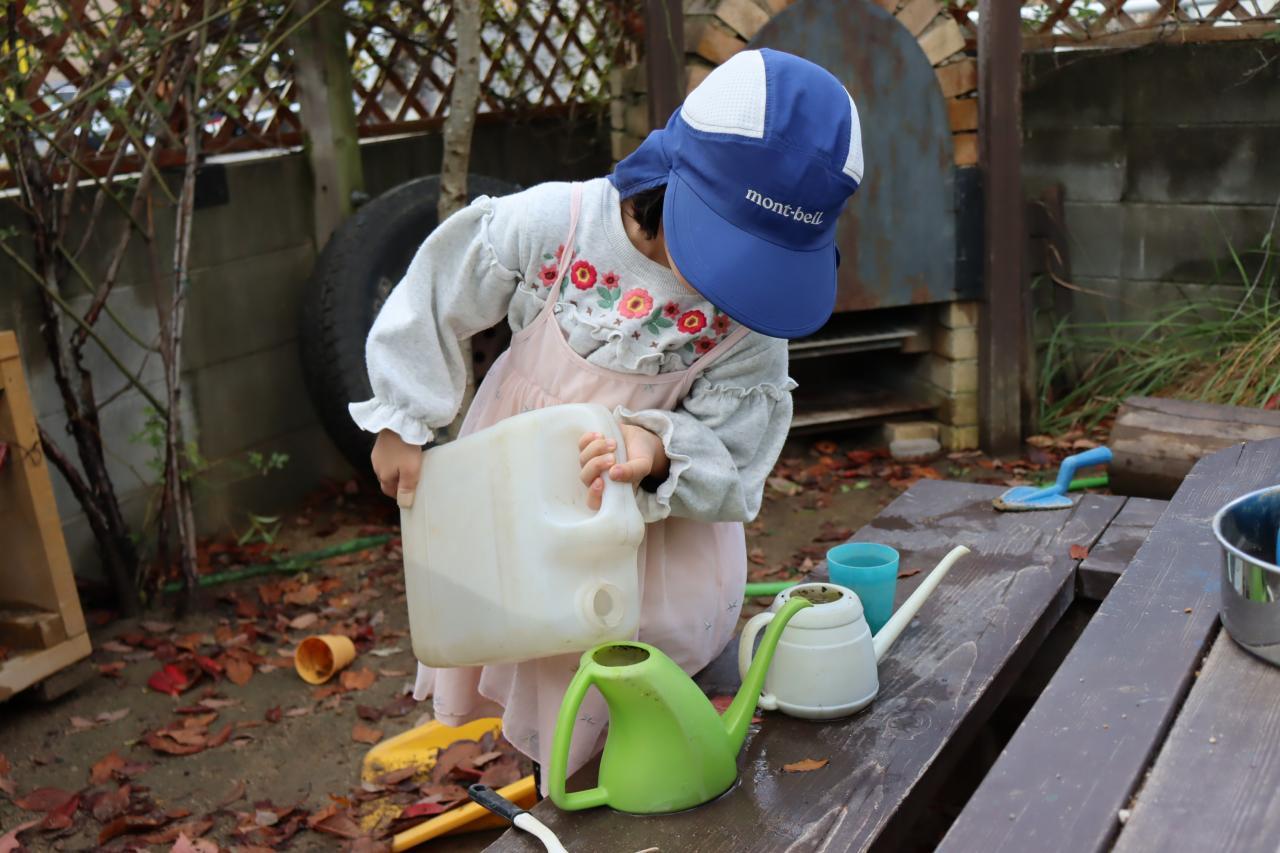 雨上がりの園庭は、大きな水たまりができていて、やっぱり今日も水を使った遊びが始まっていました(^^)
