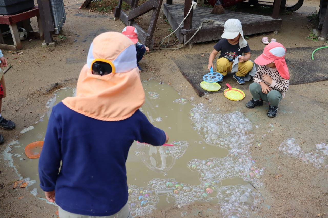こちらは、池のような大きい水たまりを、シャボン玉の泡でいっぱいにしようと頑張っています☆
