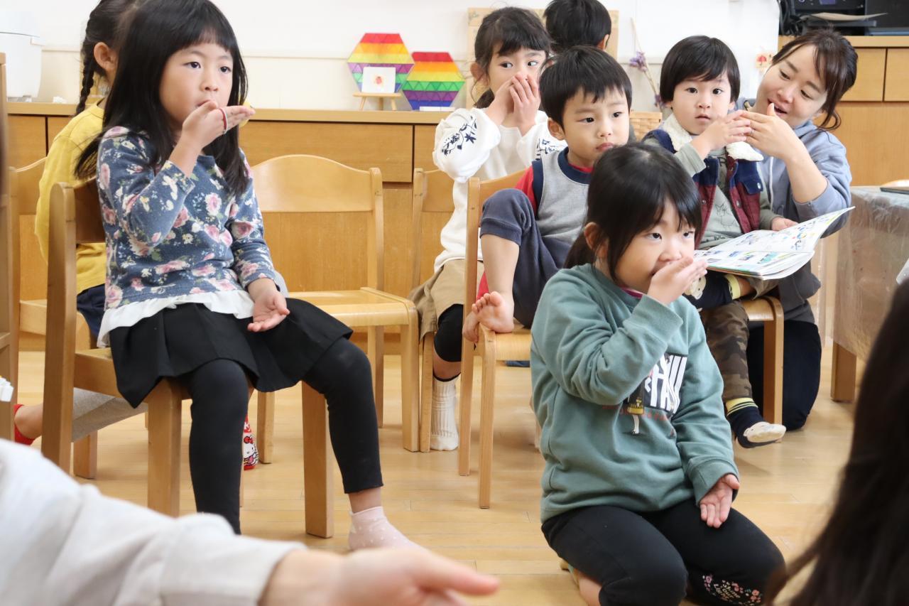 シャケやマグロや卵焼きなど、子どもたちが焼いて食べたいものに言葉を替えながらわらべうたを楽しみました(^^)/