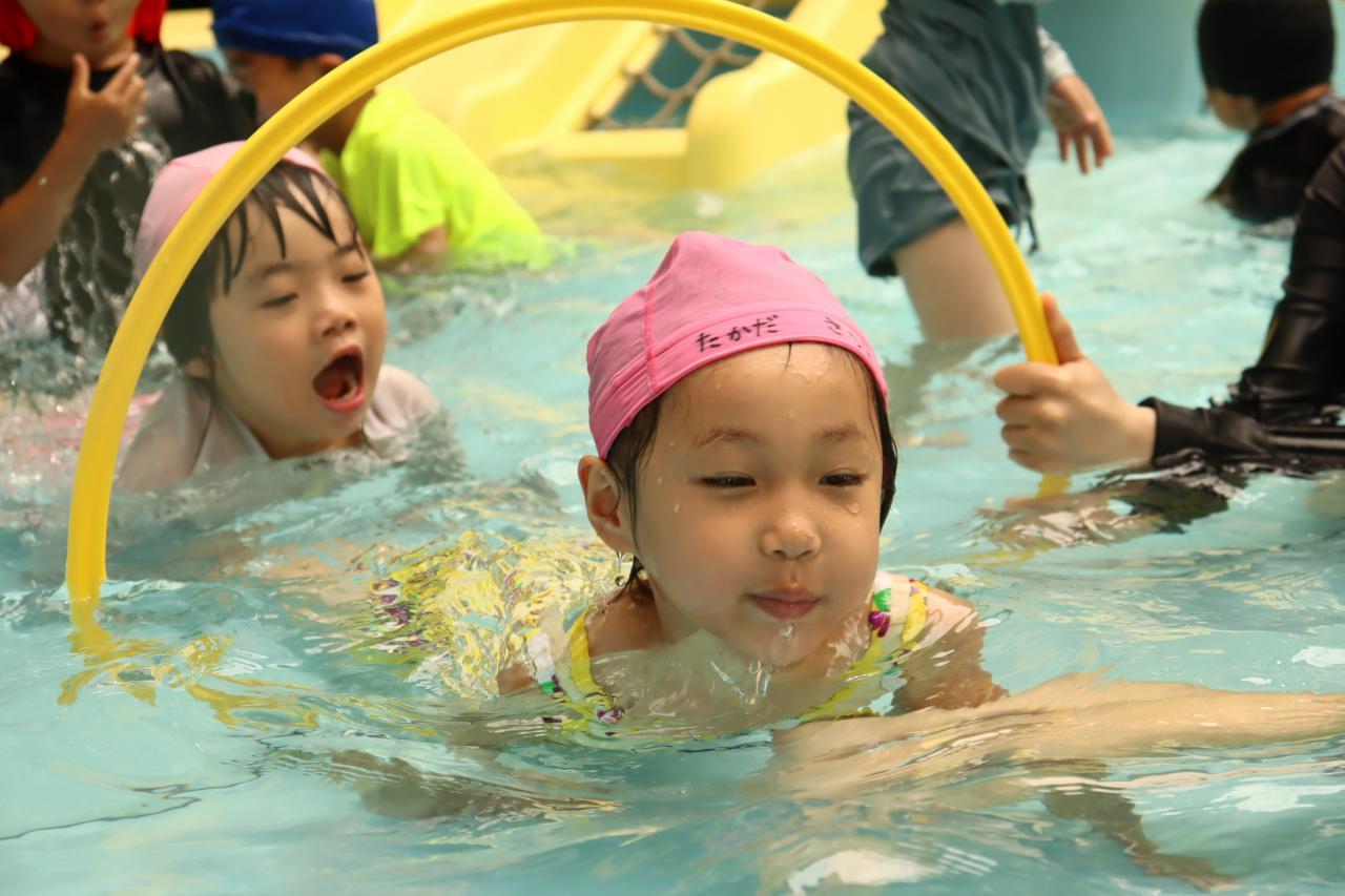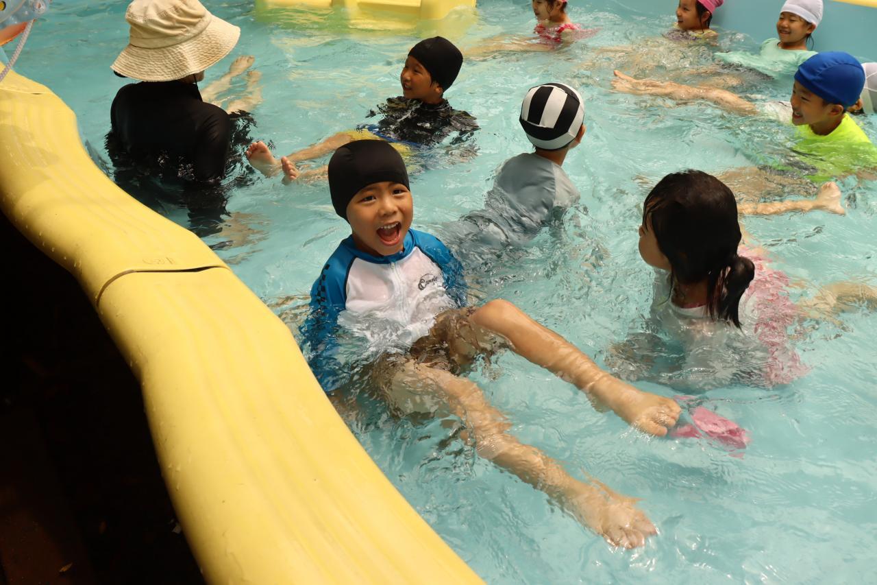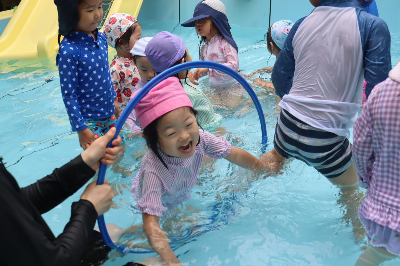 浮き輪の紐を持って連結して、お友だちと協力して遊ぶ姿もありました♬