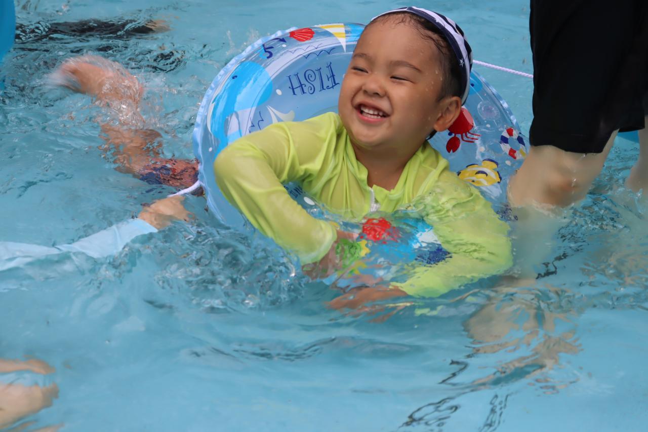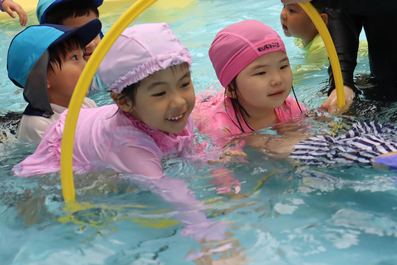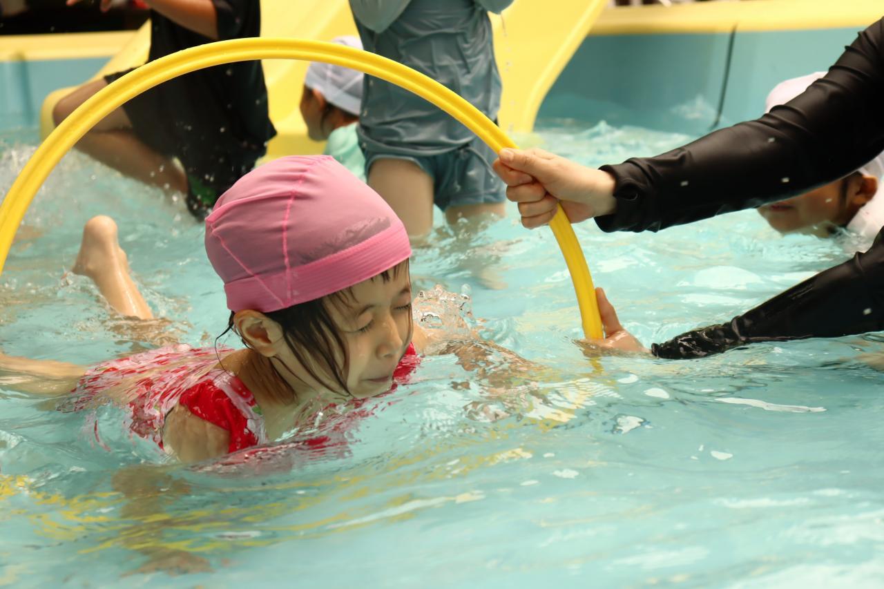 浮き輪の紐を持って連結して、お友だちと協力して遊ぶ姿もありました♬