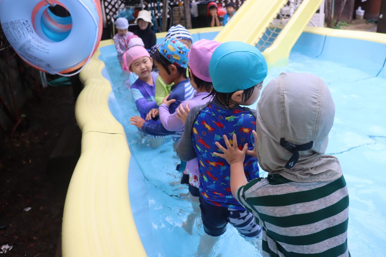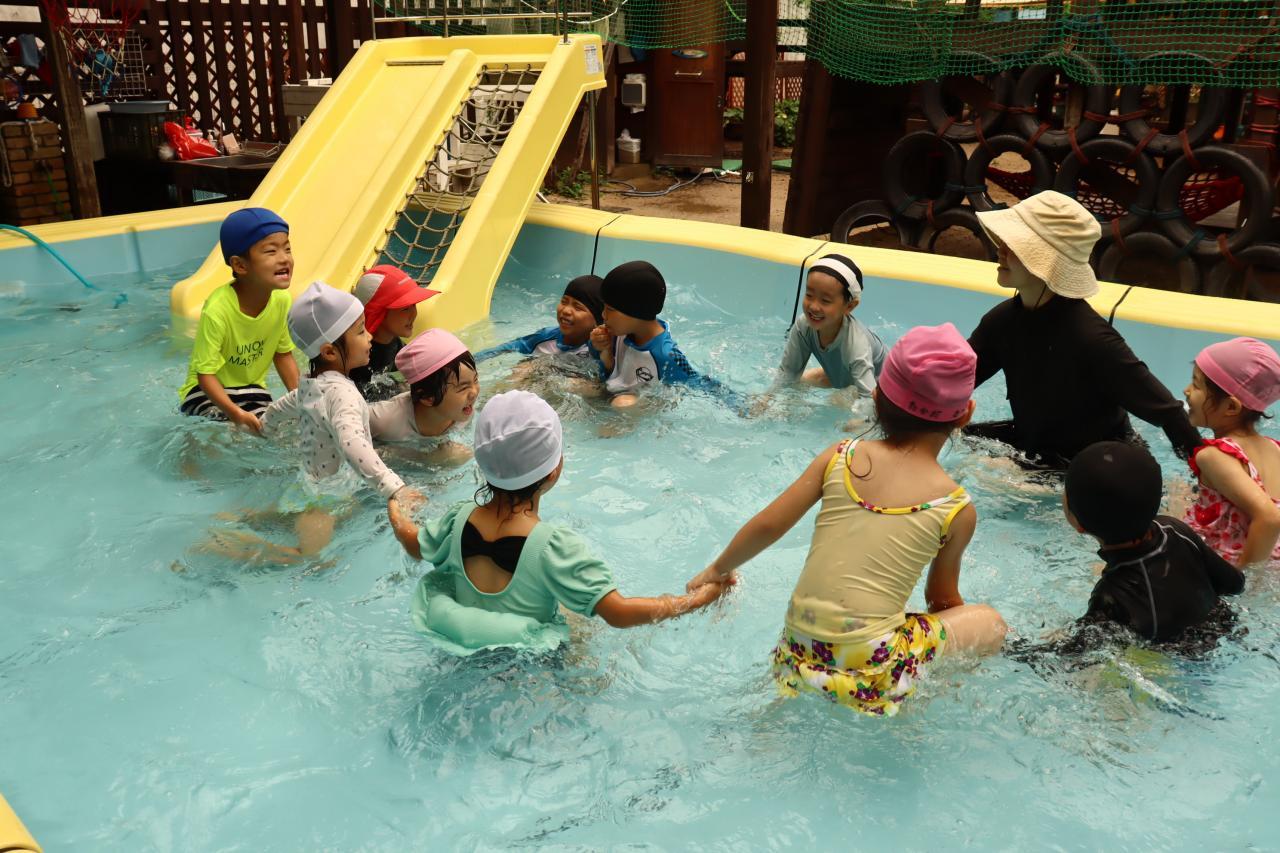 みんなでプールに渦できるかな~?と大人が言うと、「できるで!」と子どもたちから手をつなぎ、輪になっていました。