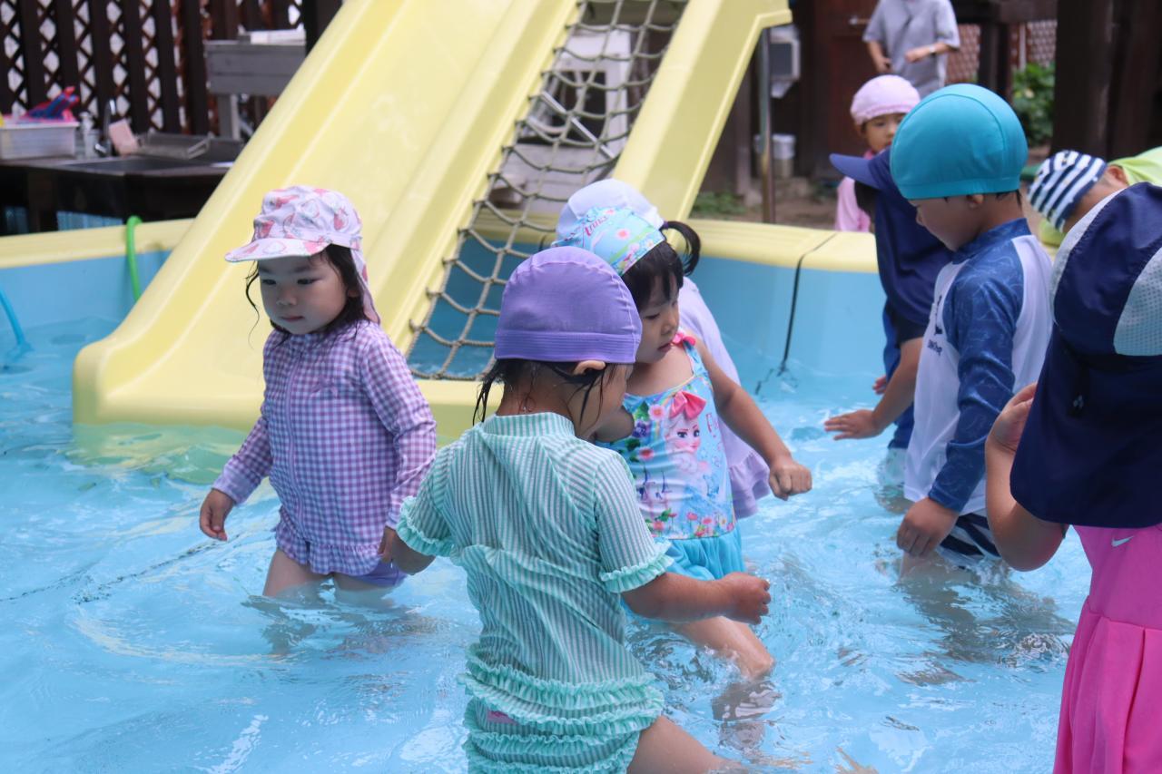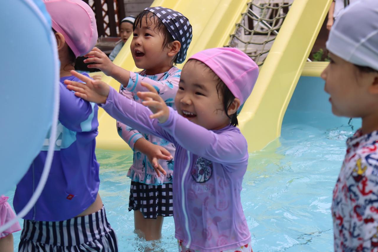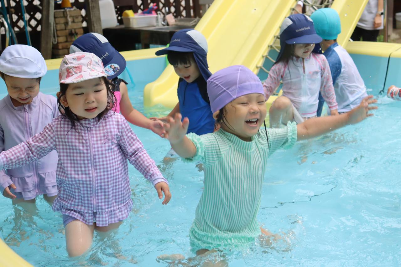 「雨が止んだからプールに入るよ~」と大人が声をかけると「やったー!」とみんな大喜びで水着に着替えだしていましたよ(^▽^)