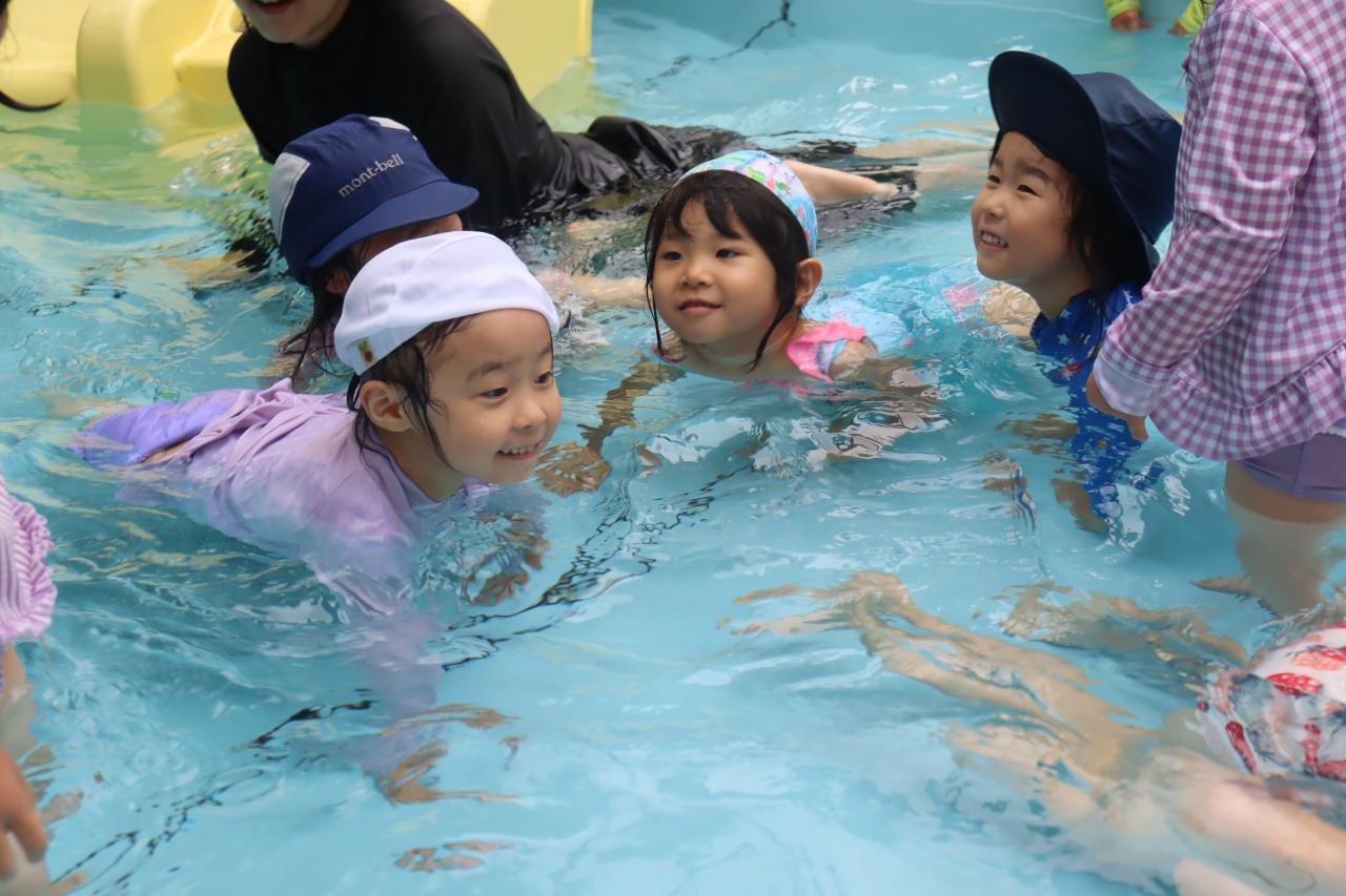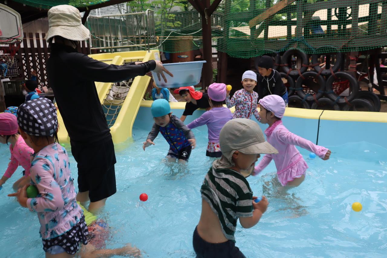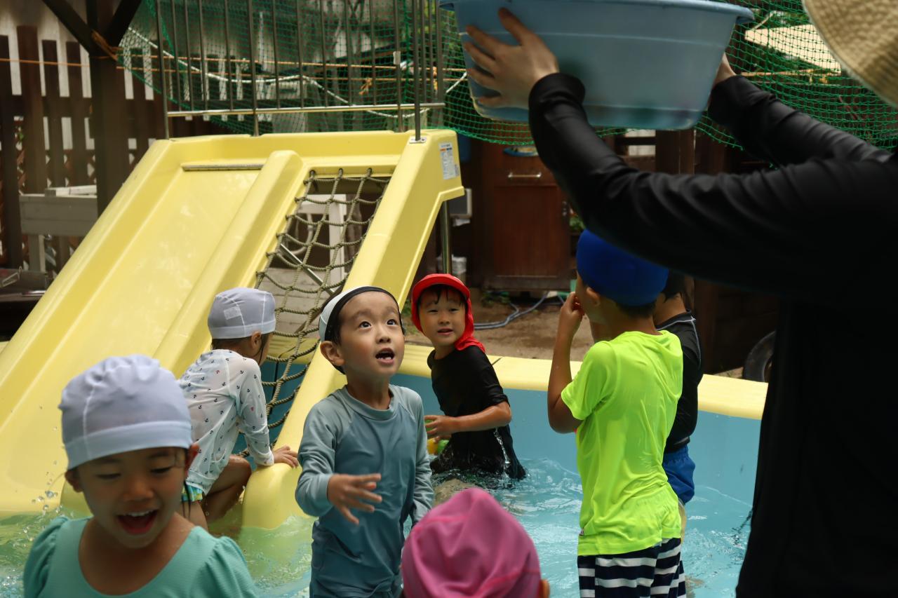 「雨が止んだからプールに入るよ~」と大人が声をかけると「やったー!」とみんな大喜びで水着に着替えだしていましたよ(^▽^)