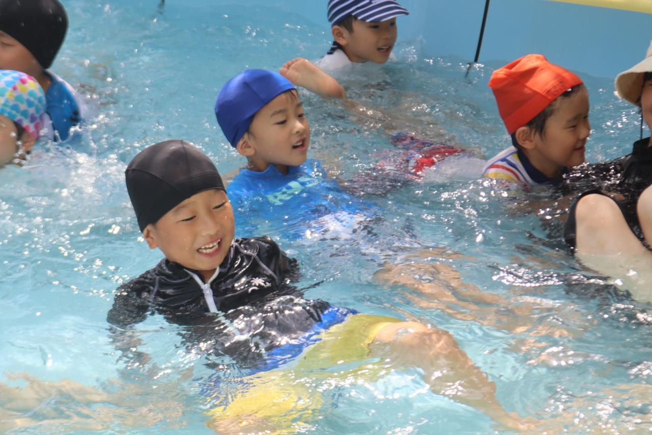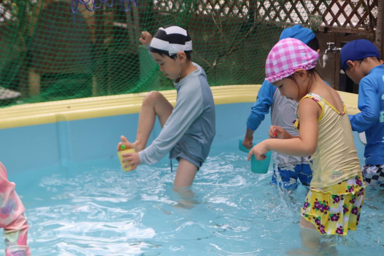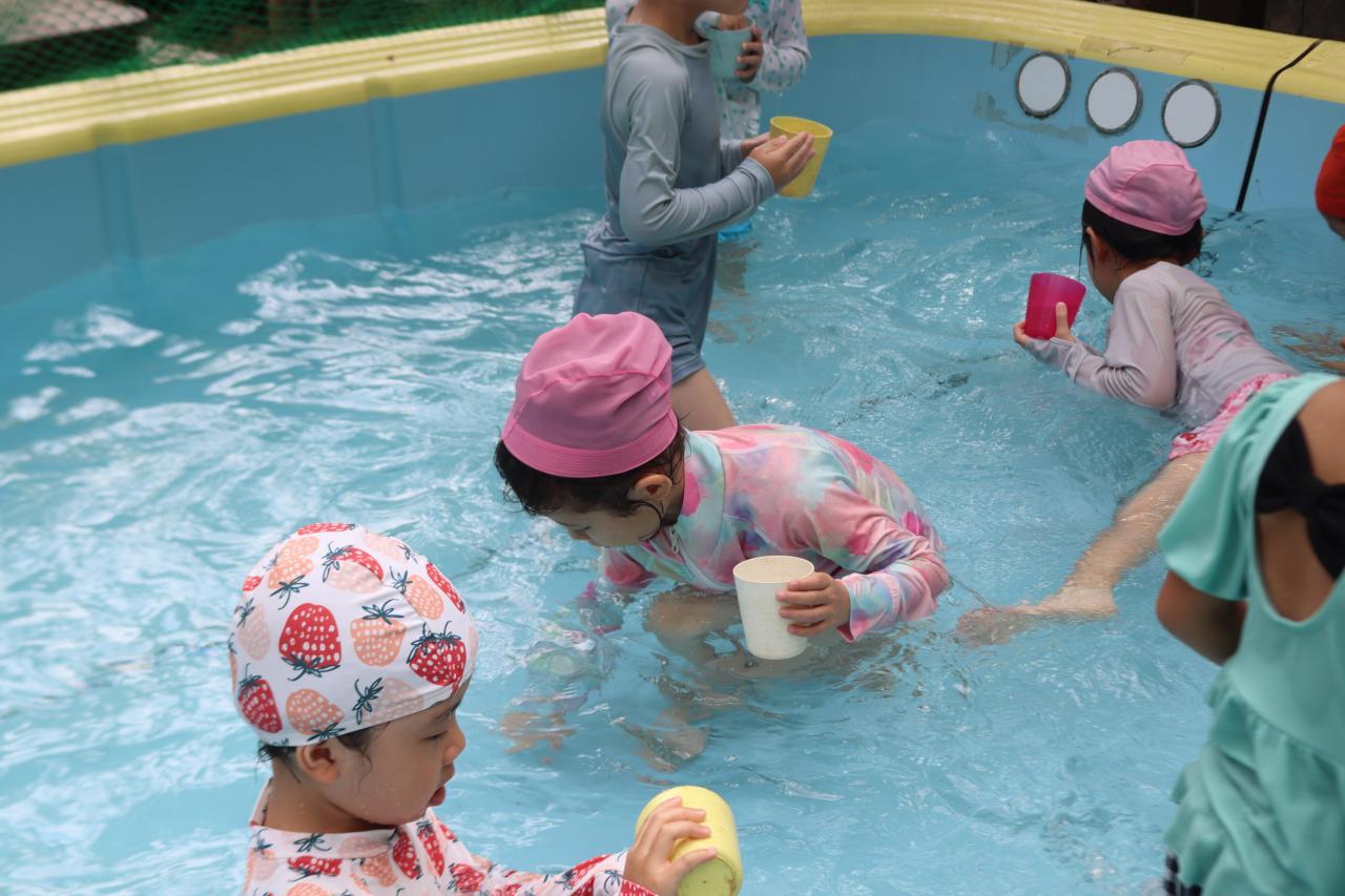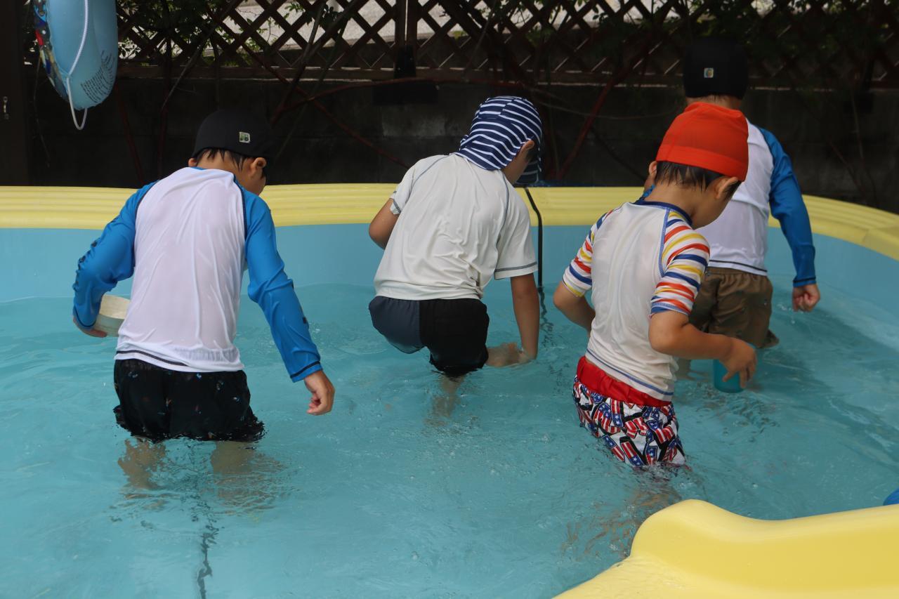 お昼寝で元気も復活し、プールに気持ちよさそうに入る子どもたち(^^)