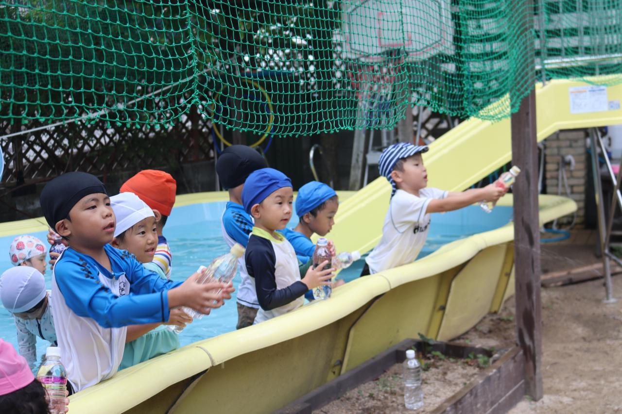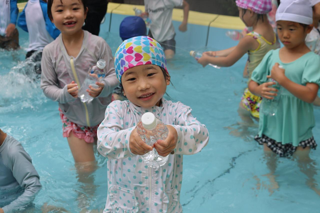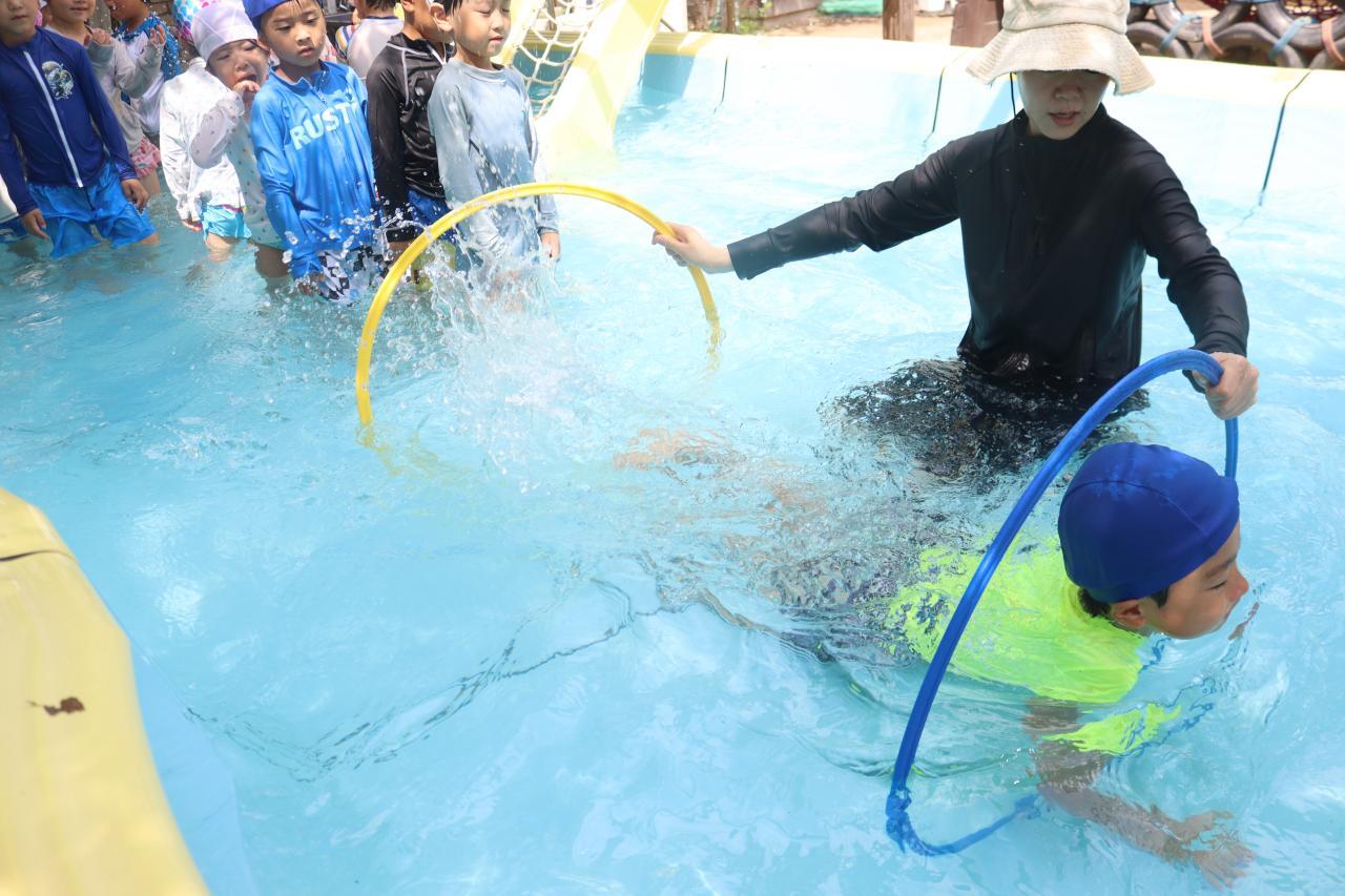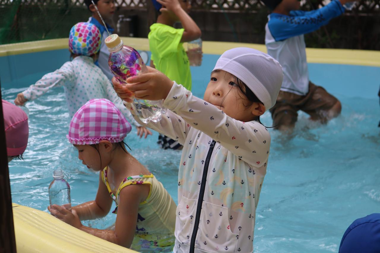 お昼寝で元気も復活し、プールに気持ちよさそうに入る子どもたち(^^)
