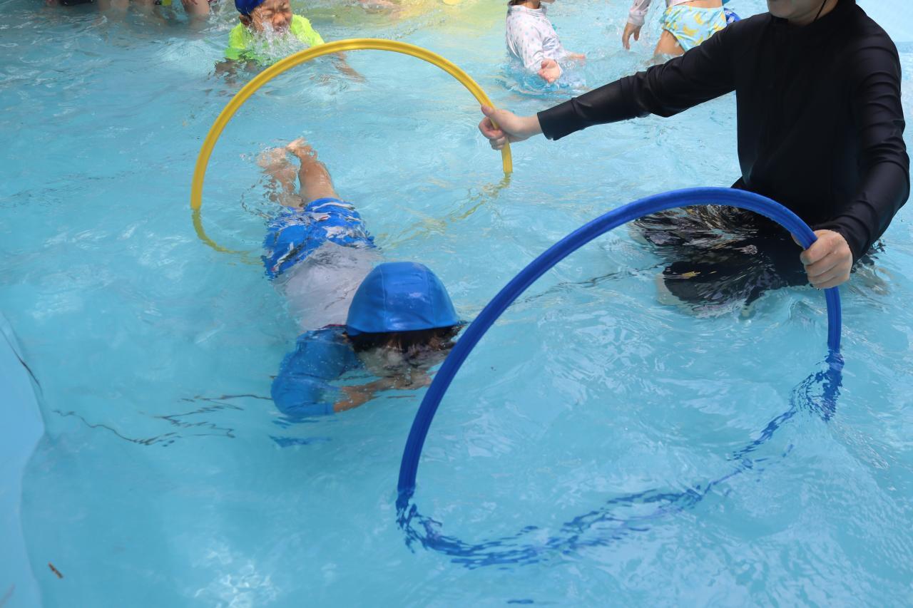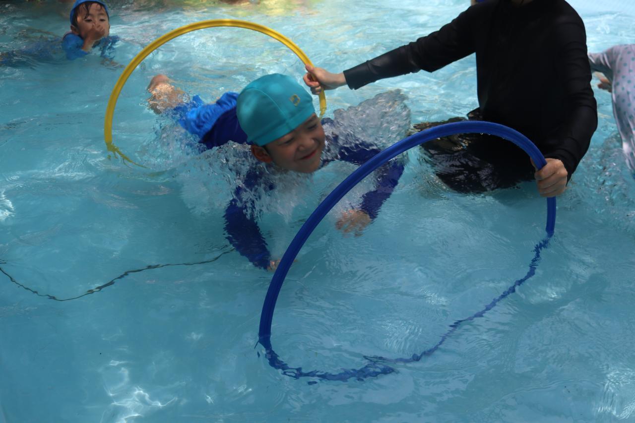 トンネルが2個並んでいるので、1個目をくぐる前から先の2個目も見て、蹴伸びのようにスタートして2個ともくぐる子やバタ足でくぐっていく子もいましたよ★
