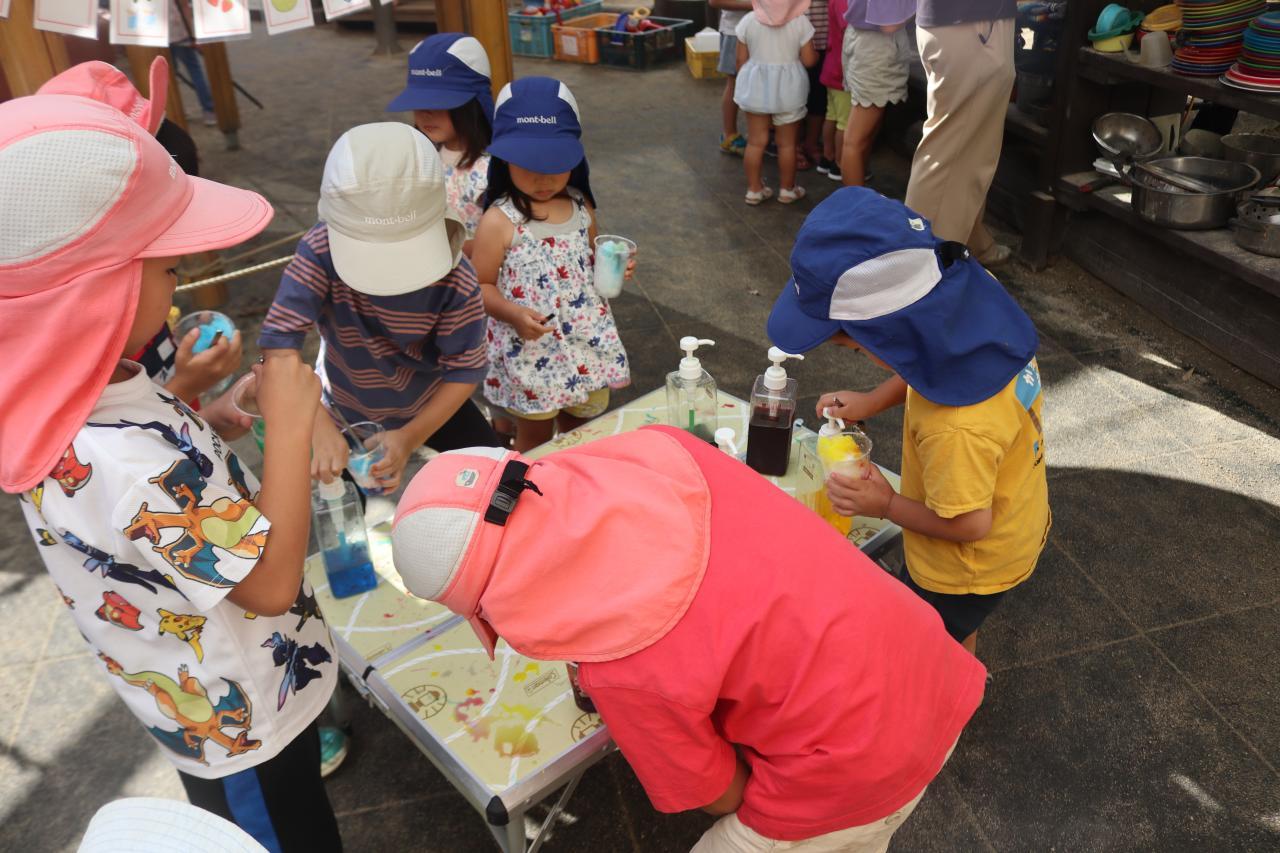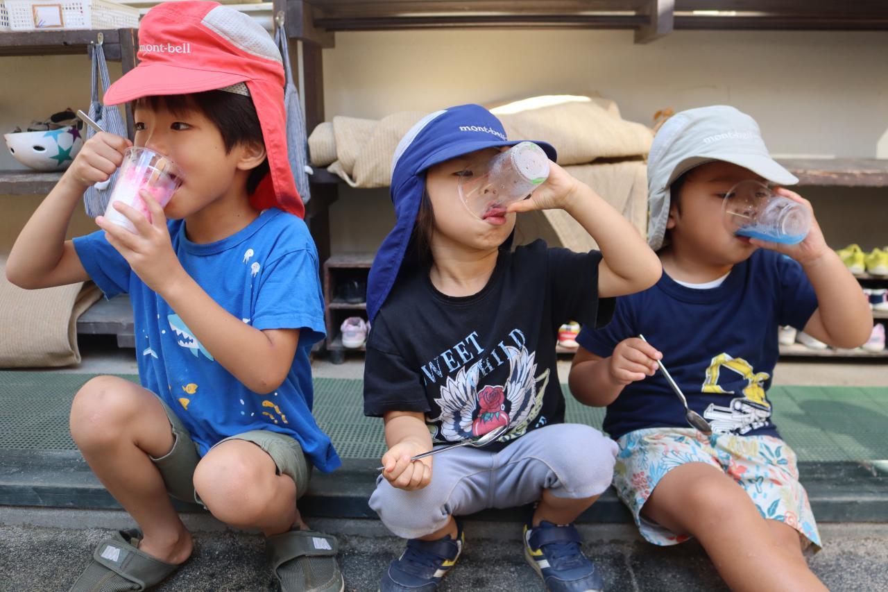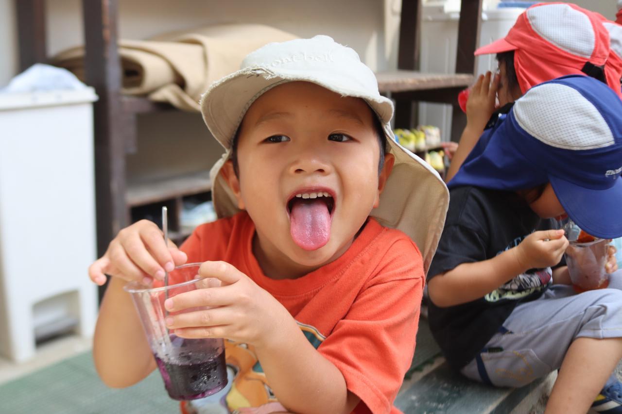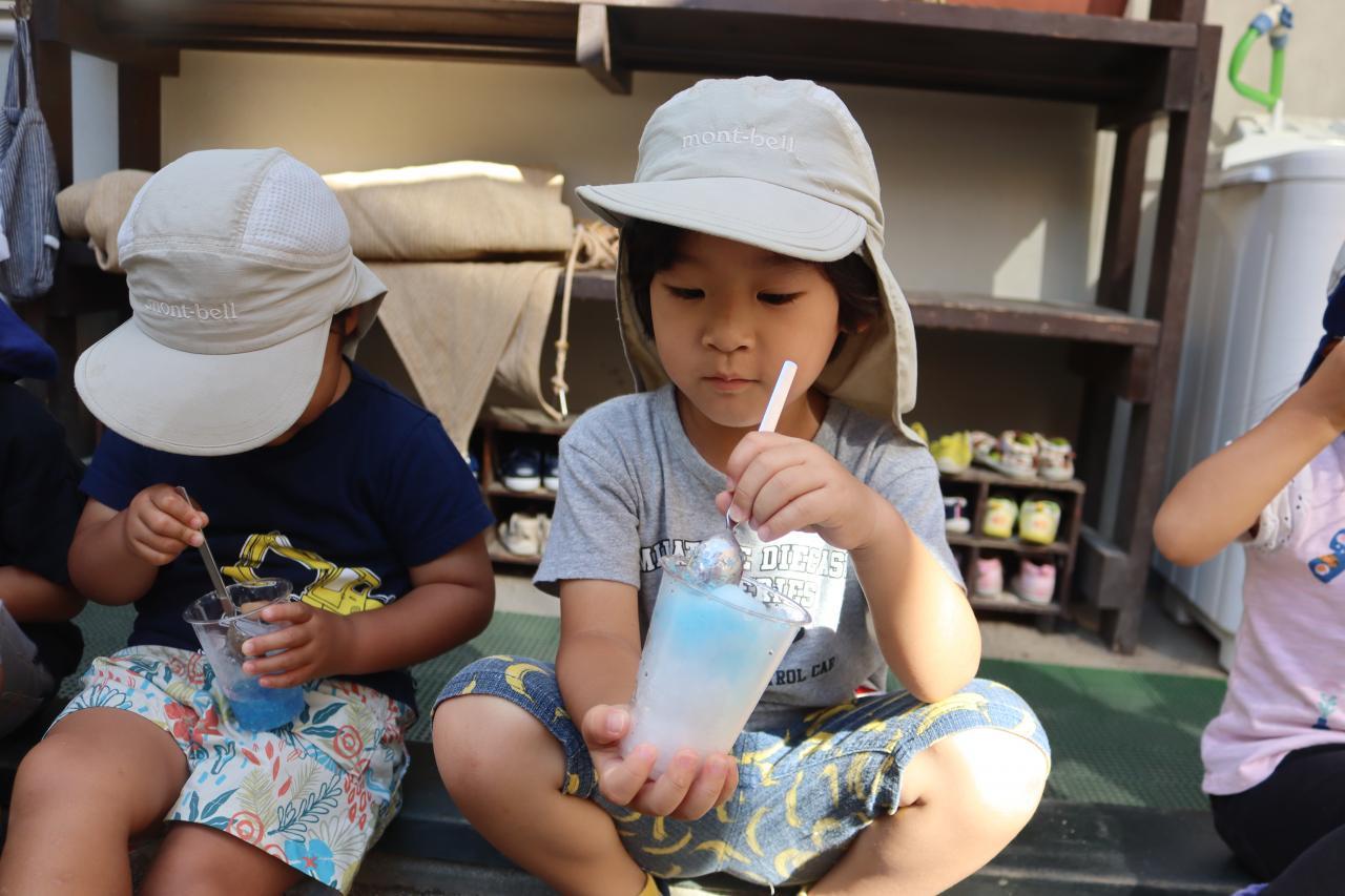 「ブルーハワイとレモンをかけたらソーダ味になるで」と自分たちで混ぜてどんな味になるか発見したり、「すごいきれいな色になったから見て!」とシロップを入れるた度に見せに来てくれる子もいました(^^)/
