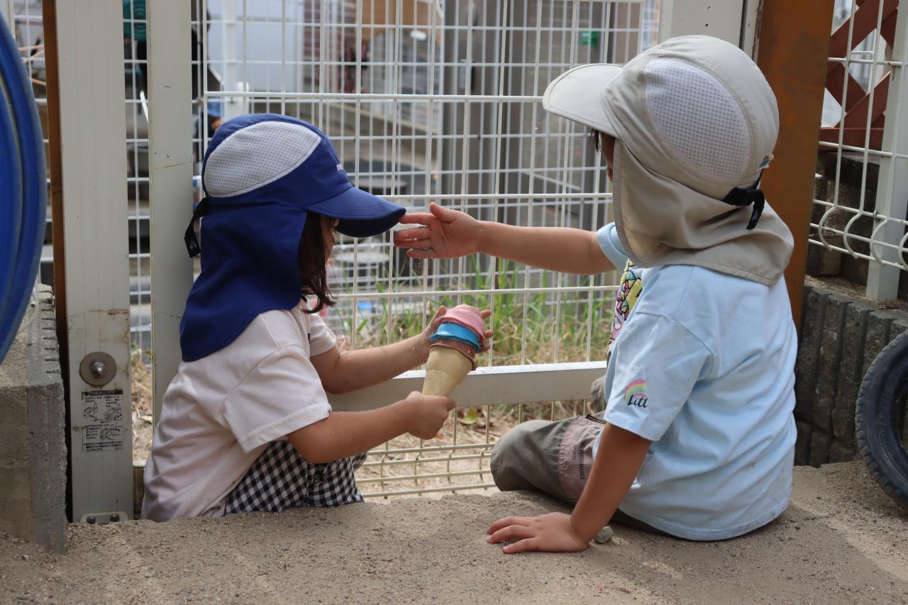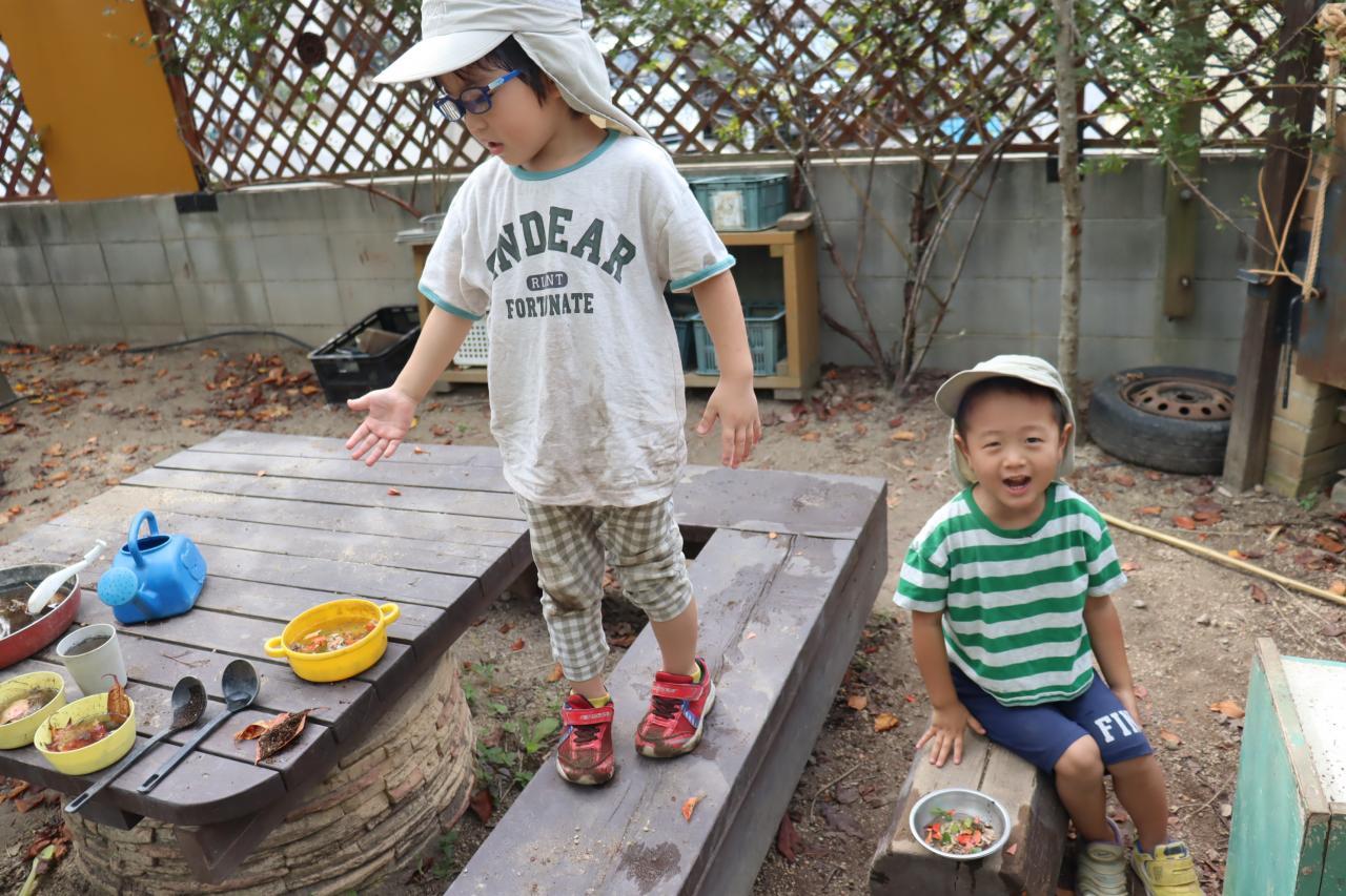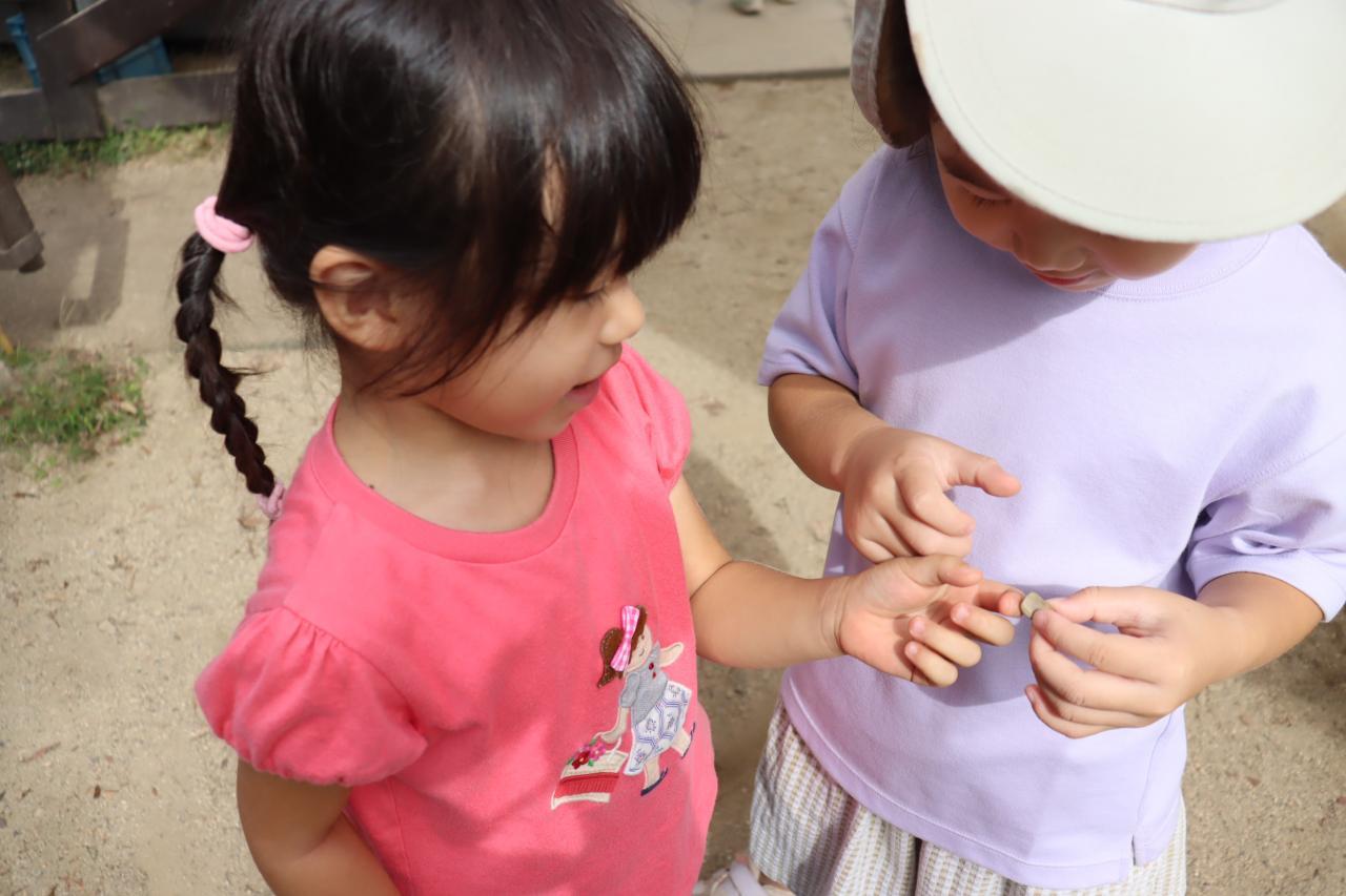 どんより曇り空。吹く風は涼しく過ごしやすいと思いきや時々出る日差しはまだまだ強いです。園庭では水遊びする子どもも少なくなり秋を感じる遊びが増えたと思います。
