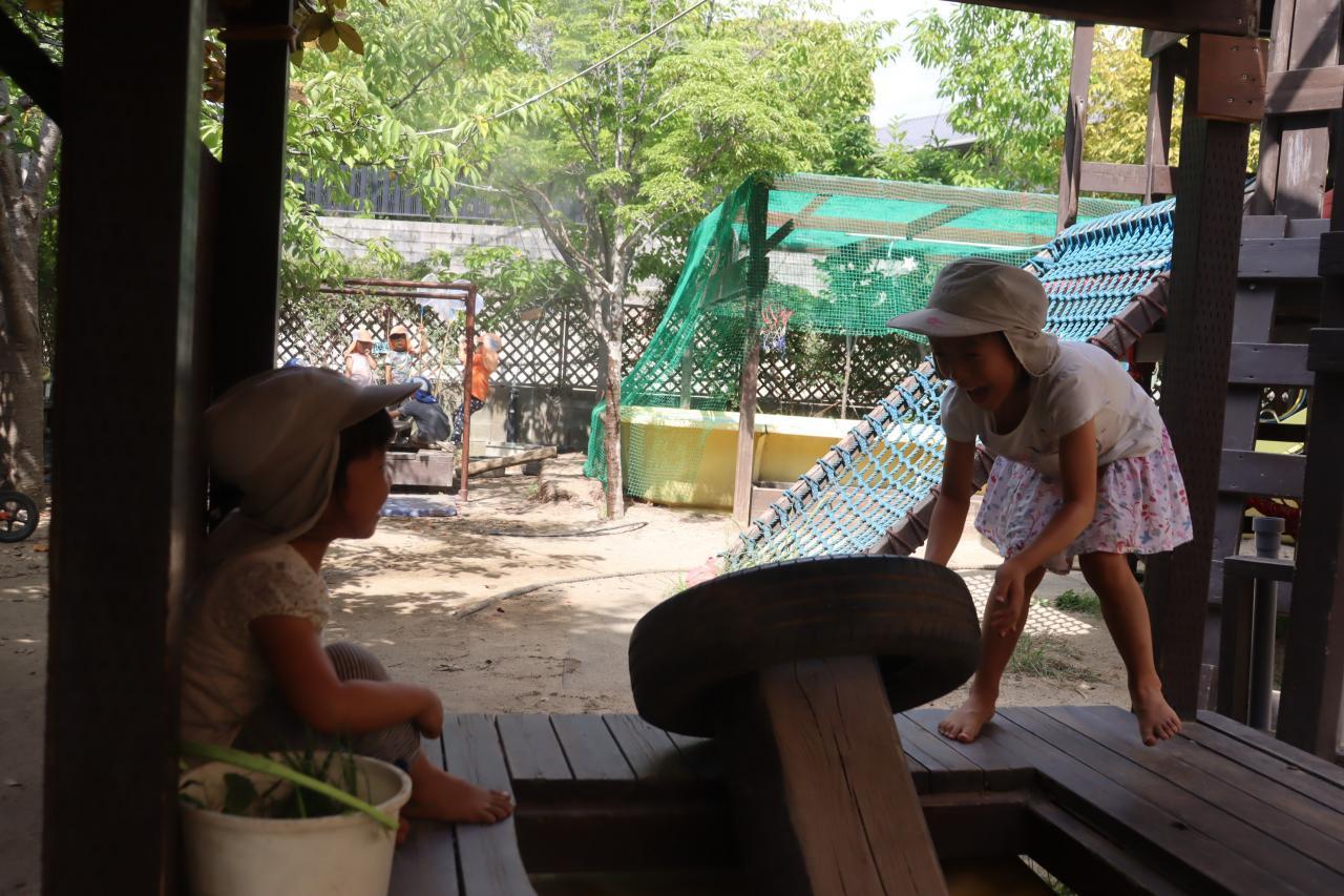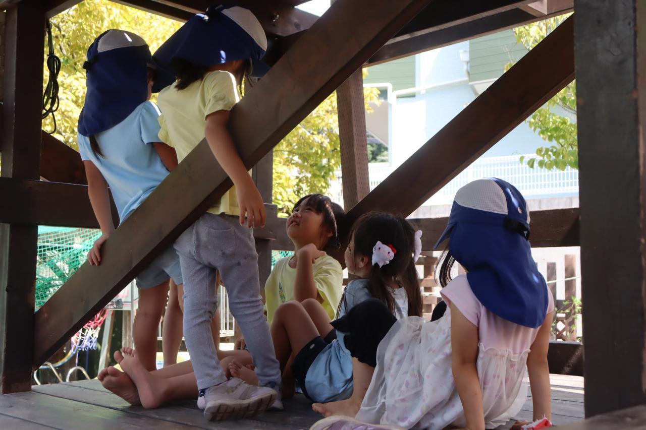クローバー園庭では、はなみずきはうすの上できりんさん、ぺんぎんさんの女の子たちがマジカルバナナゲームをして盛り上がっていましたよ♪