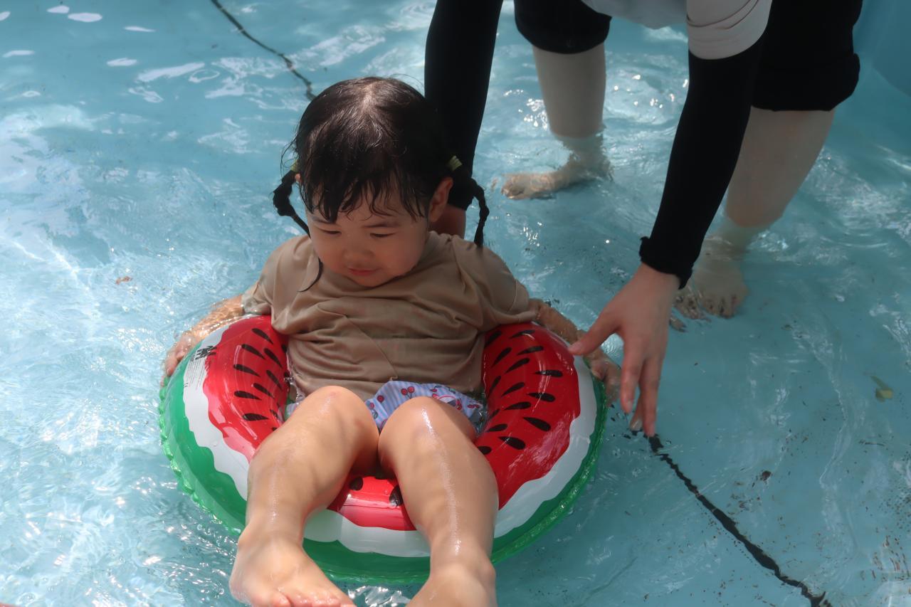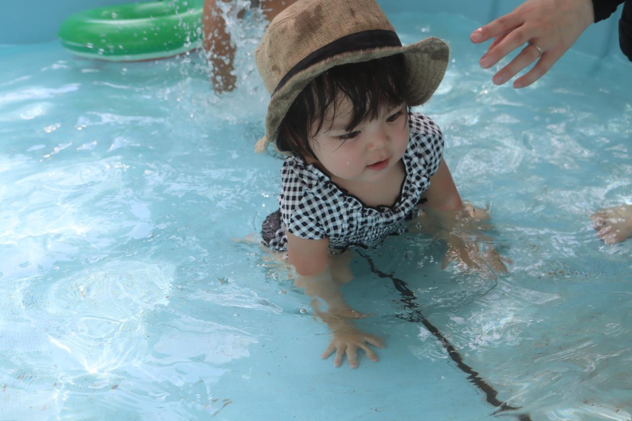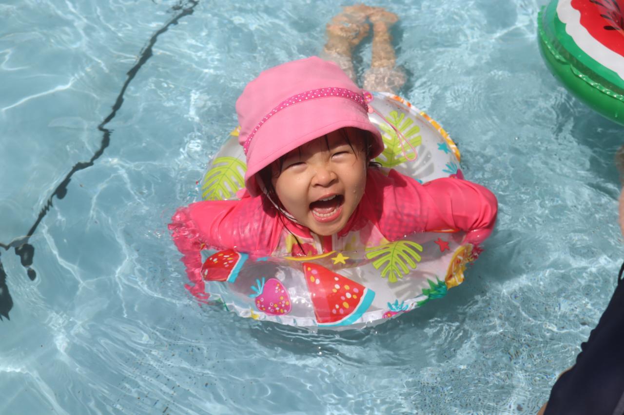 はじめは少し緊張気味のお友だちも、次第に水に慣れて、プカプカと浮き輪に乗って浮かんでみたり、お友だちの真似っこをしてワニさん歩きをしてみたり。。。