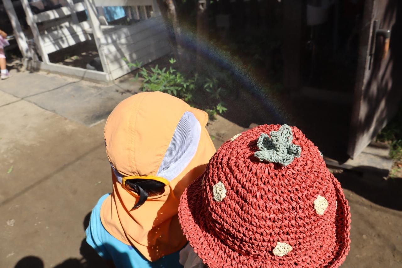 今日の園庭遊びの時に、ミストのシャワーと太陽の光で、虹ができているのを発見しました(^^♪
