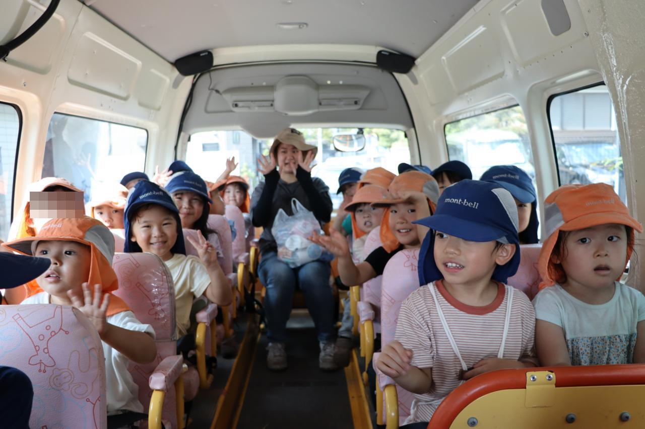 「いってきまーす!」と元気いっぱいの子どもたち。ねずみさんは初めての園バスに大喜びでした♡