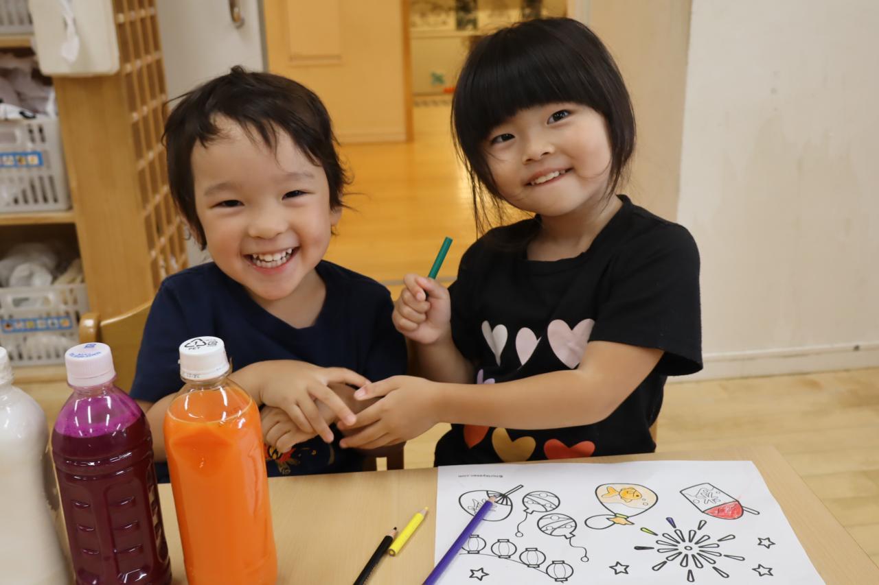 お祭りの塗り絵をしているお友だち*「かき氷のシロップなににする?」「えーっといちご!」と一緒に塗り絵を進めていました♬机には、シロップを並べてミニお祭りごっこ♡