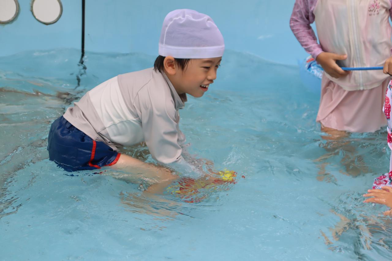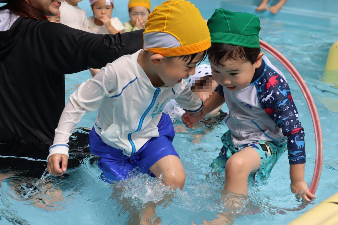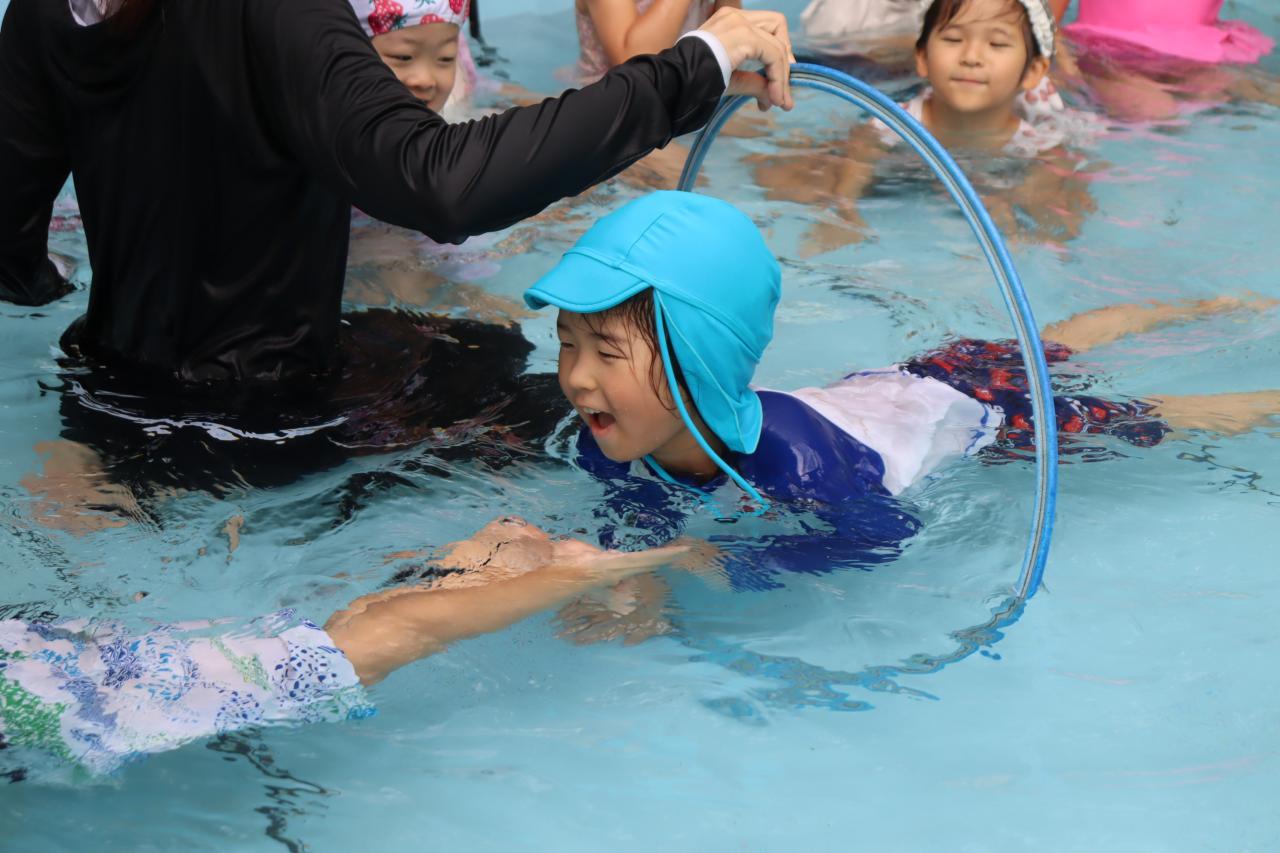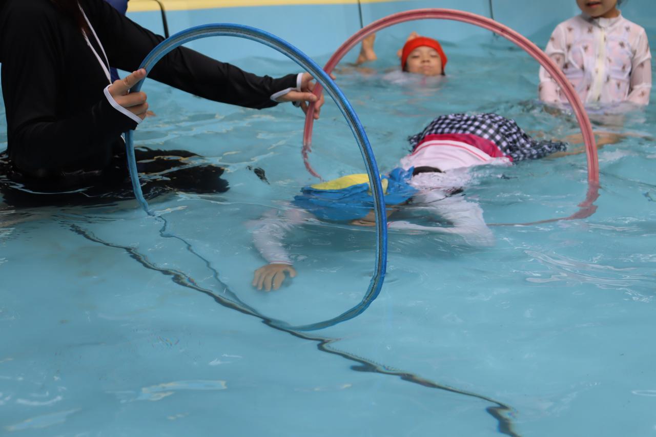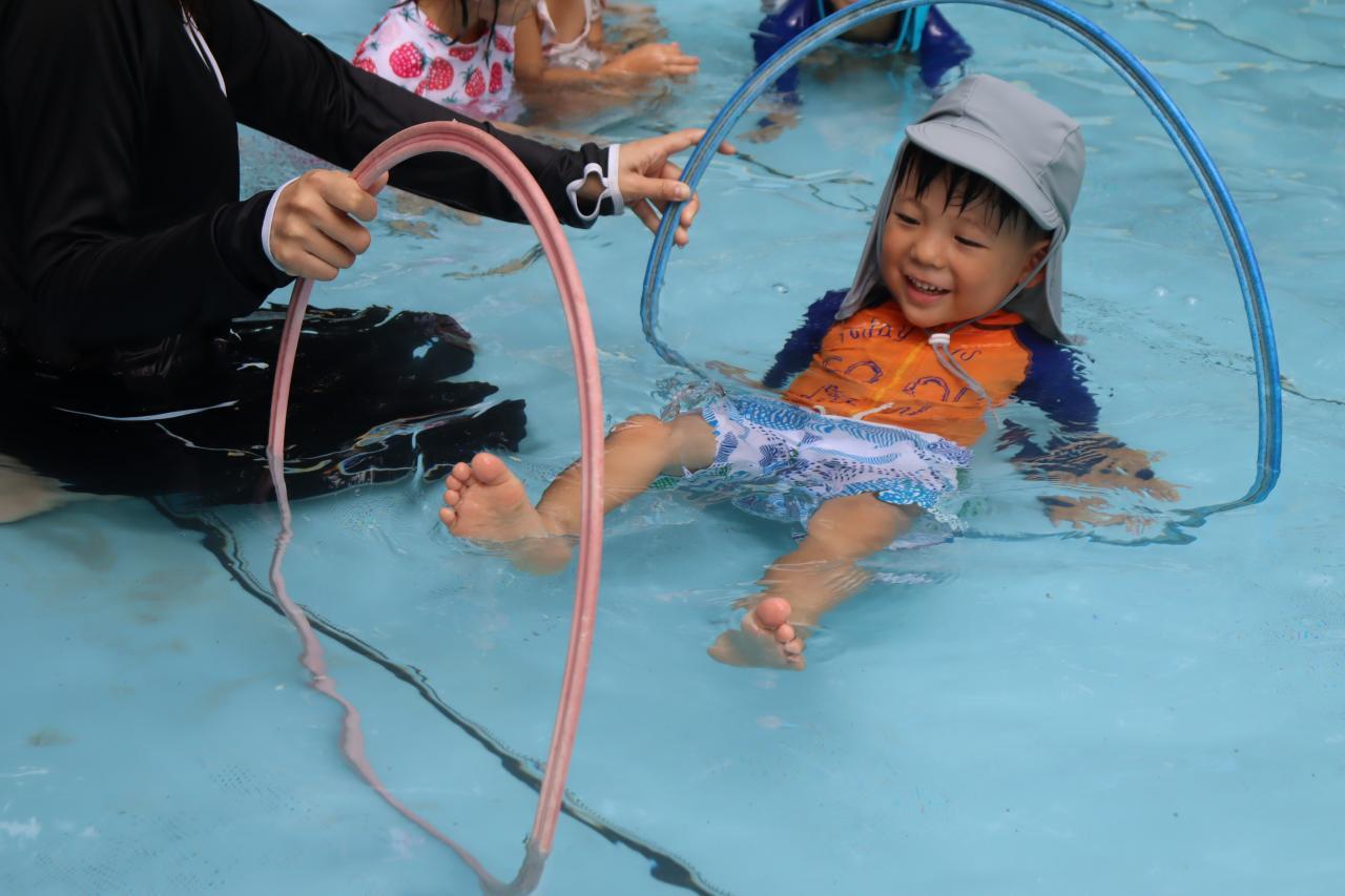 水慣れした後はフープをくぐっていきます。潜水艦!と水の中にもぐって通っていく子がたくさんいました!さすがきりんさんですね!
