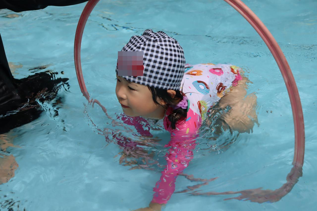水慣れした後は、フープを好きなくぐり方でくぐっていきます。