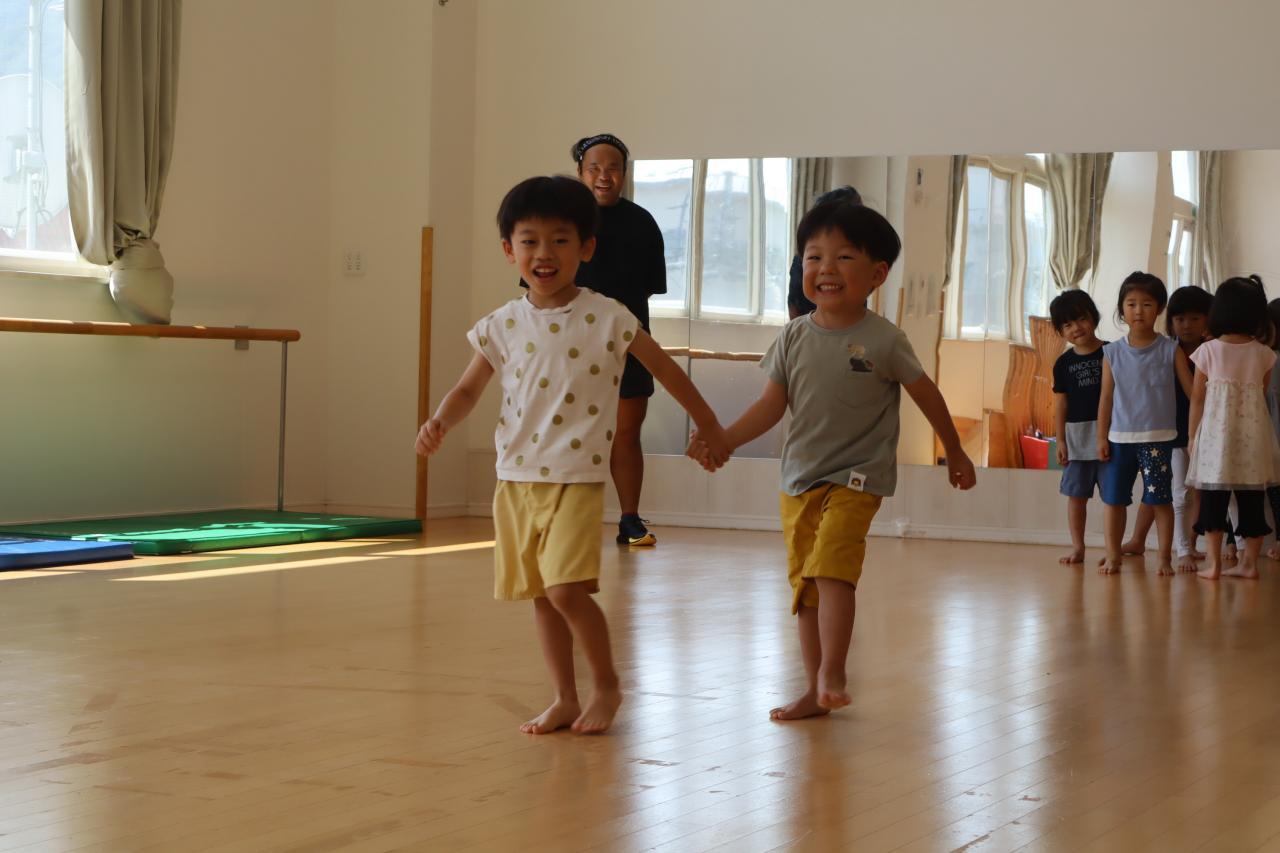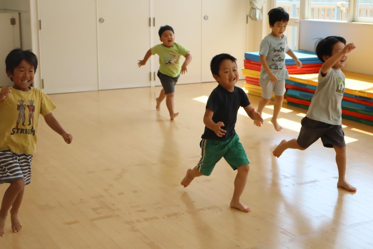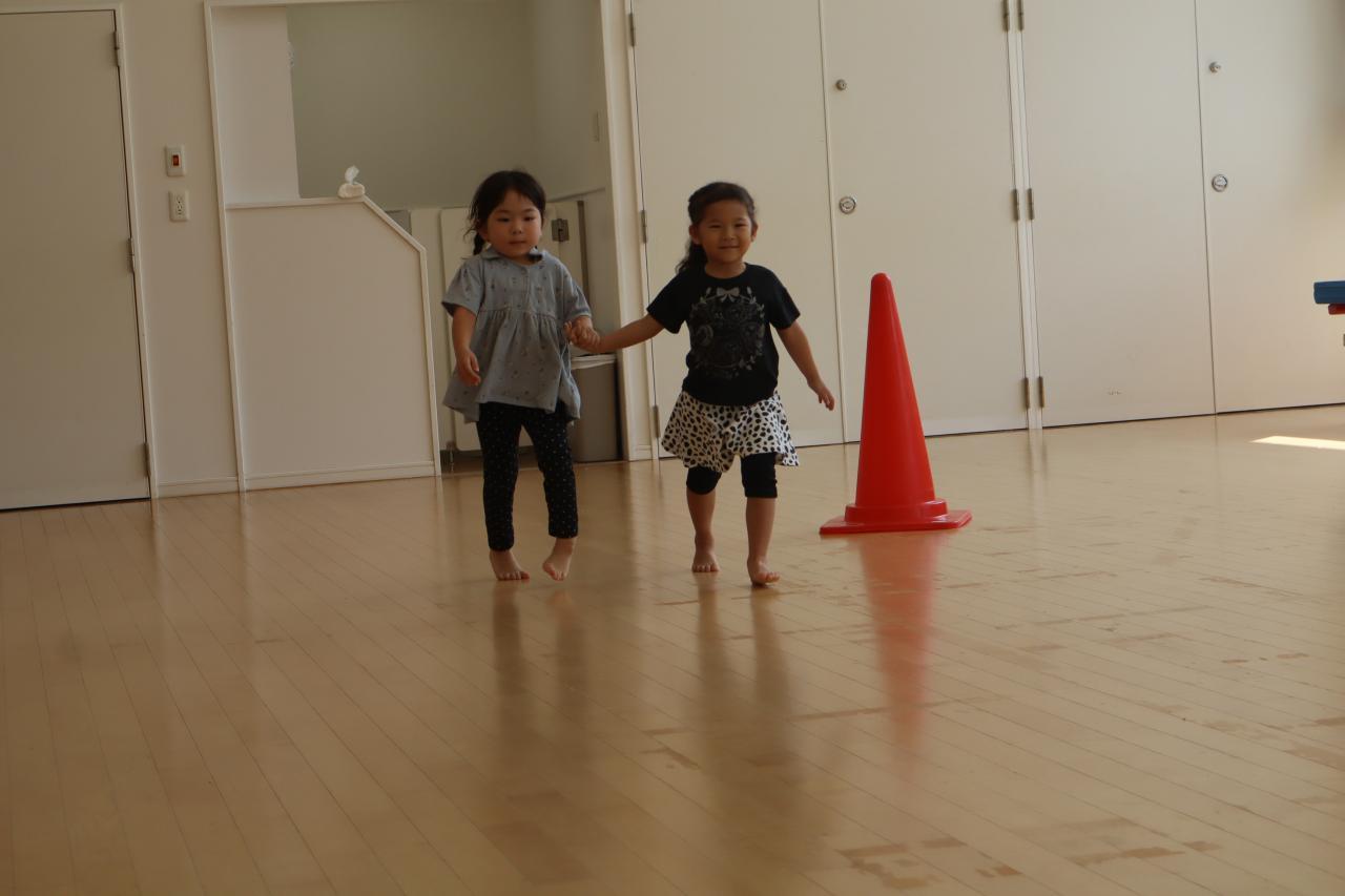 次はスキップです!みんな笑顔で楽しそうにスキップ(^O^)リズムをとって前に進むのは難しいお友だちも多いようでしたが、手と足を高くあげて進むことを意識して頑張りましたよ♪待っているお友だちから自然と応援の声が聞こえてきましたよ!