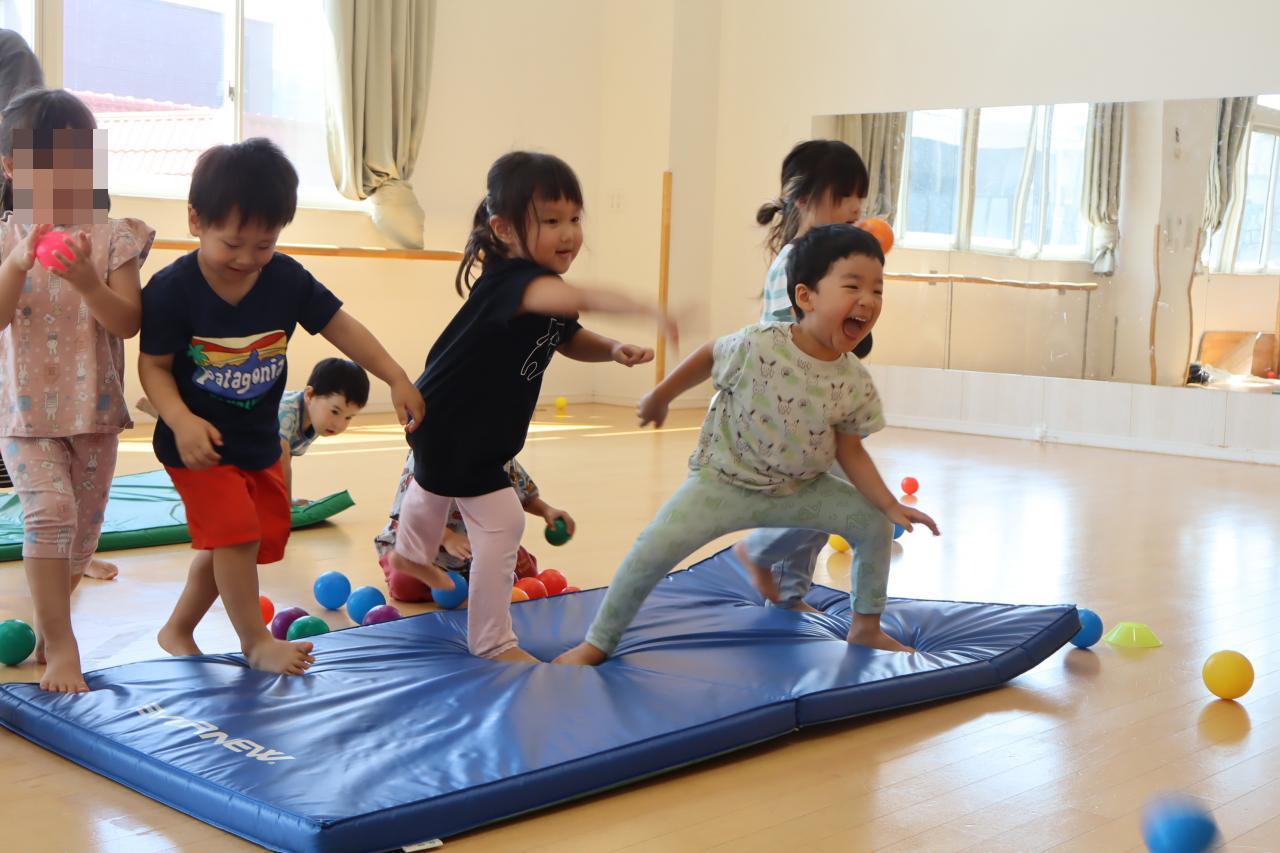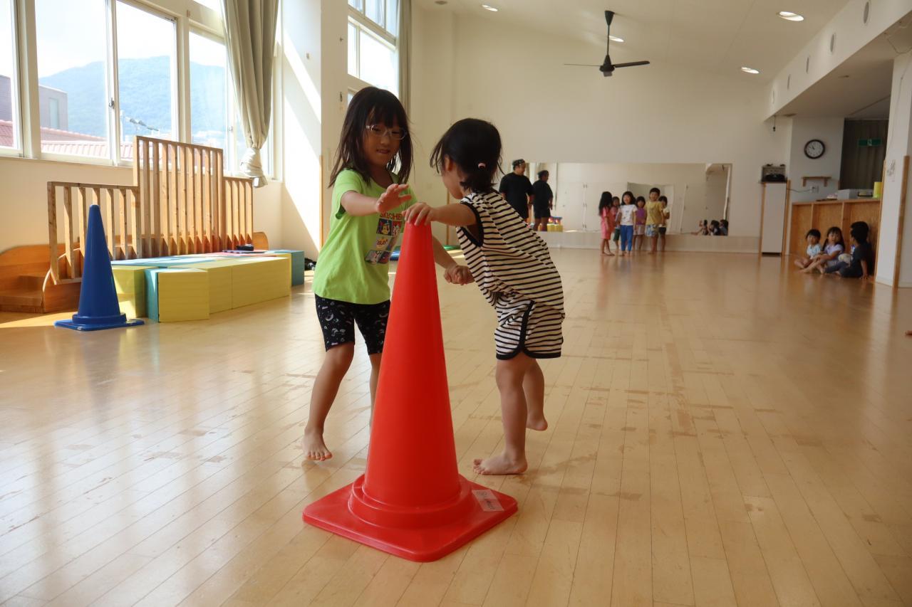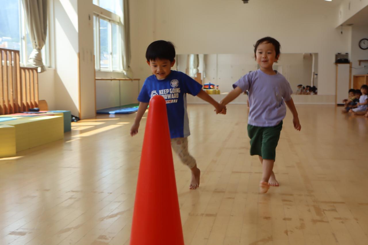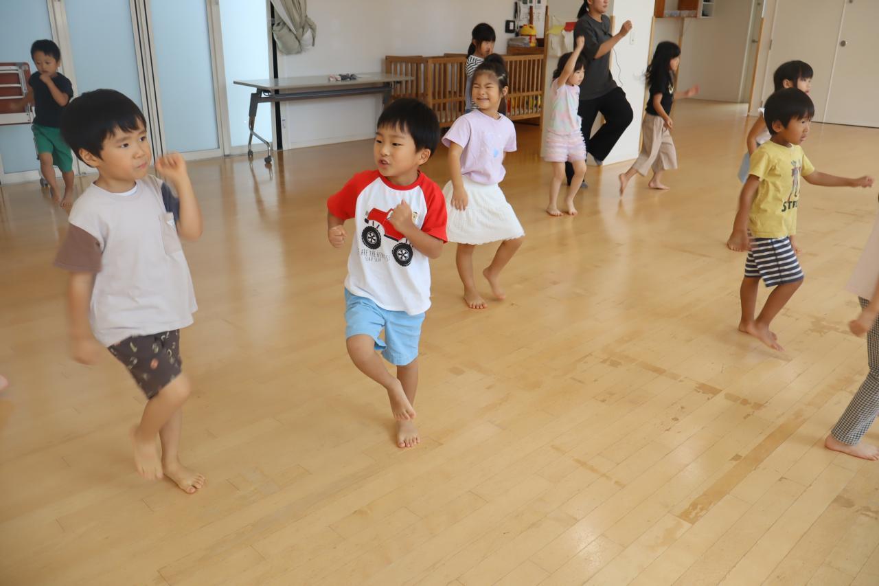 次はスキップです!みんな笑顔で楽しそうにスキップ(^O^)リズムをとって前に進むのは難しいお友だちも多いようでしたが、手と足を高くあげて進むことを意識して頑張りましたよ♪待っているお友だちから自然と応援の声が聞こえてきましたよ!