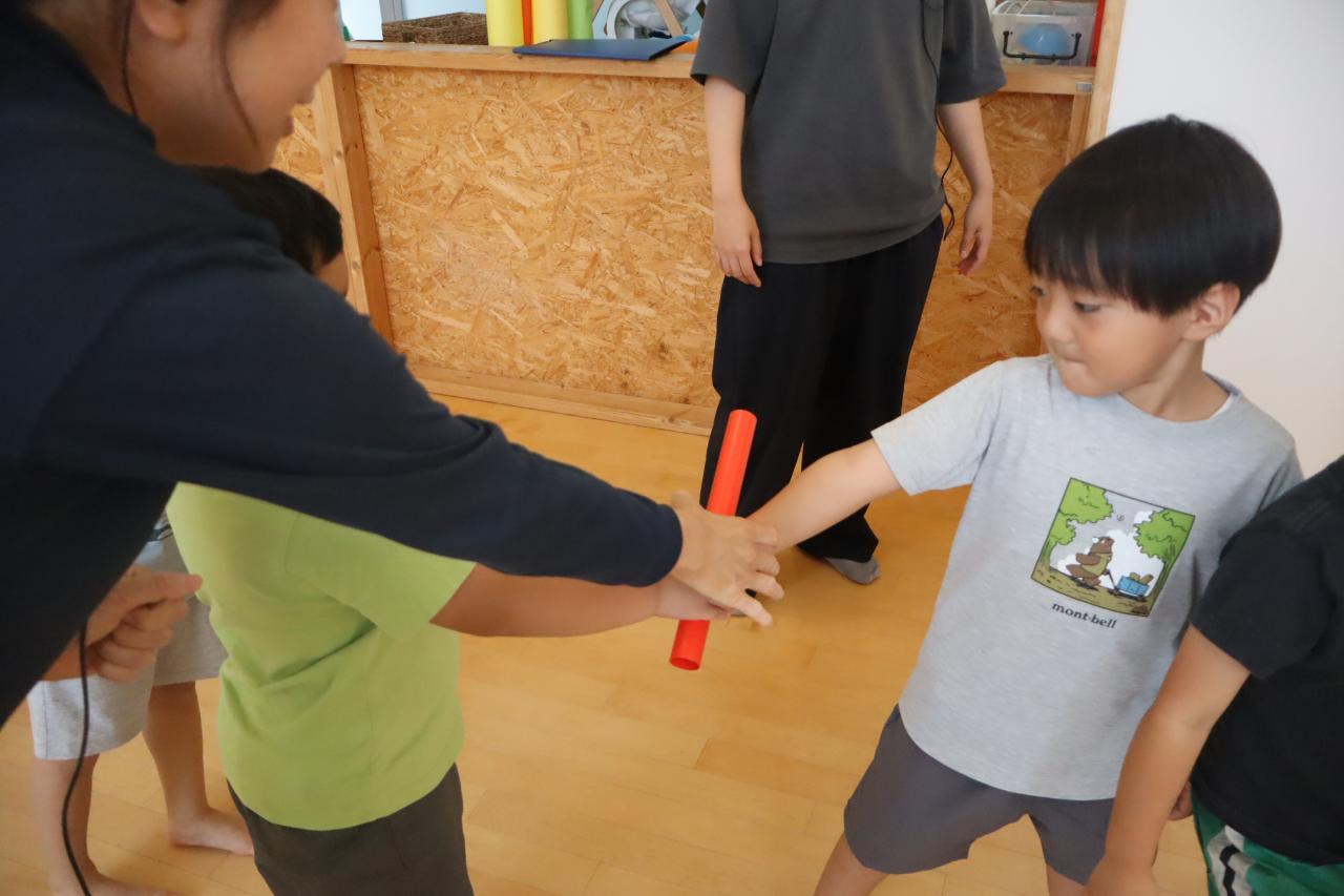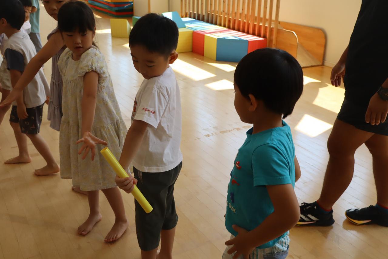 最後はバトンの練習をしました♪「世界陸上でバトン見たことある!!」と教えてくれたお友だちもいました(*^^*)1列にならんで、左手で受け取って右に持ちかえて渡していきます♪