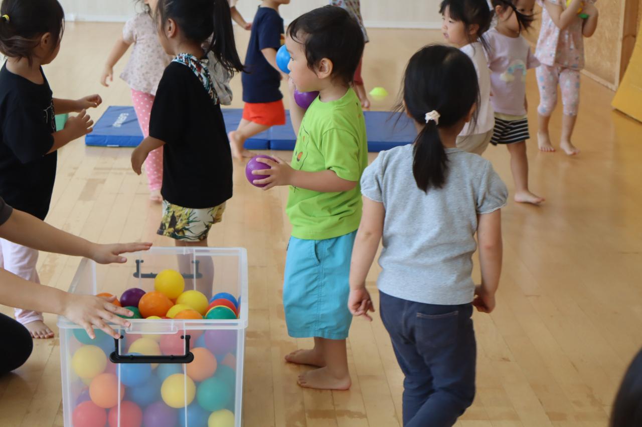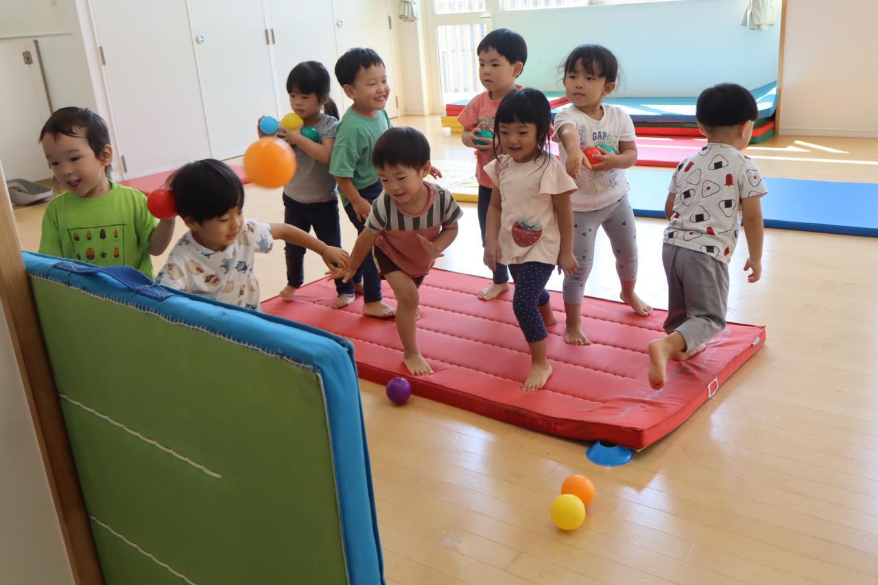 ねずみさんは、運動会で玉入れをするので、ざりがに組は黄色のマットに、かぶとむし組は青色のマットに向かってボールを投げる練習をしました。