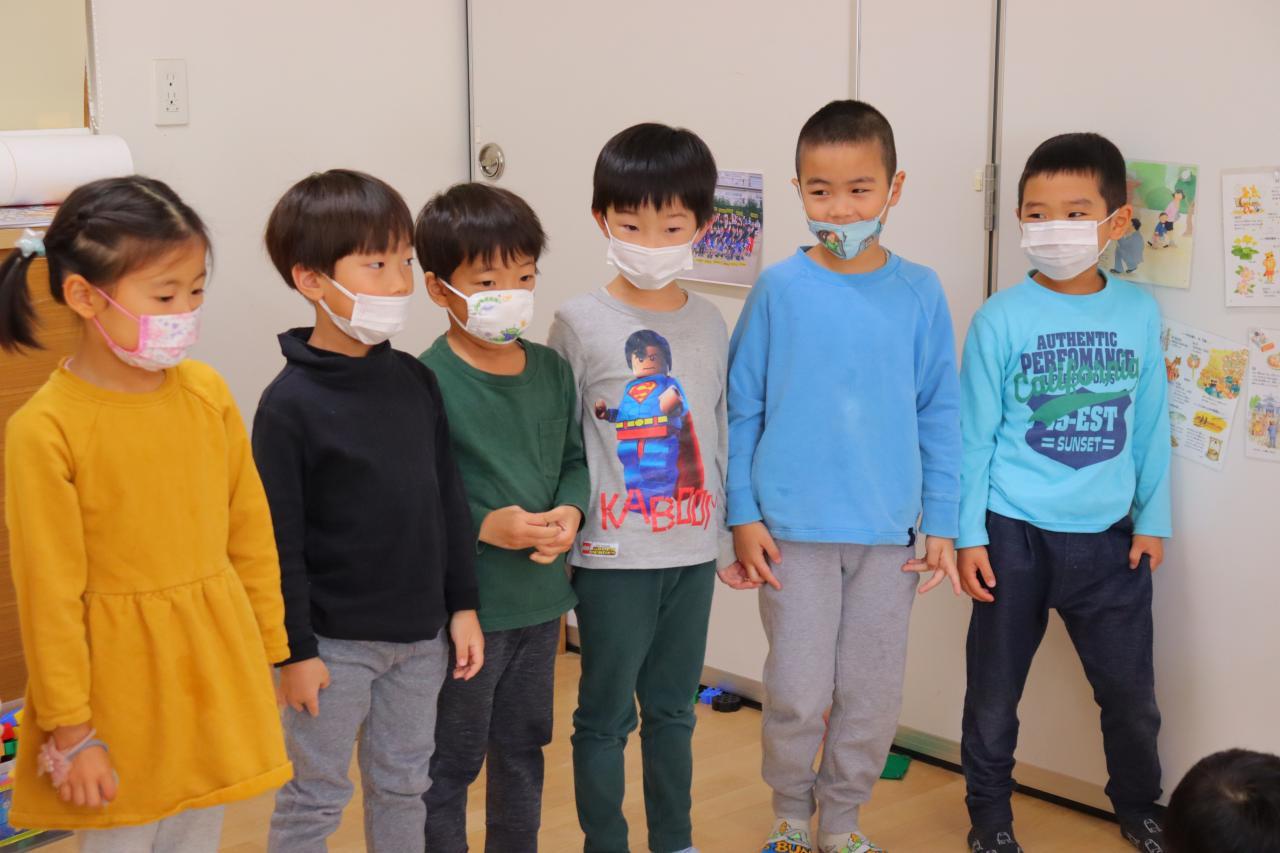 園庭に出る前には「おとまりのひ」の絵本を読んで、きりんさんに前に並んでもらって、