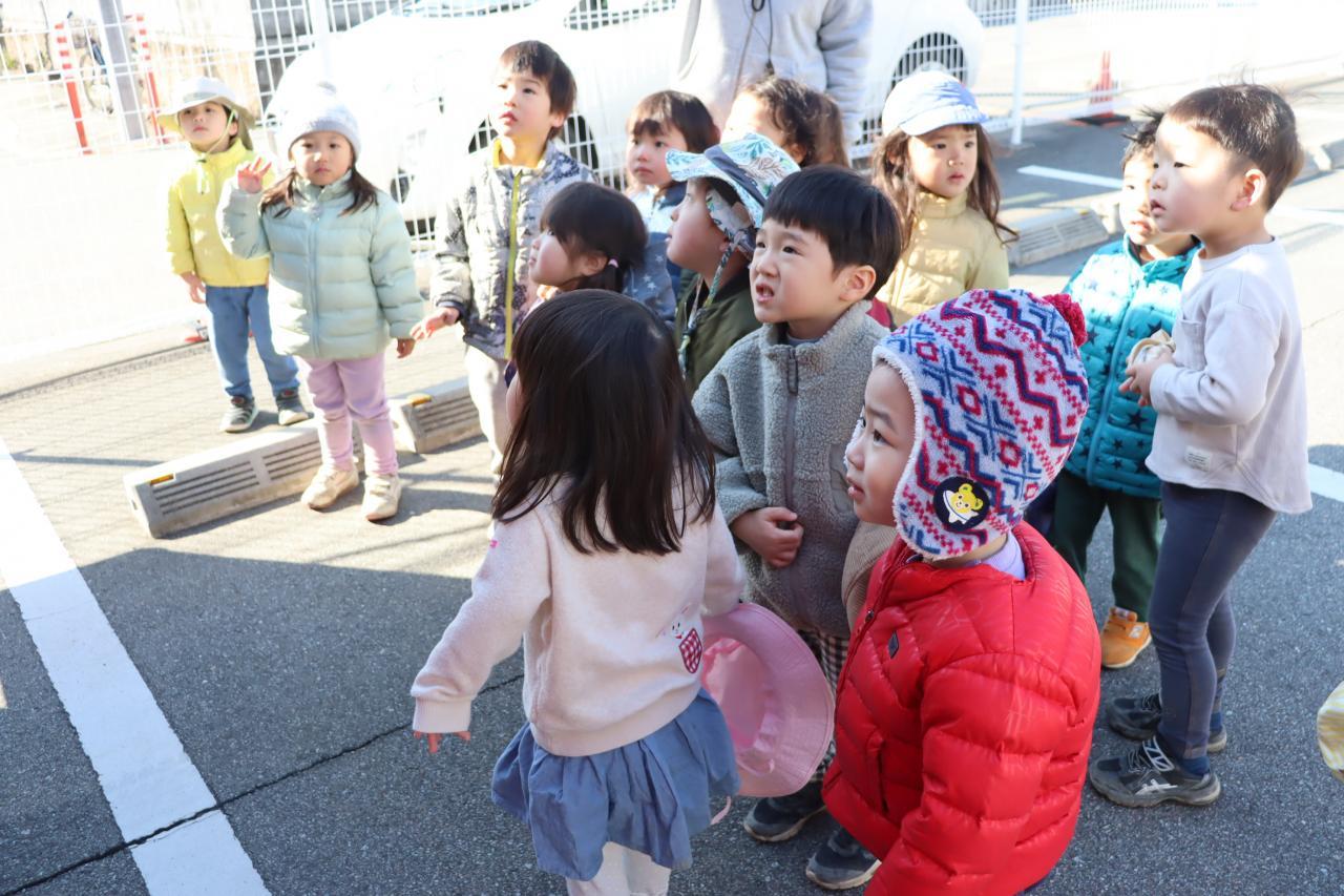 近くで見る消防車に大興奮で、「これなんだろう?」「かっこいい!」「消防車ってポンプ車とはしご車の仲間なんだよね!」とお話が止まりませんでした😊車には600Lのお水を積むことができるそうで、消防士さんが「難しいよね~分かるかな?」と言うと、全員が「分かるー!」と良い返事をしていましたよ😋(笑)