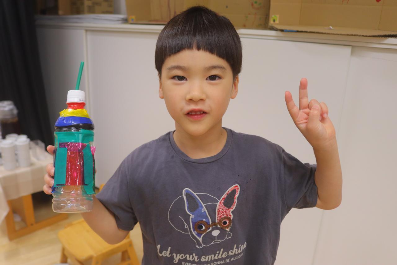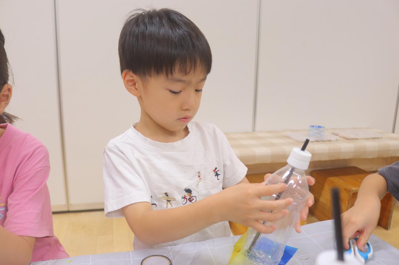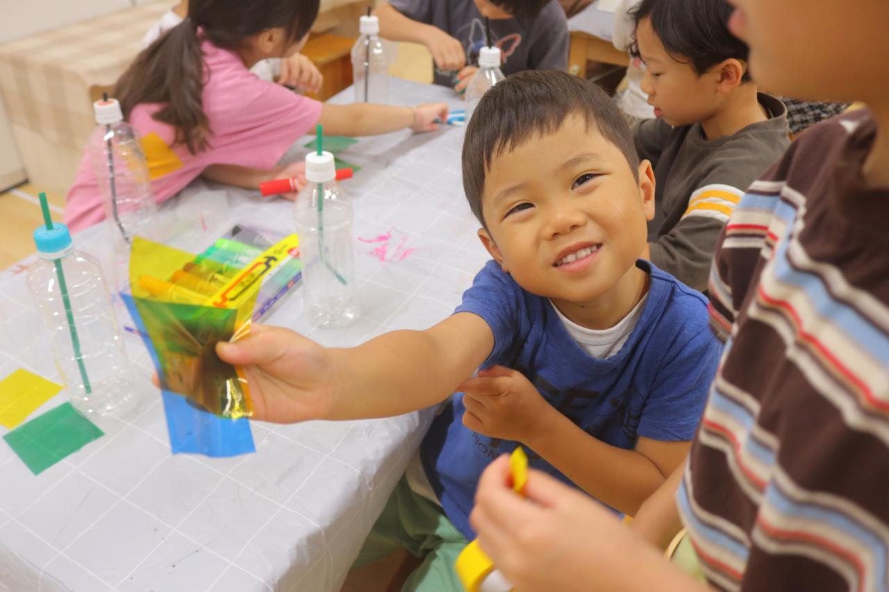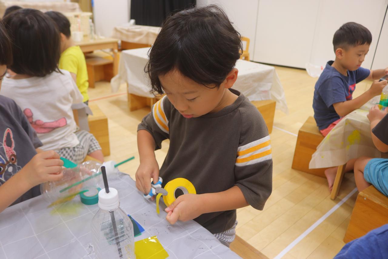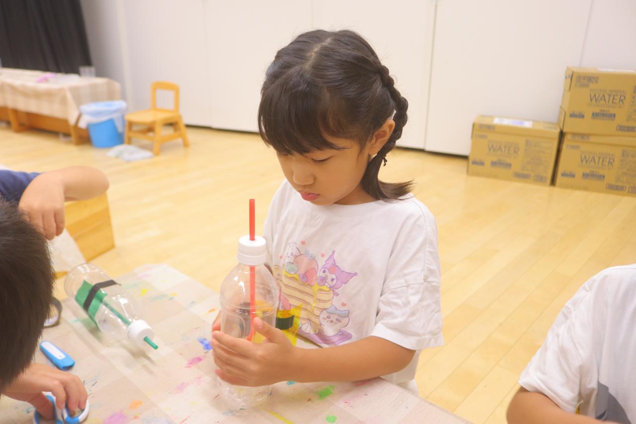 水鉄砲は好きな形のペットボトルを選んでそこにビニールテープを貼ったり、マジックペンで絵を描いたり、カラーセロハンを貼ったりして素敵に飾り付けしてもらいました☆