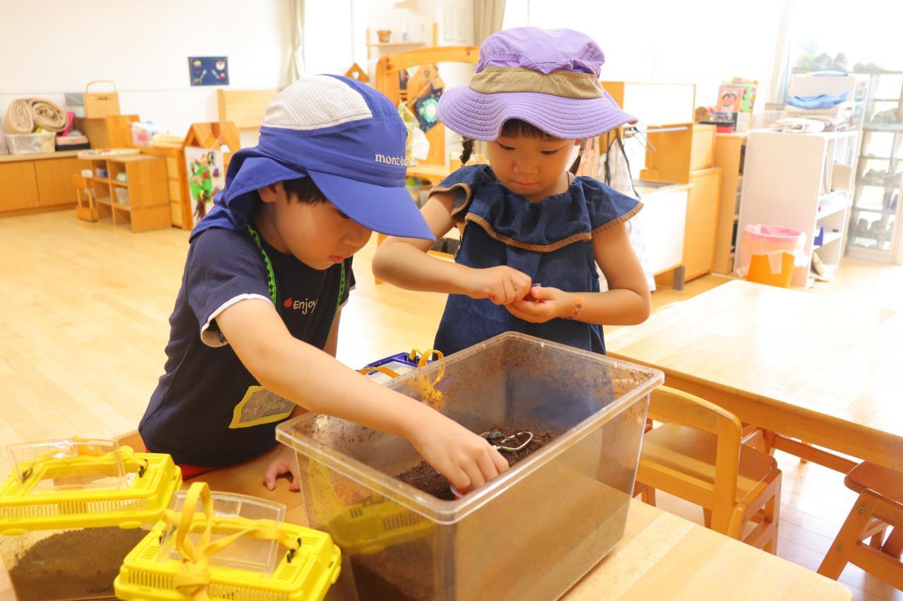 お外では、ヤモリを見つけたので、大切に育てるためにまずは虫かごのお掃除をしてから、葉っぱを入れてヤモリを入れて、ずっと持ち歩いて観察していましたよ~♪