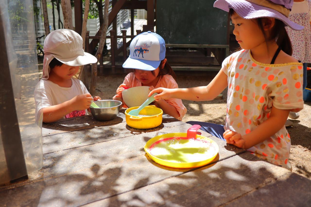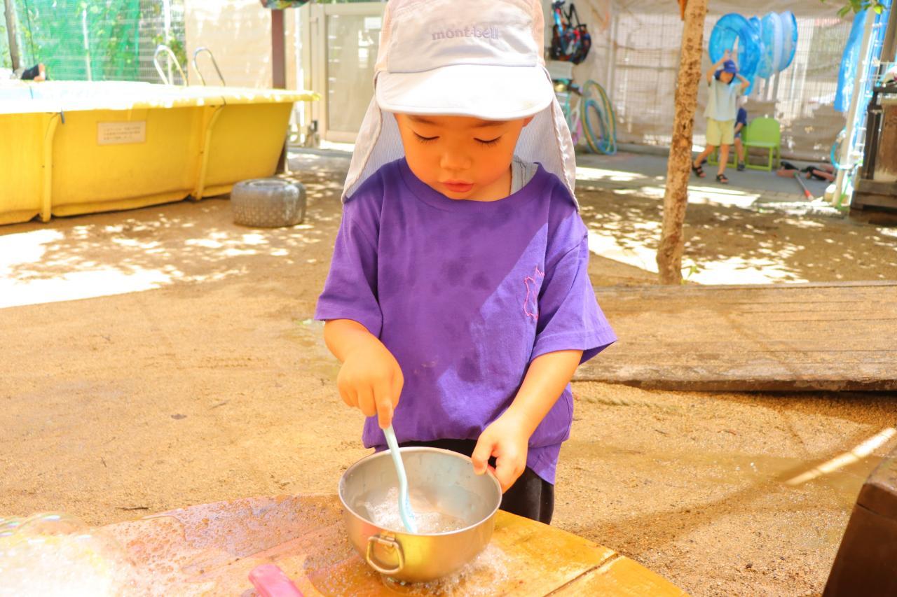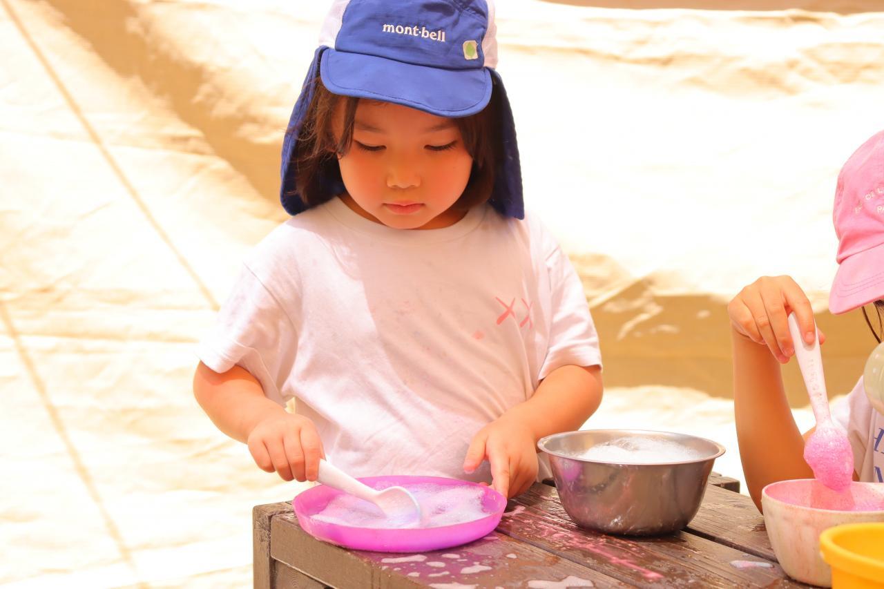 今日はお水遊びより、しゃぼん玉とチョークを混ぜ合わせて、様々な色のあわあわを作るのが流行っていたようで、あちらこちらでとっても綺麗なあわあわが出来上がっていましたよ~.。o○