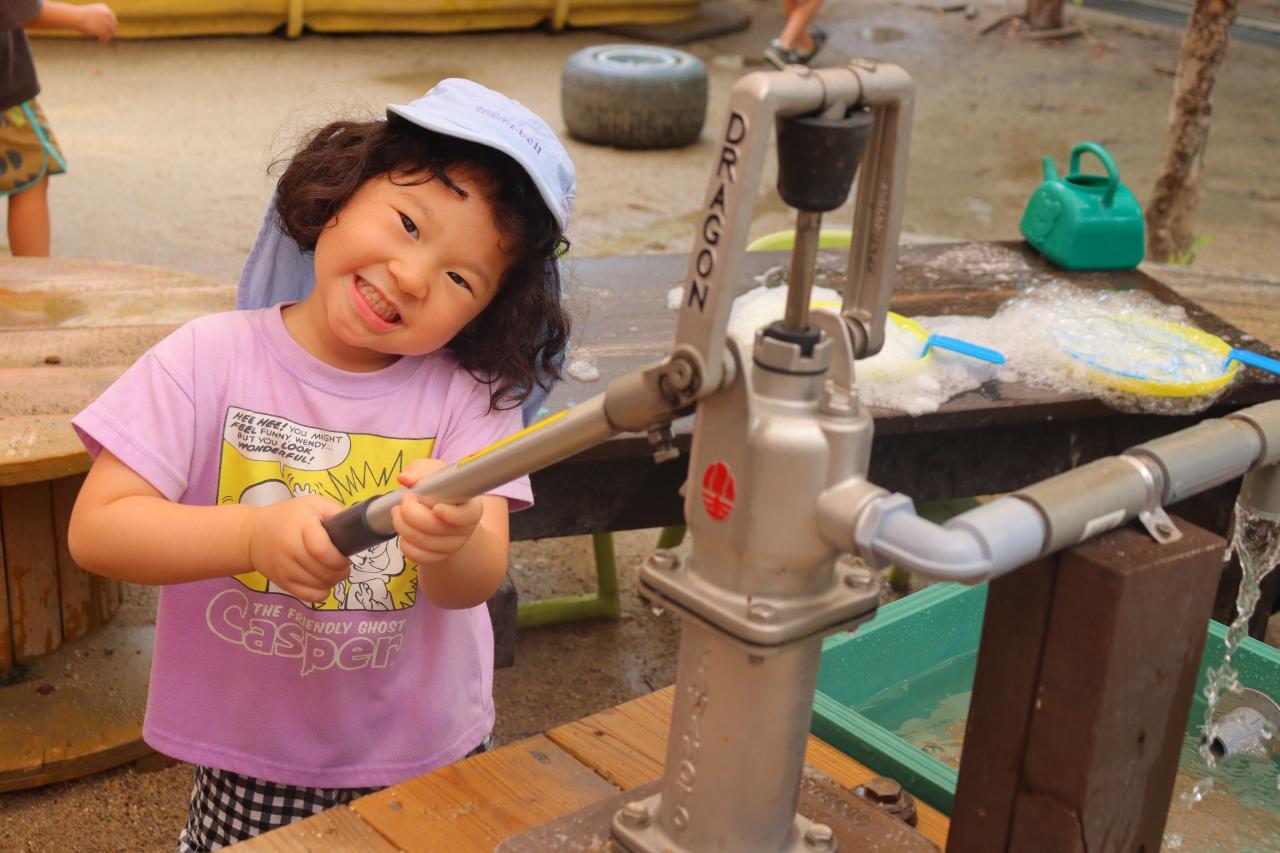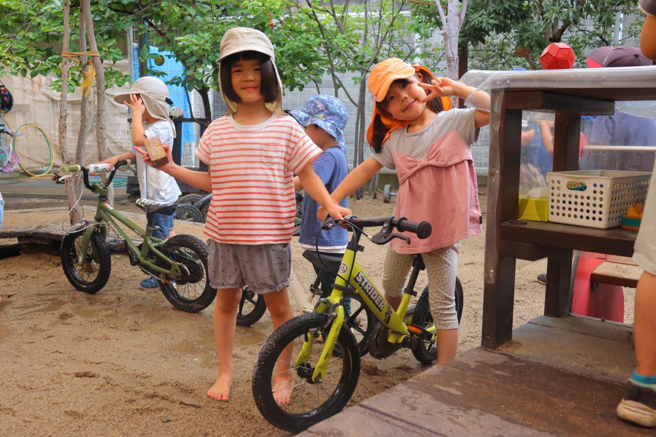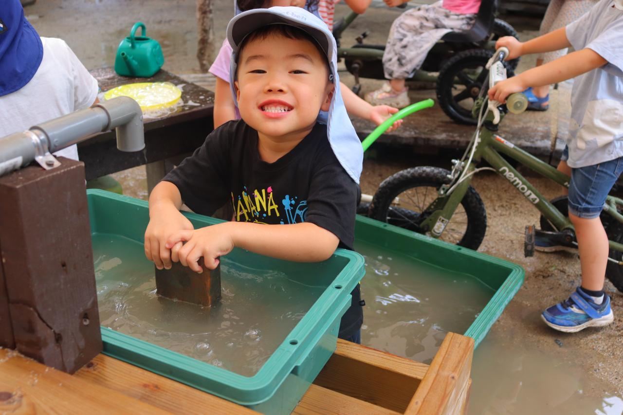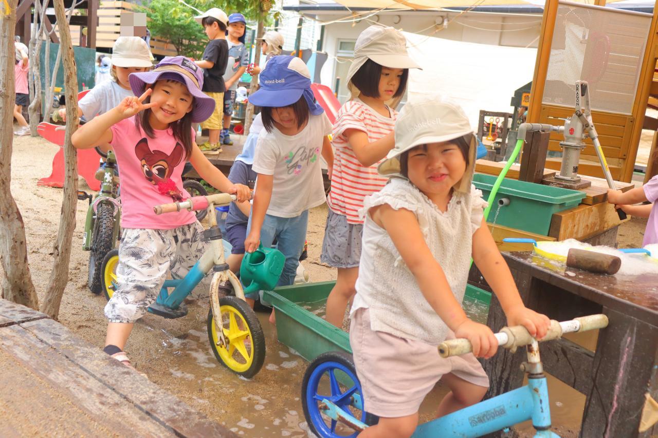 あわあわを作ったり、園庭に水たまりが出来ていたので自転車のタイヤ洗いをしたりしていましたよ💗