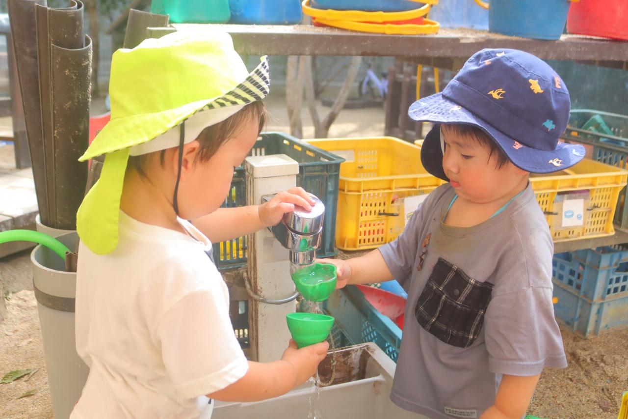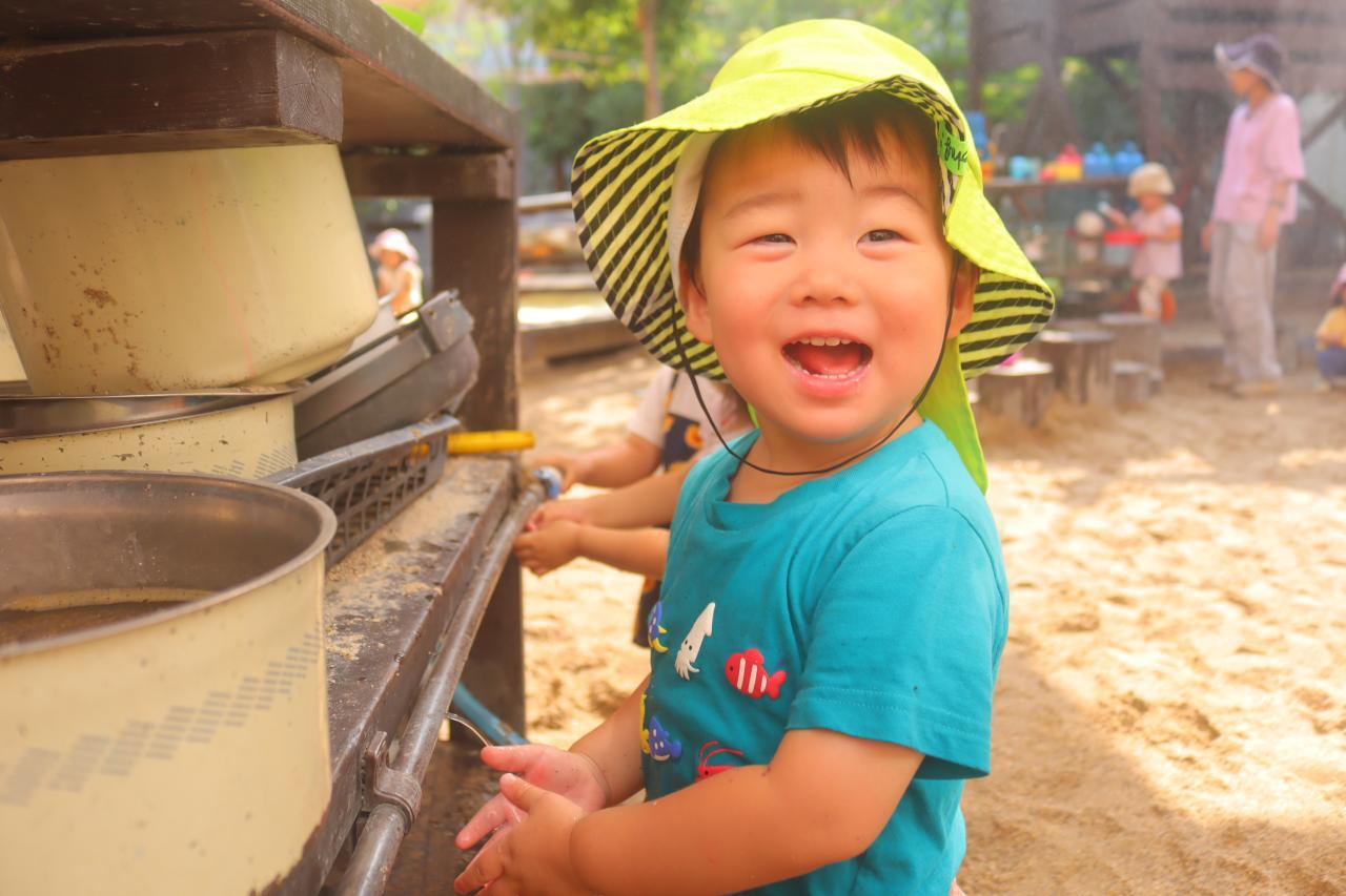 園庭で盛大に水遊びができるようになり、園庭では毎日のようにお水遊びを楽しむ姿が見られますよ😊
