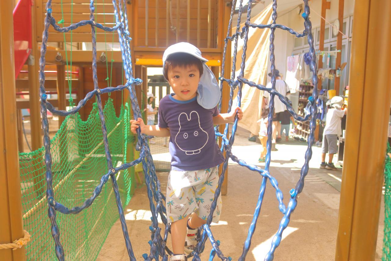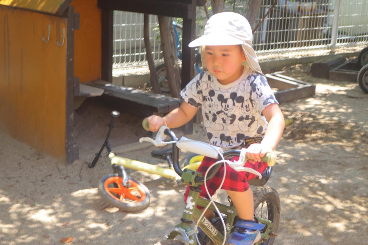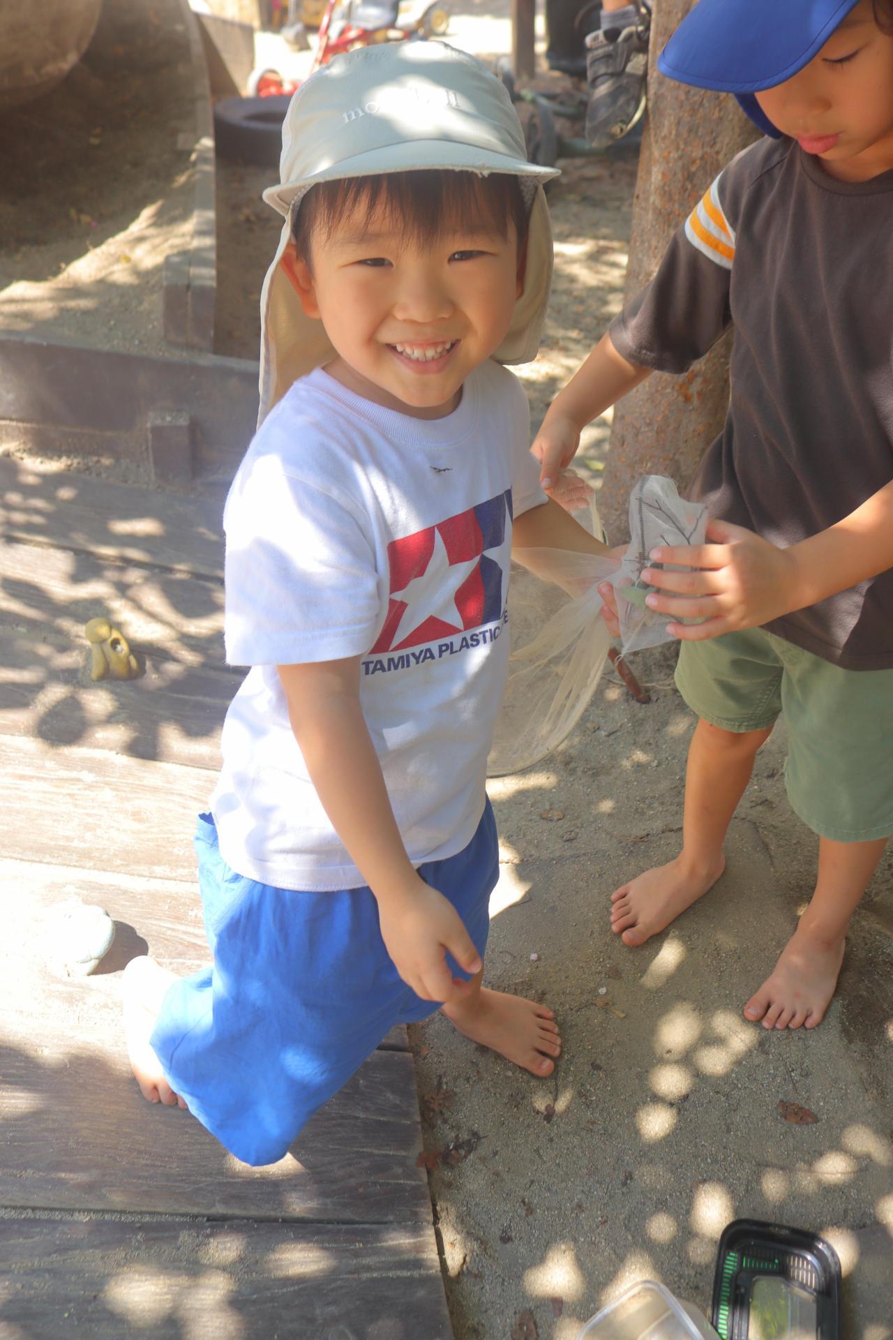 園庭遊びでは今日もたくさんのせみとりに夢中になっていたり、自転車やブランコと水分補給をしながら