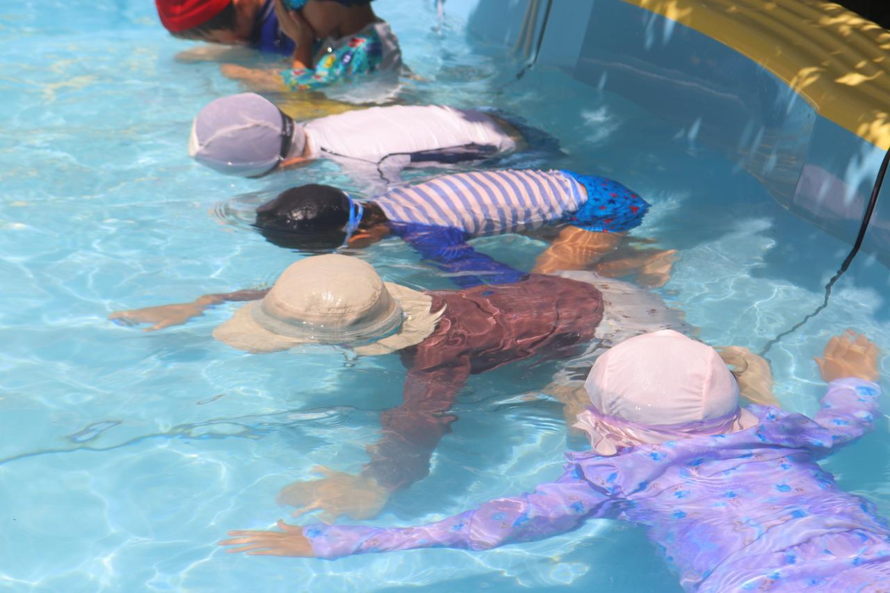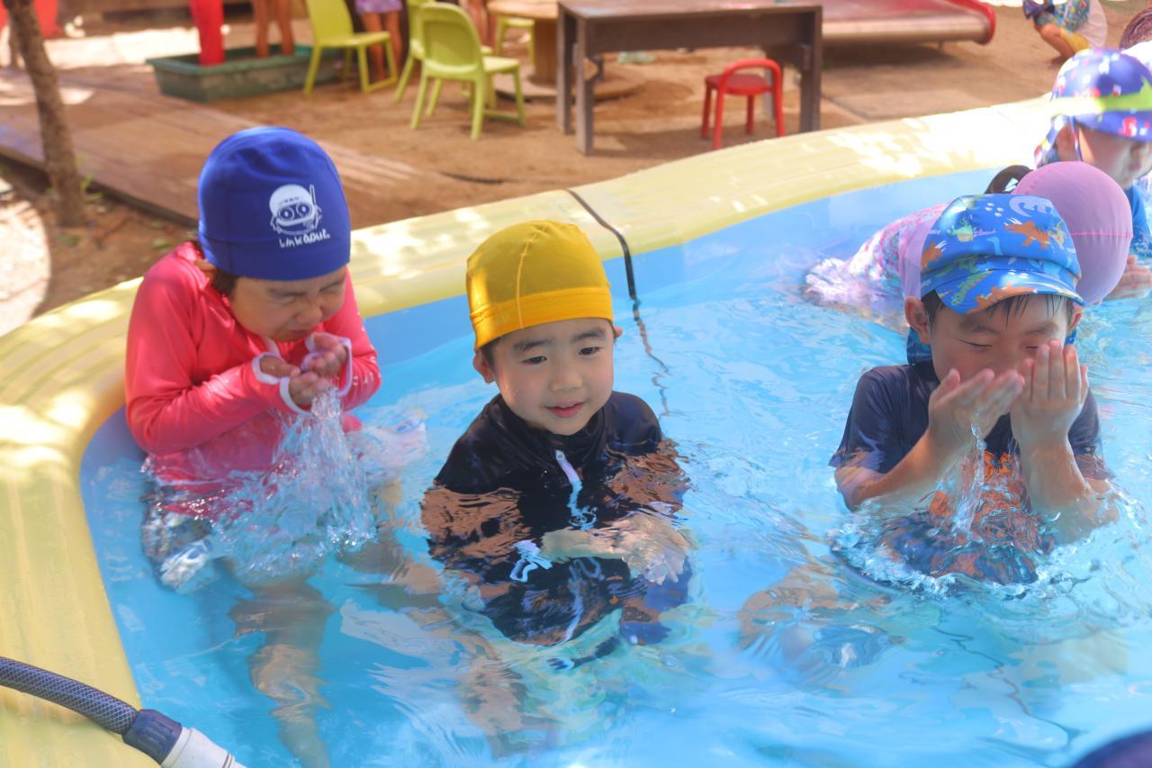 ざぶーんと潜ったり、手でお皿を作って顔を濡らしたりといろんな方法で挑戦していました