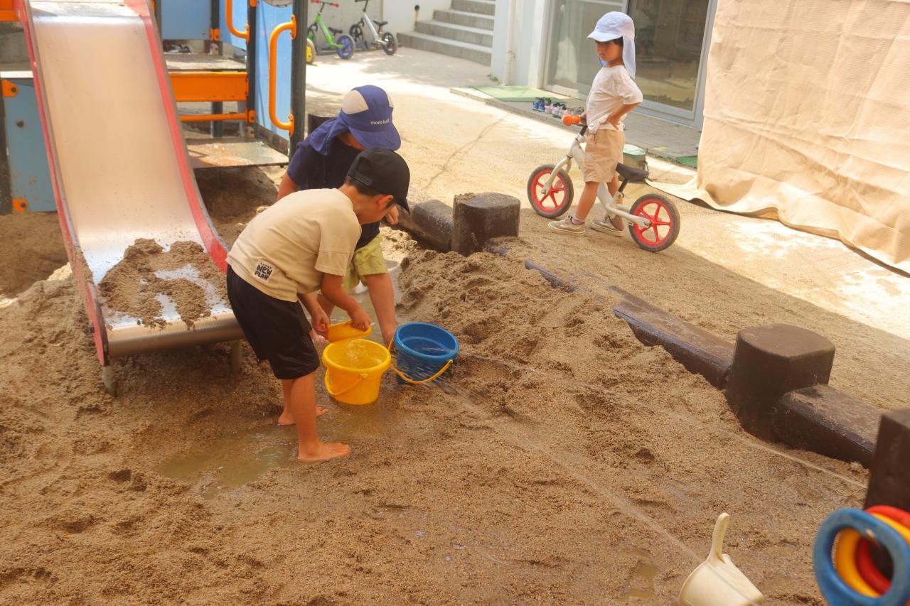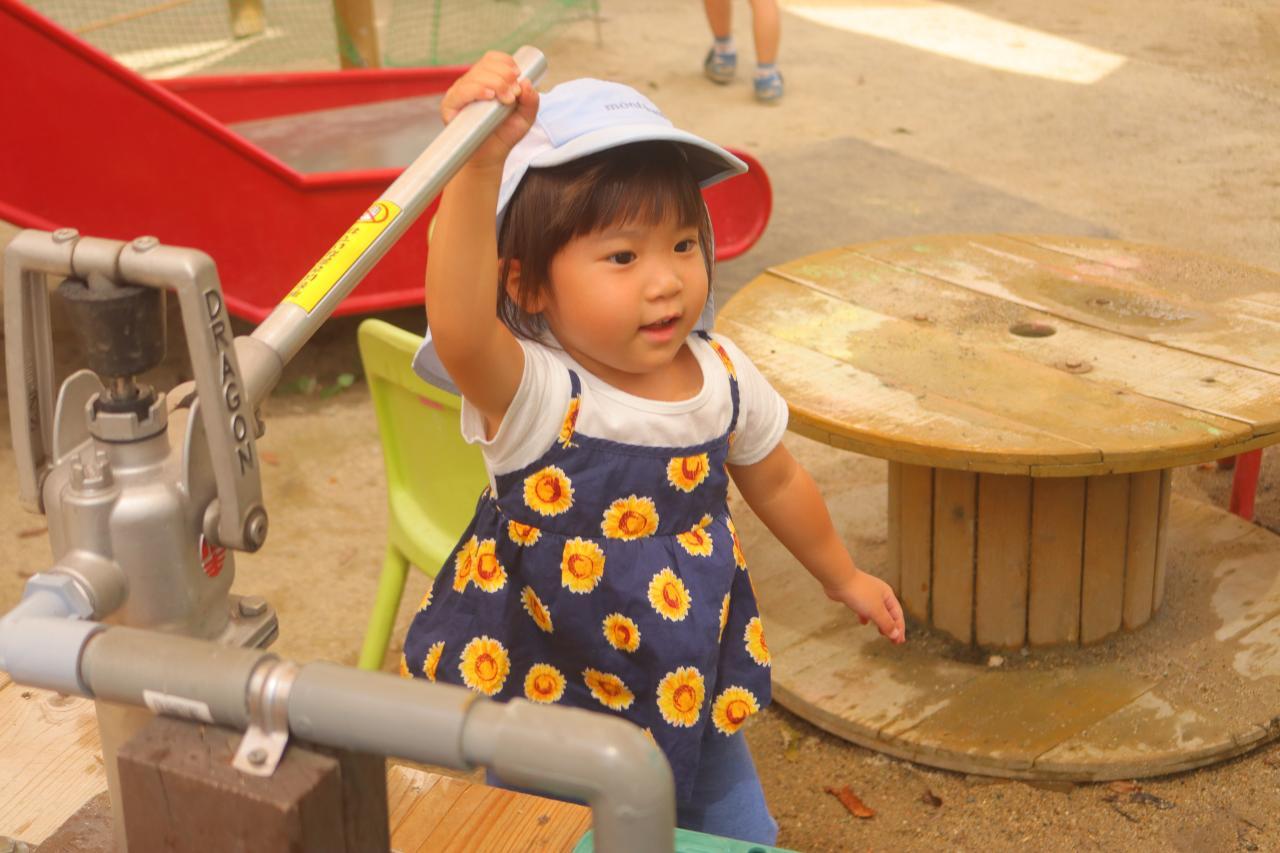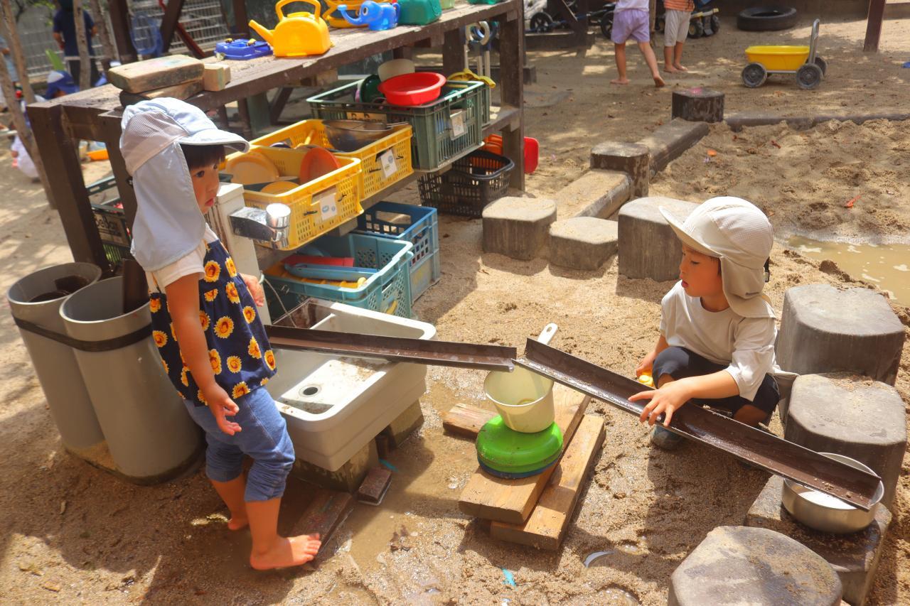 園庭遊びでは、玩具を繋げて水を流して盛り上がっていました♪