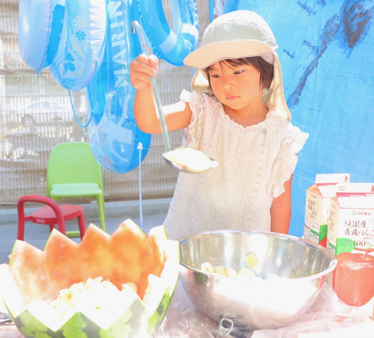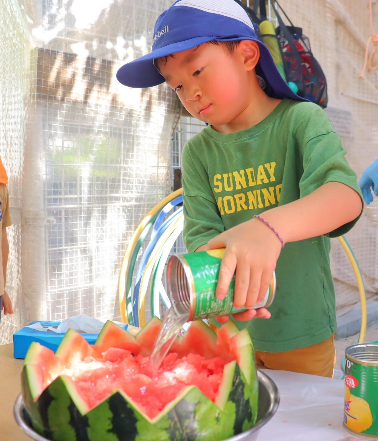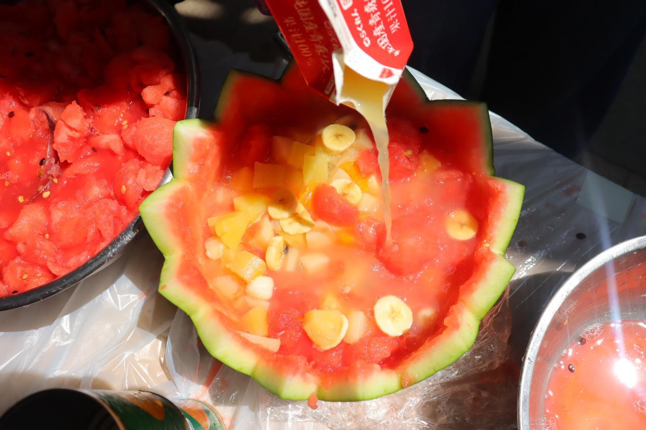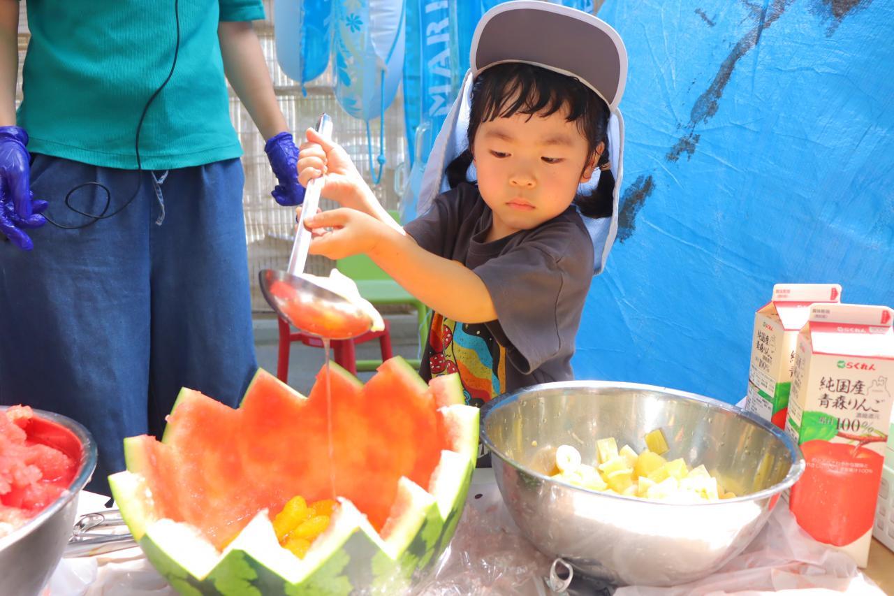 子どもたちには、スイカのくりぬき🍉、フルーツのカット、白玉団子作り、