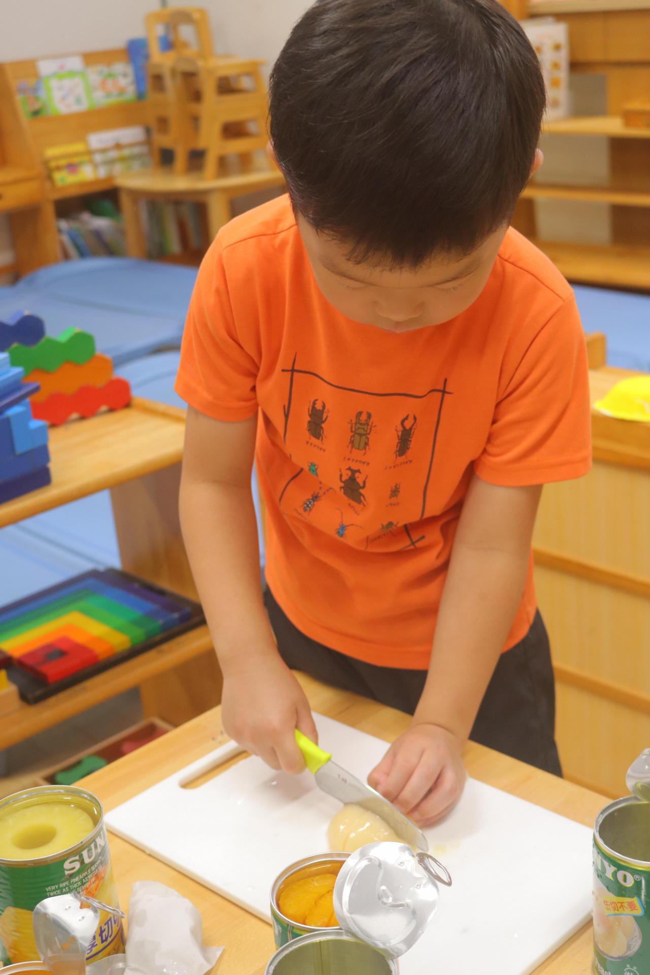 団子をどんどん丸めていったり、缶詰のフルーツやバナナを包丁を使ってカットしていきます!