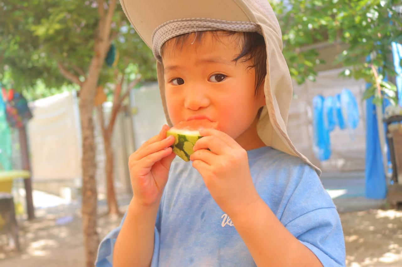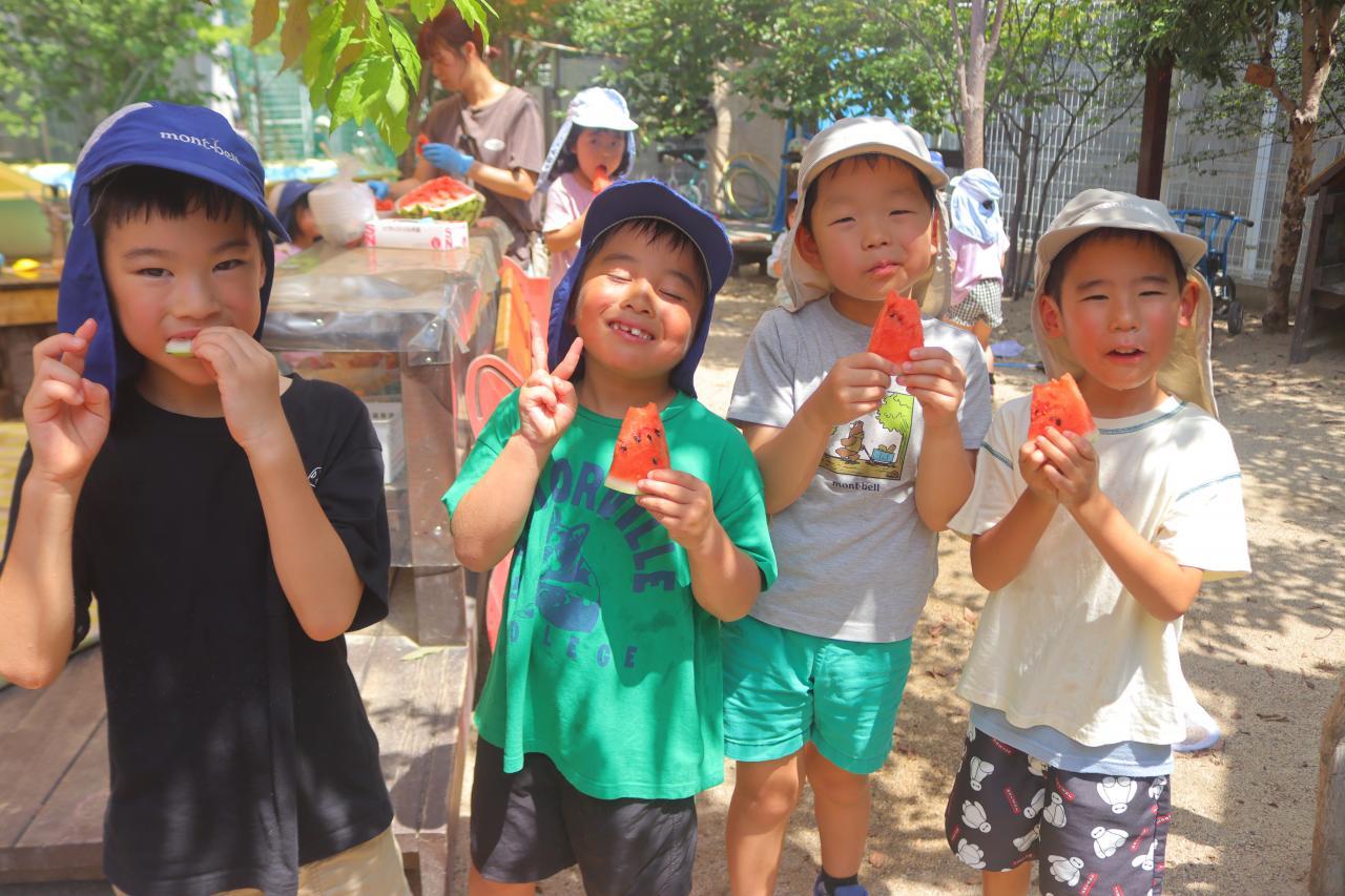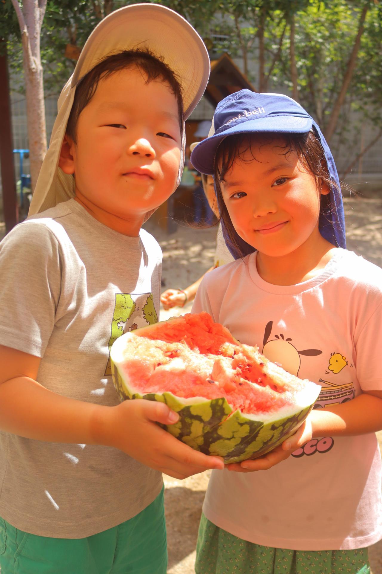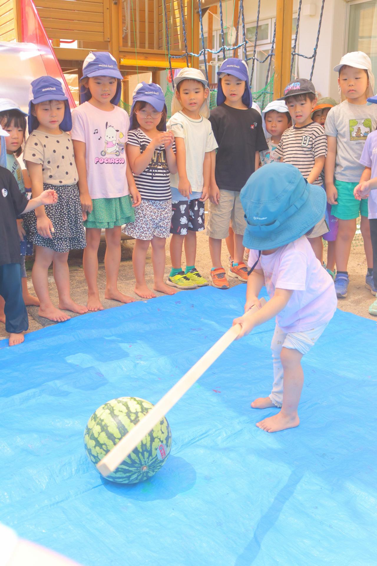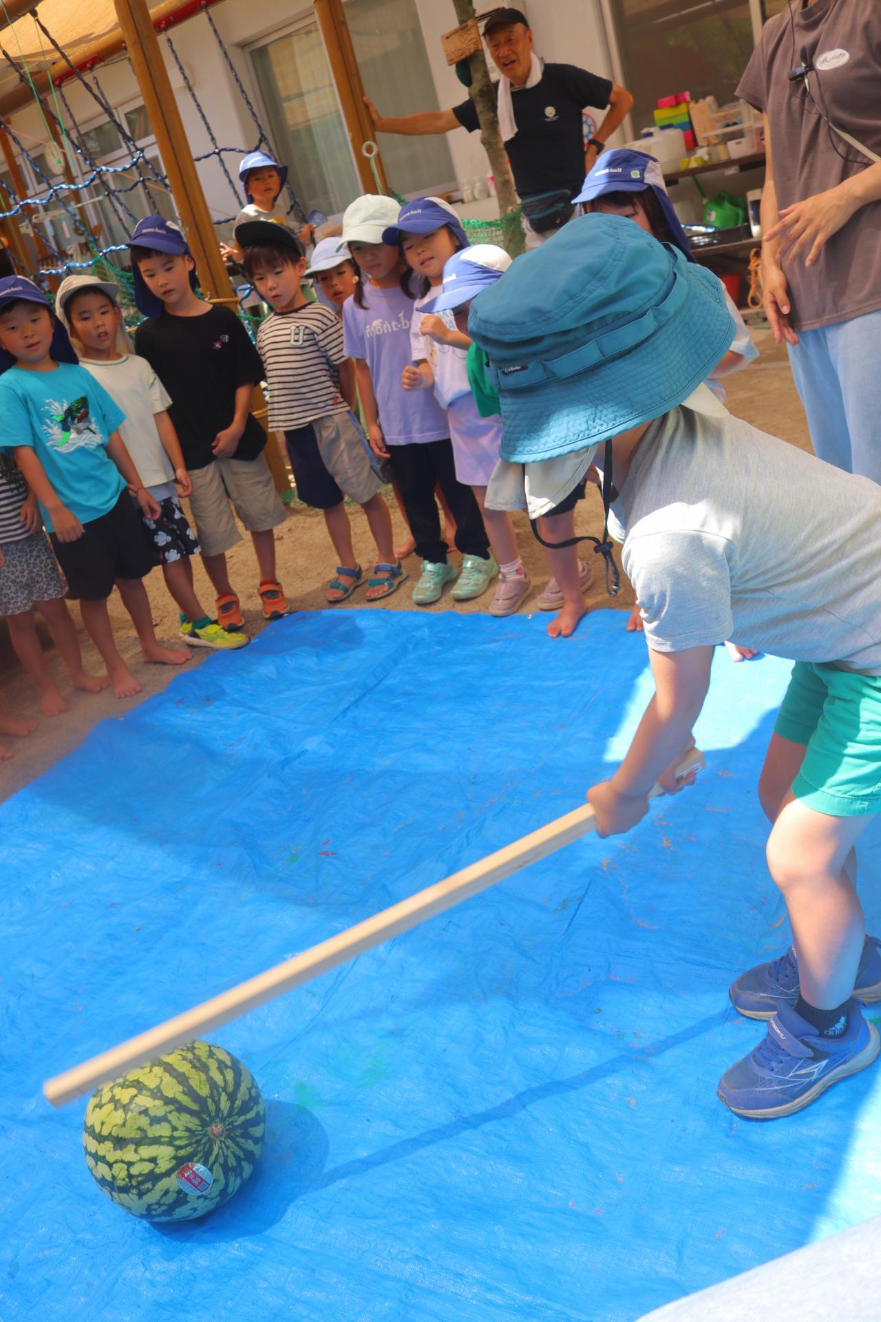園長先生が持ってきて下さったスイカでスイカ割りをしました🍉