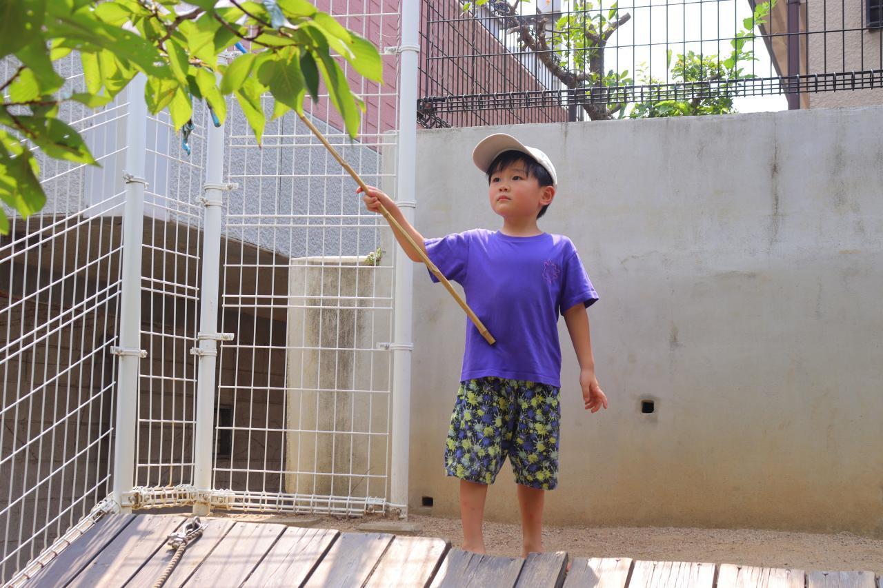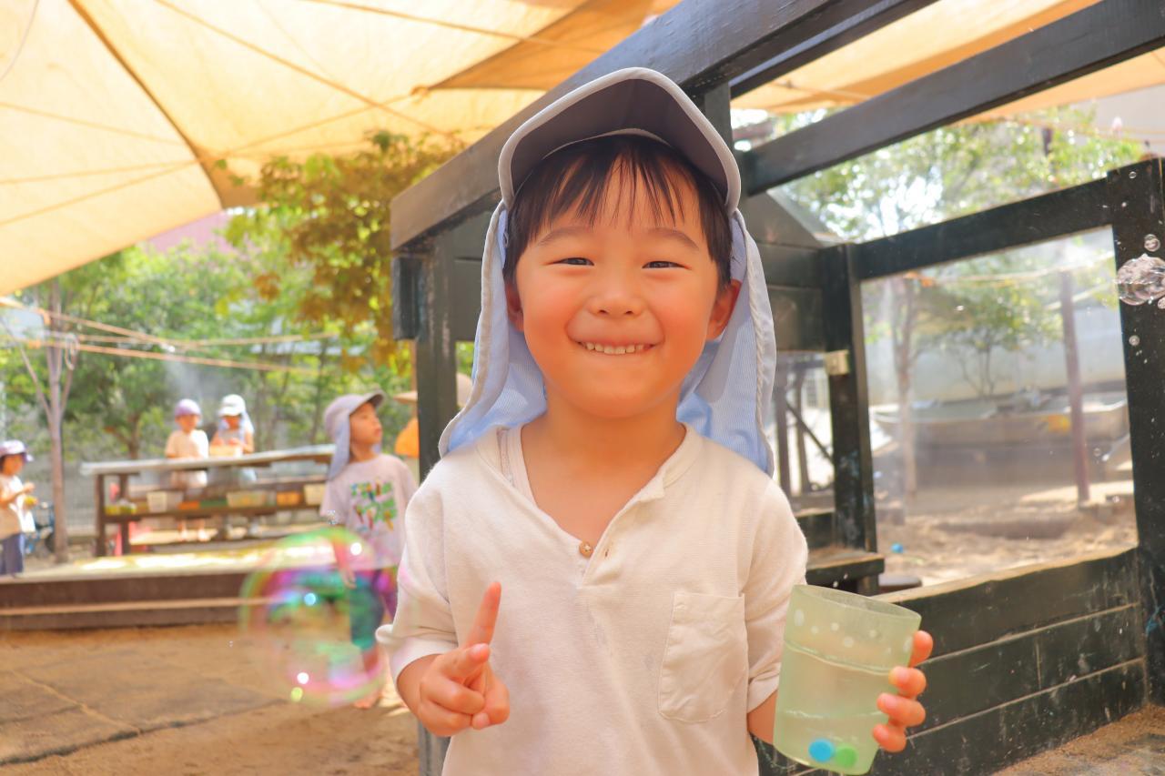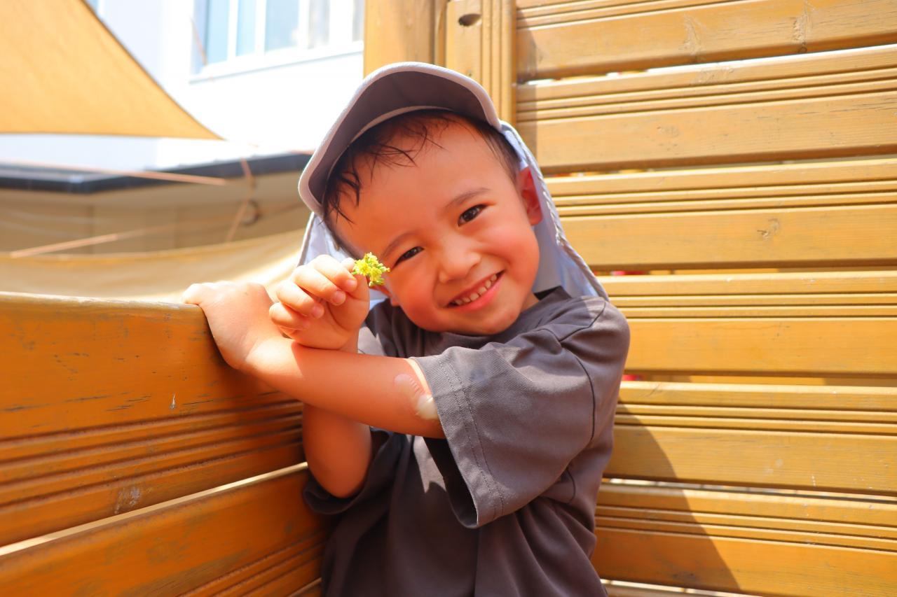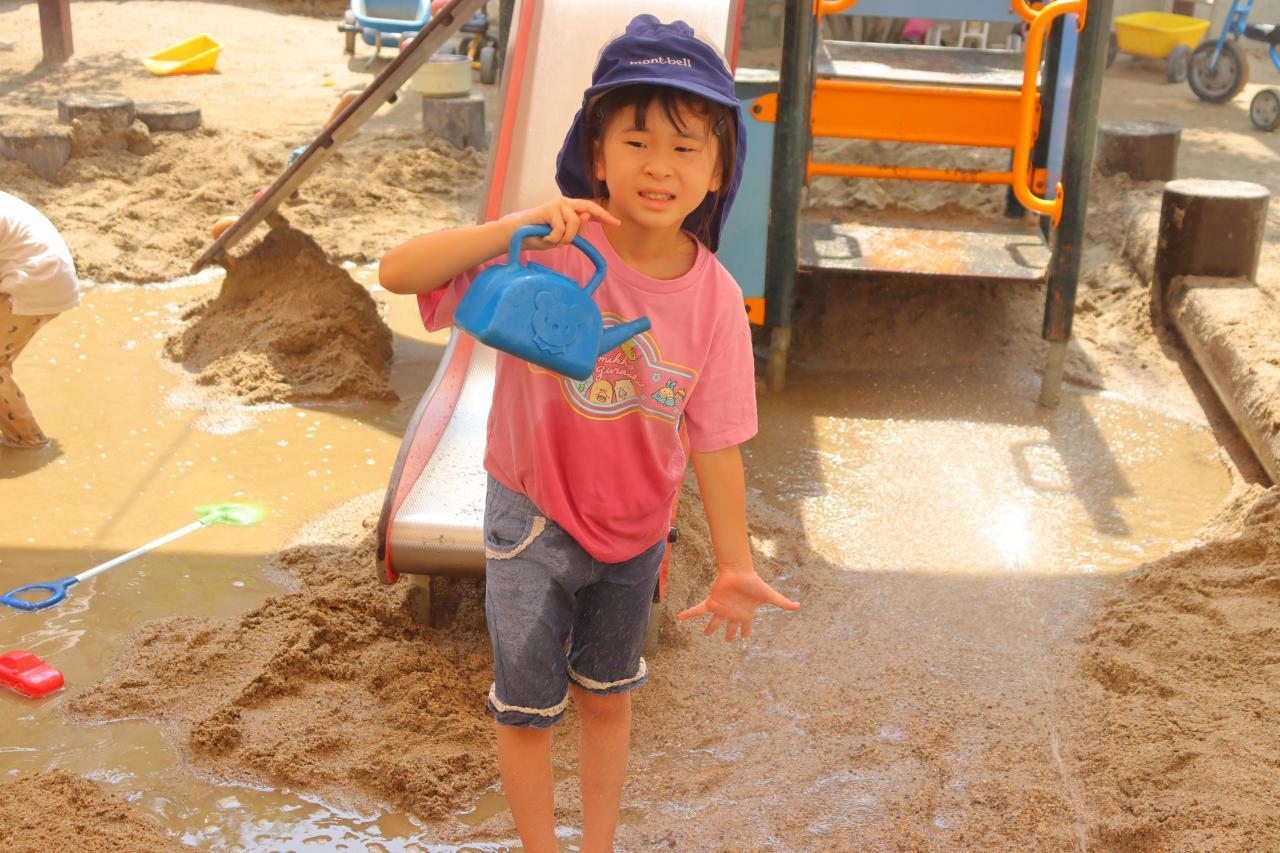 朝は少し雨がぱらついていましたが、園庭に出るころにはすっかりいいお天気で、お水遊びをしたり虫探しをしたりしてそれぞれ暑い中楽しんでいましたよ♪