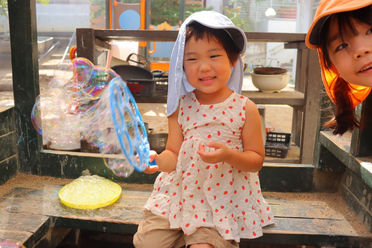 シャボン玉では、パタパタ~とたくさん飛ばしたり、チョークと組み合わせて混ぜたり、それぞれ遊んでいました.。o○